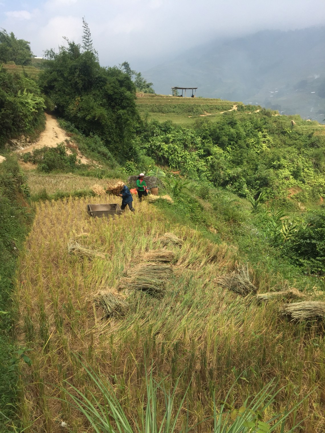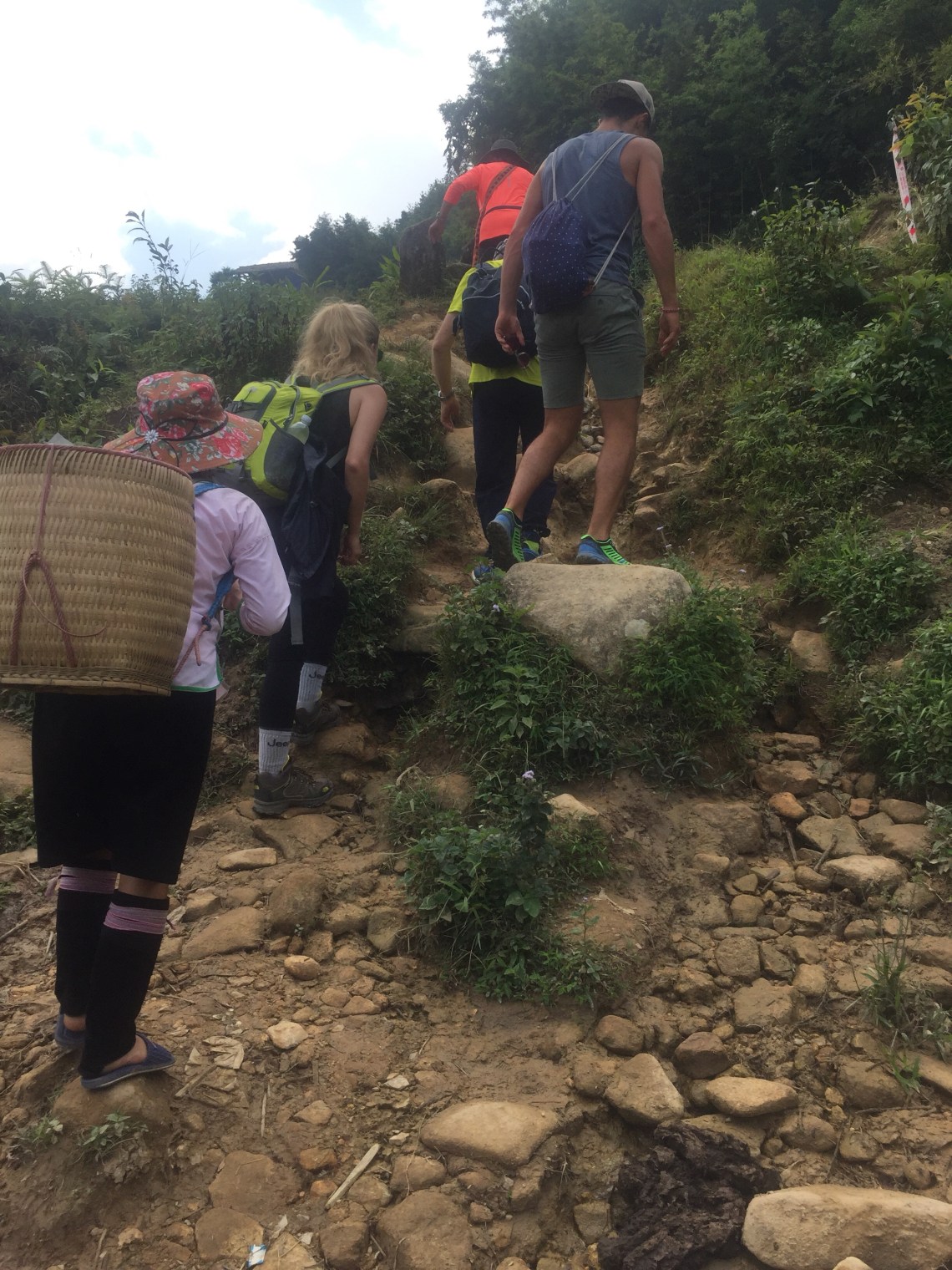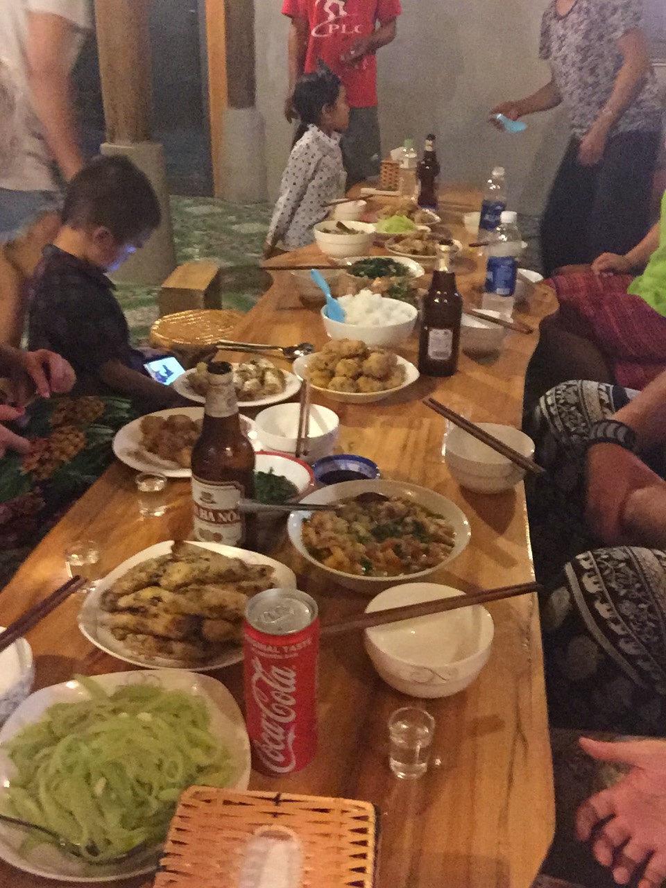 Wir sind nun 2 Franzosen, Suzie aus England und Dominik aus Südtirol. Gestern sind wir in unserem neuen Homestay angekommen, Sapa Orange Farm Stay. Eine ganz ganz liebe Familie, die uns sehr nett versorgt und jede Frage geduldig beantwortet 🙂 Da sie erst seit kurzem ihr Haus für Gäste geöffnet haben sind wir erst die zweite Gruppe, die sie bei sich wohnen lassen. Auf dem Dachboden sind neue Räume mit jeweils zwei Betten. Frühstück, Abendessen und Spieleabend findet im Wohnsaal und der Küche statt. Gestern Abend haben wir Uno gespielt und danach mit der kompletten Familie gemeinsam gegessen. Oma, Opa, Vater, Mutter und zwei Kinder und wir alle an einem Tisch. Das Essen war wieder mal sehr sehr lecker und diesmal gab es auch selbstgepflückten Morning Glory. Alle 5 Minuten wurde ein hausgemachter Reiswein getrunken, was sehr zur lustigen Stimmung beigetragen hat. Happy Water heißt er hier 🙂 Alle Zutaten des Abendessens waren vom Hof und aus dem Garten der Familie.