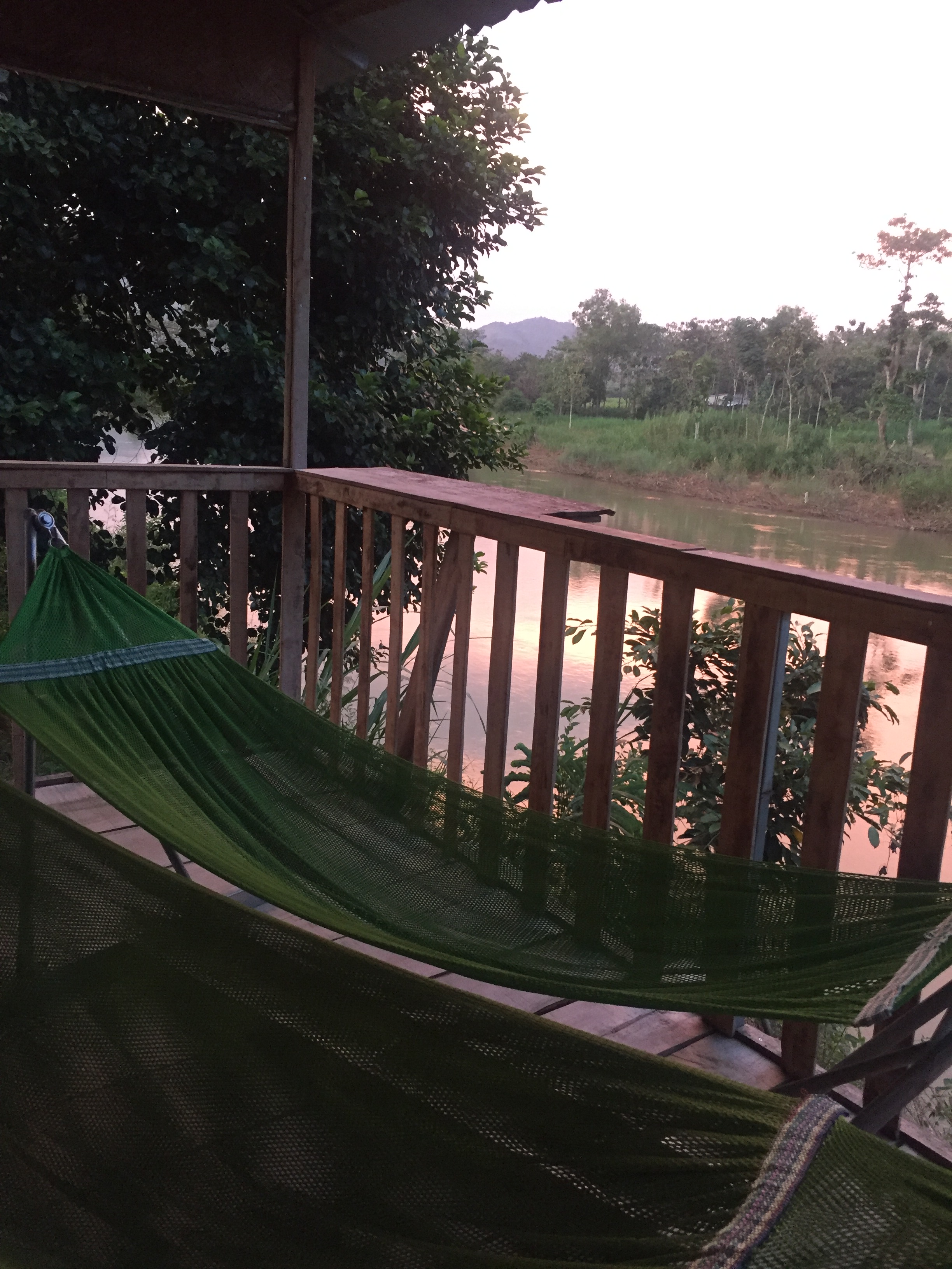 Wir haben einen Holz-Bungalow mit Terasse und Hängematte direkt am Fluss in einem schönen kleinen Garten. Die Anlage heißt Spirit Garden und ist direkt in der Nähe des Eingangs zum Nationalpark. Der Besitzer ist sehr lustig und hat uns die Wege im Nationalpark erklärt. Beim Abendessen haben seine kleinen Hunde um uns rum gespielt und es hat gewittert und geregnet. Ein richtiges Tropengewitter 🙂 Das Essen wird von der Familie zubereitet. Wir fühlen uns sehr wohl und hoffen dass heute Nacht das Moskitonetz hält. Die gibt es hier am Fluss nämlich zu tausenden.