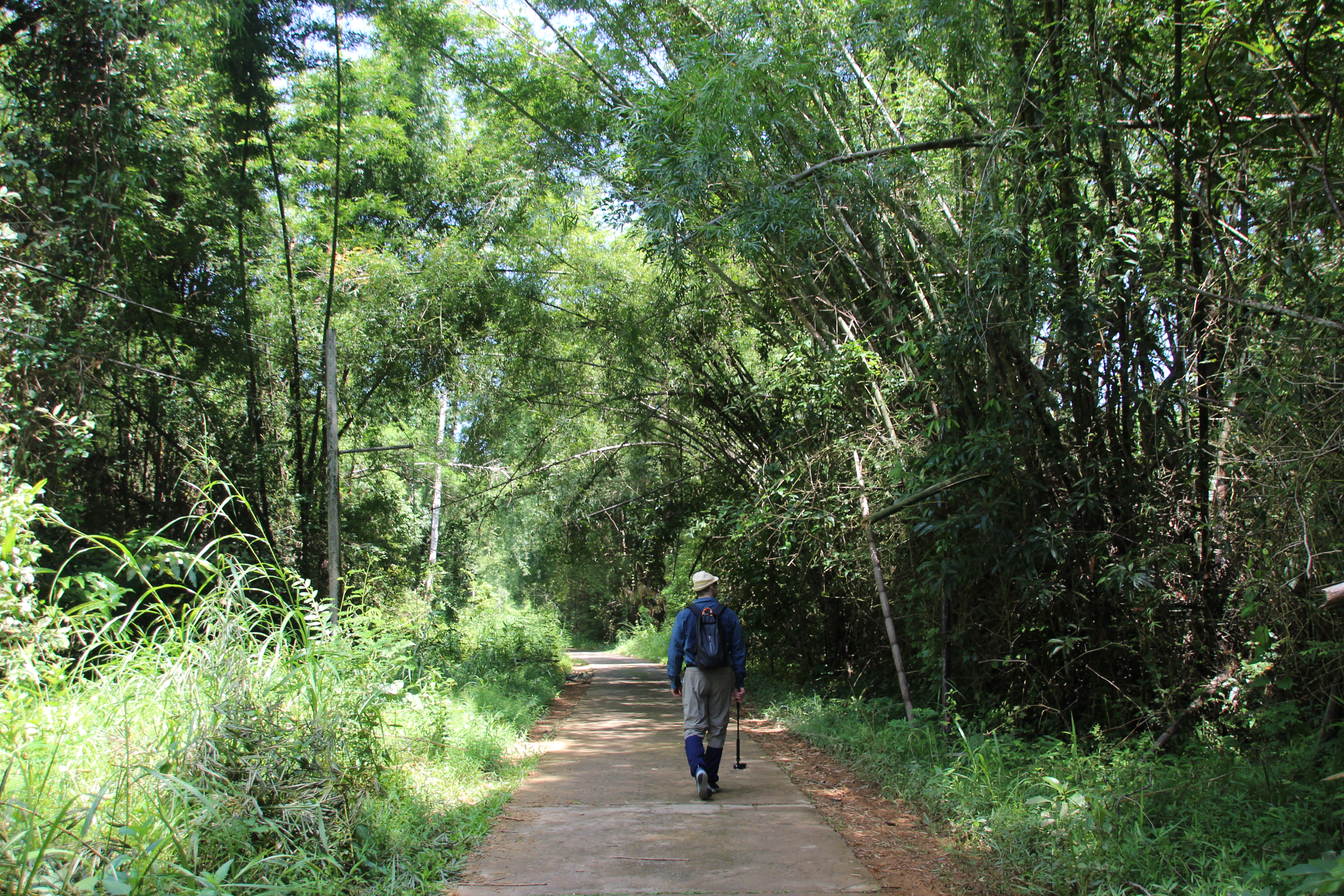 Von Quoc haben wir auch die Leeches Socken bekommen. Das sind Socken die vor Blutegeln schützen wenn man im Nationalpark rumläuft. Erst haben wir das belächelt… Am ersten Tag sind wir mit den Fahrrädern los zum Park. Dort muss man mit der Fähre (60000 Dong, ca 2 Euro) den Fluss überqueren und ist dann direkt im Park. Dort gibt es verschiedene Wanderwege und Routen und wir haben uns erstmal für die kleine ca 6 Km Route entschieden. Dort angekommen haben wir uns an den Wegrand gestellt und die Socken angezogen. Wir hatten schon direkt zwei kleine Blutegel an den Schuhen. Da haben wir dann auch gemerkt wie nützlich die Socken sind. Diese zieht man über die eigenen Socken und die Hose und dann die Schuhe drüber. Hat super funktioniert denn wir hatten auf dem Weg einige Blutegel die sich den Weg in die Schuhe suchen wollten. Der Park ist schön, man läuft die ganze Zeit durch den Urwald und hört die Tiere in den Bäumen. Wir haben Affen, Vögel, Frösche und Schmetterlinge gesehen. Einmal mussten wir auch einen Fluss überqueren was bedeutet hat dass wir durch den Fluss laufen mussten, inklusive nasser Schuhe 🙂 sind aber schnell wieder getrocknet.