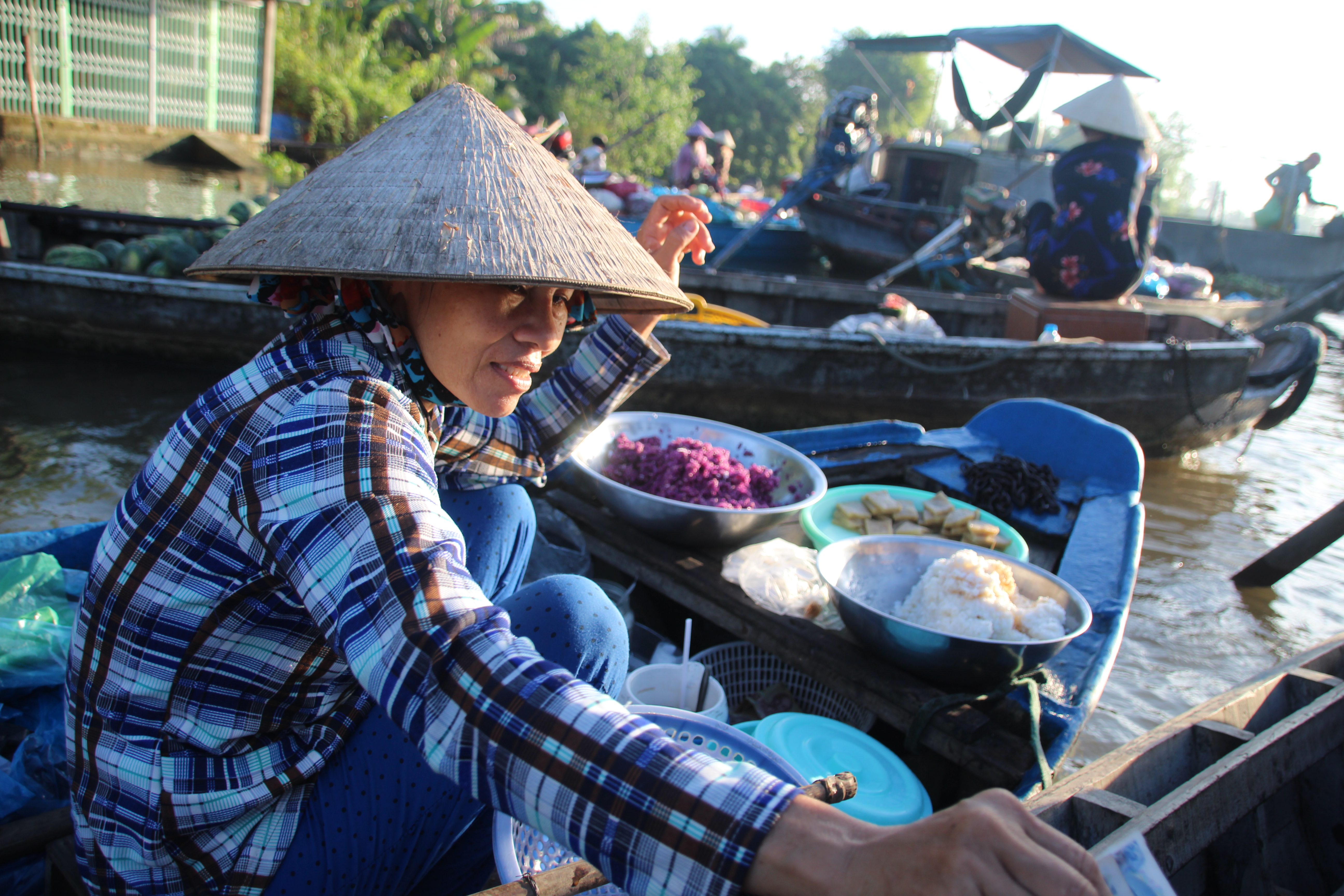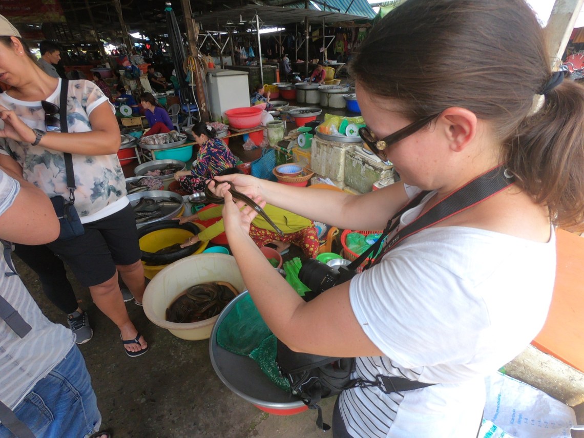 Heute morgen um 5:45 Uhr (!) ging unsere Tour mit Linh los zum schwimmenden Markt. Wir sind mit dem Roller zum Hafen gefahren und dort in ein kleines Boot gestiegen. Linhs Tour führt nicht zum großen schwimmenden Markt sondern zu einem kleinen Markt, den die Einheimischen benutzen. Sie hat uns erzählt dass der große schwimmende Markt sehr touristisch ist und die Händler dort lieber an Touristen verkaufen als an die Einheimischen, weil sie dort andere Preise bekommen. Der Markt ist sehr überlaufen und man sieht nicht viel. Auf unserem kleinen Markt gab es nur uns und noch ein anderes Touristenboot. Es war wirklich toll, es gab Boote die nur Wassermelonen verkauft haben oder Boote mit verschiedenen Früchten und Obst. Dann gab es noch ein Bar-Boot von dem wir Kaffee bekommen haben 🙂 Es war schön dieses authentische Treiben auf dem Fluss sehen zu können. Danach gab es eine Frühstückssuppe in einem kleinen Restaurant und eine Tour über einen kleinen lokalen Markt. Der Markt war nicht ´s für schwache Nerven, denn dort gab es so ziemlich alles zu kaufen was hier in Vietnam gegessen wird und alles noch lebendig… Wir mussten versprechen nicht unser Gesicht zu verziehen, damit die Händler nicht beleidigt werden. Man ist dort keine Touristen gewohnt und für die Einheimischen ist das alles normal. Es gab dort Fisch, Aale, Frösche, Enten, Schlangen, aber auch alle Sorten Gemüse und Obst. Der Ausflug mit Linh war lustig und lehrreich, denn sie hat alles erklärt und wir durften alles probieren. Jetzt weiß ich auch wie Acerola schmeckt 🙂 Man muss dort einfach hinnehmen, dass es eine andere Kultur ist und einfach nur zuschauen ohne zu bewerten. Schließlich ist das das ganz normale Leben hier.