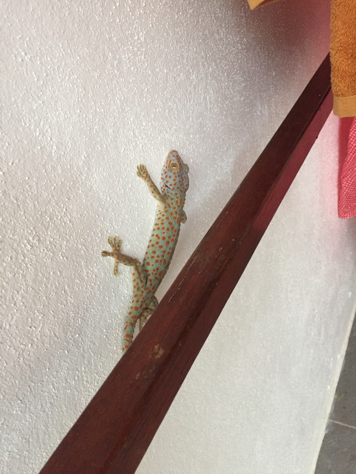 Ach ja, einen Mitbewohner hatten wir heute auch. Einen ca 20 cm großen hellblauen Gekko mit orangenen Punkten 🙂 sehr süß 🙂