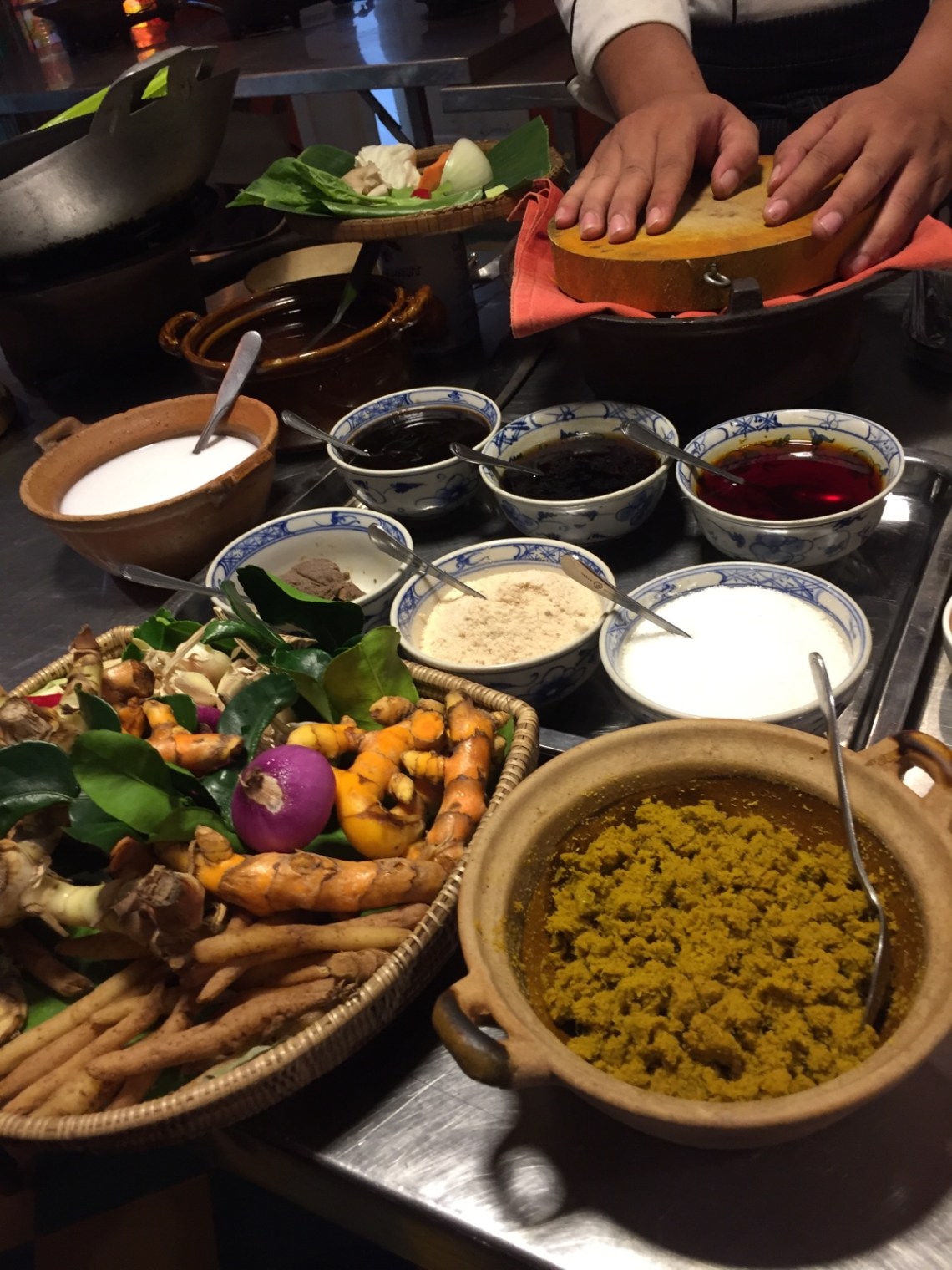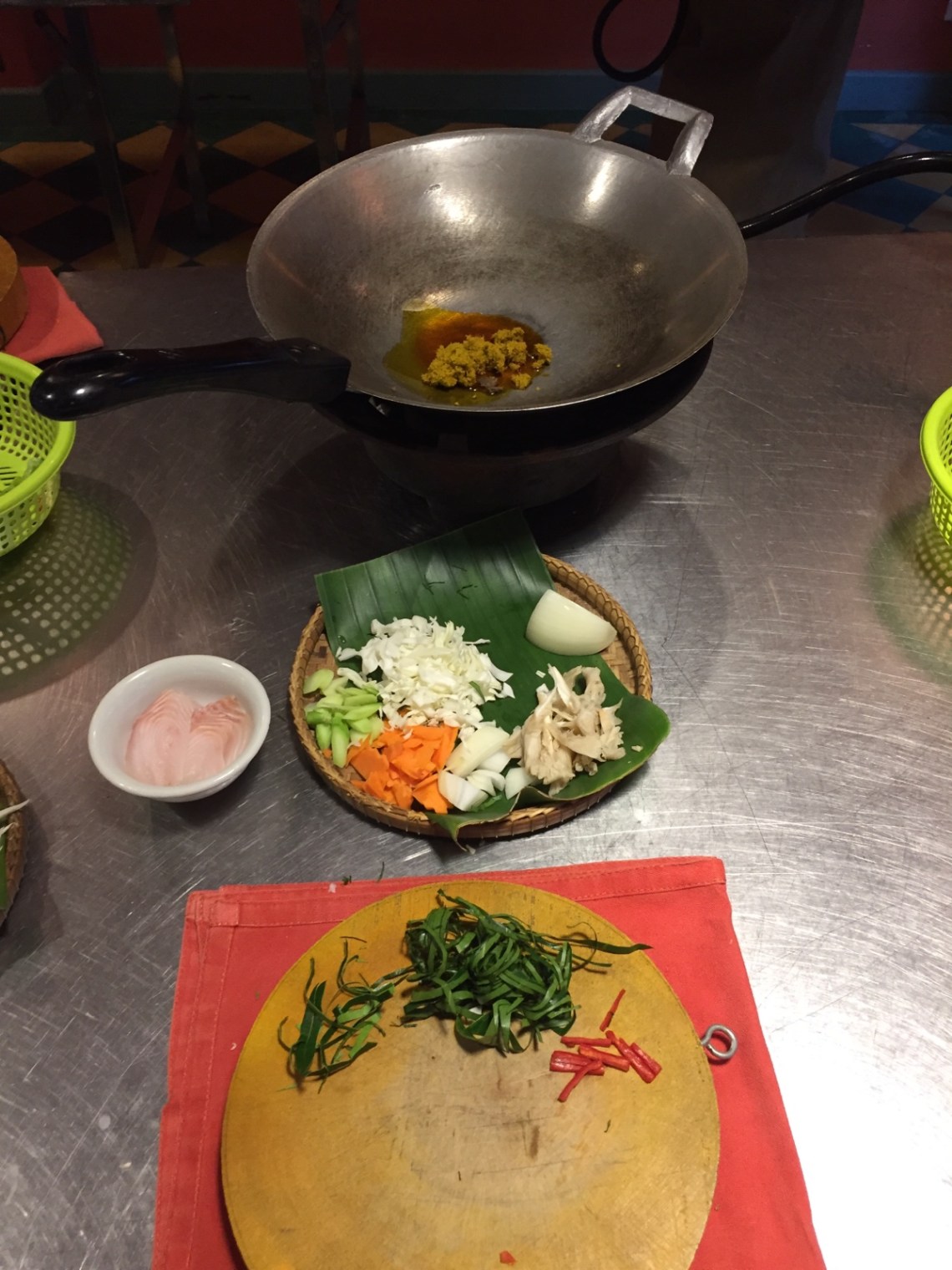 Das zweite Gericht war das Nationalgericht Amok mit Fisch. Wird ähnlich wie ein Curry zubereitet und enthält Fisch, Amokpaste, Chilliöl, Karotten, Grünkohlwurzel, Austernpilze, Bananenblätter, Zwiebeln, Kokosmilch und Gemüsefond. Das wird dann eingekocht und in ein Bananenblatt gefüllt.