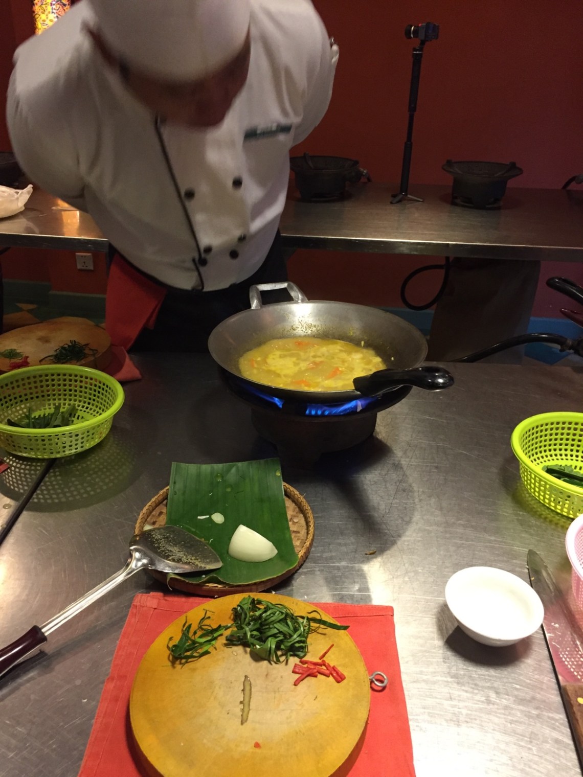 Wir haben einen Kochkurs bei Champey Cooking Class gebucht. Der Kochkurs startet mit einem Besuch auf dem Markt. Der Koch Orn hat uns die verschiedenen Gemüsesorten und Kräuter gezeigt die wir verarbeiten werden und wir durften auch einen Nachtisch aus Reispudding, Kokosmilch und braunem Zucker probieren. Außerdem frittierte Krebse, aber da hab ich ausgesetzt.