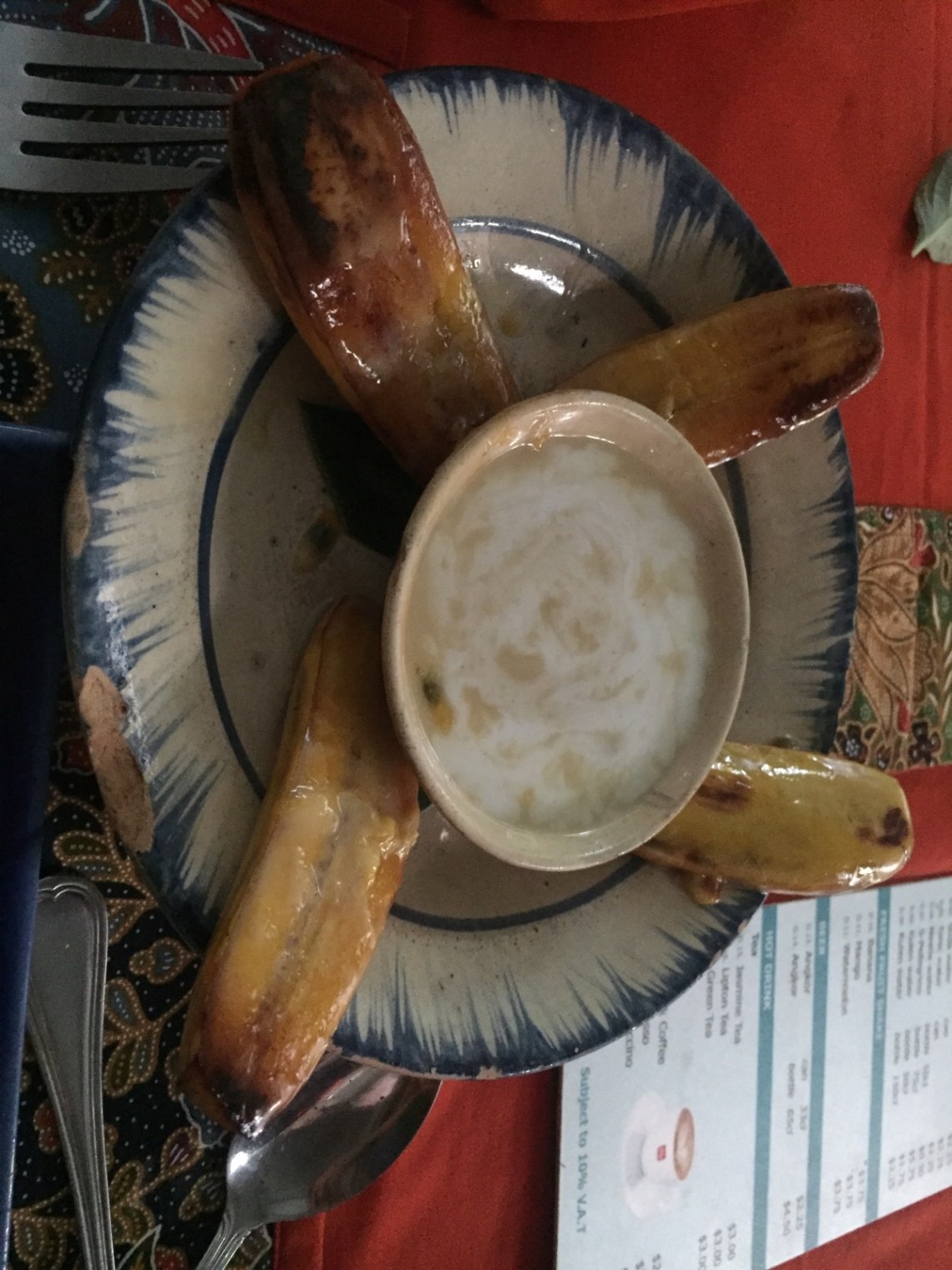 Als Dessert gab es Bananen a la Chef 🙂 In Margarine gebratene Bananen mit Passionsfruchtgelee und Kokosmilch. Yummy 🙂