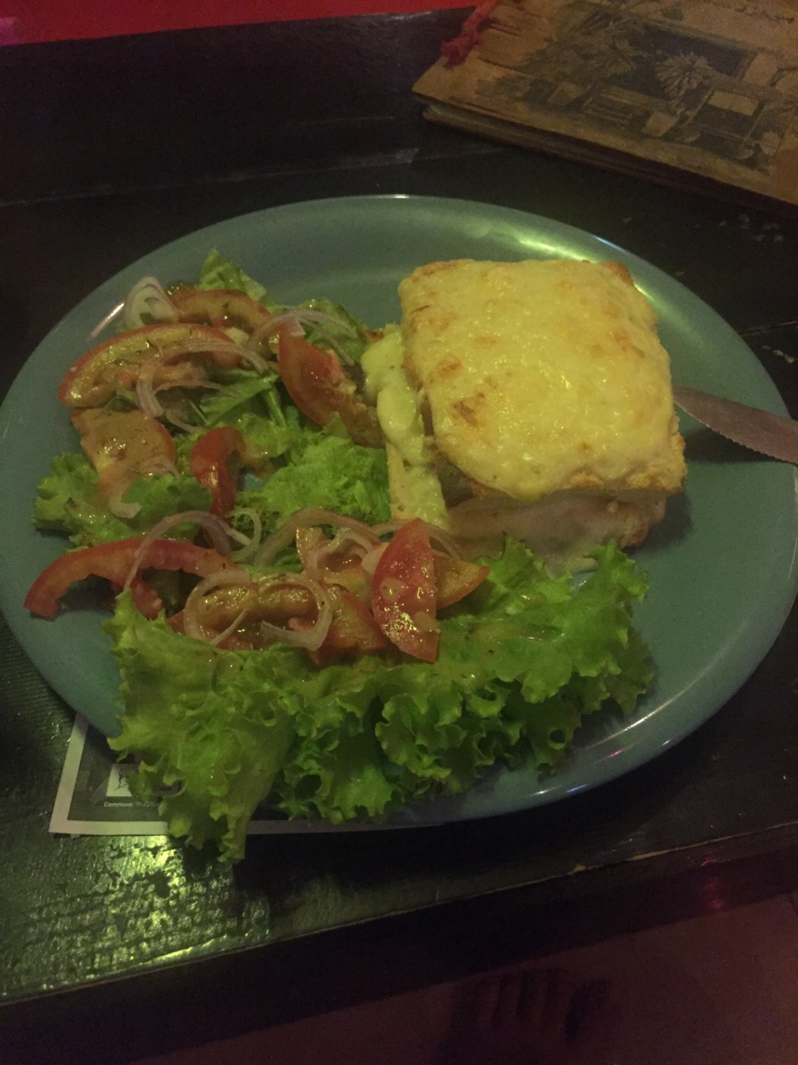 Ich habe dann meinen Lonely Planet eingepackt und habe mich auf den Weg zum Choc l’art Cafe gemacht. Ein Café dass für seine Kuchen und seine tolle Bilderausstellung bekannt ist. Leider war die Hochzeit genau in der gleichen Straße und deswegen war es sehr laut dort. Auf dem Weg zu dem Café musste ich durch die Straße in der das Hochzeitszelt aufgestellt war. Es hat die komplette Straße eingenommen. Ich wollte erst nicht vorbei laufen aber ein Mann der gerade die Räucherstäbchen geliefert hat meinte ich kann da durchgehen. Und schon stand ich mitten im Zelt zwischen den Stühlen und neben der Empore mit dem Hochzeitspaar 🙂 Da mich eh schon alle erstaunt aber nicht böse angeschaut haben bin ich schnell durch die Stuhlreihen gehuscht und aus dem Zelt auf der anderen Seite raus. Nicht ohne mich zu bedanken natürlich 🙂 Das Café war direkt dahinter. Ich hatte einen leckeren Croque mit viiiiiel Käse und einen Limettensaft. Mit dem Besitzer, der auch der Künstler der Galerie ist, habe ich mich kurz über die Hochzeit unterhalten weil ich wissen wollte wie lang das abends geht. Er meinte, ach abends ist nicht das Problem, morgens ist schlimmer weil sie schon um fünf anfangen… super.. Er hat gesagt immer wenn irgendwo ein Zelt aufgestellt wird flüchten alle die in der Nähe wohnen abends und schlafen woanders 🙂 Er würde auch gleich woanders hinfahren wo es ruhiger ist. Hab ich dann auch gemacht.