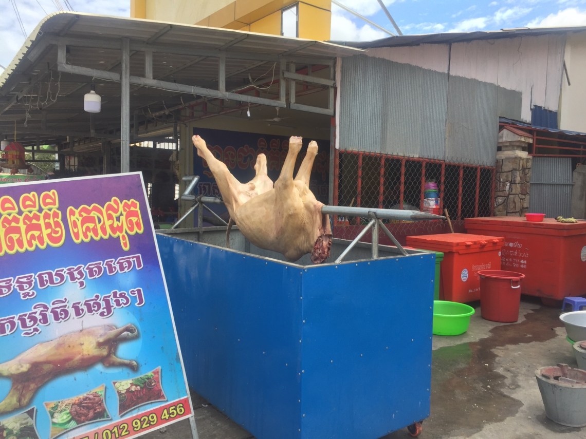 Battambang ist eine alte Kolonialstadt und viele alte Häuser sind noch erhalten. Es ist wirklich eine sehr schöne alte Stadt und nicht touristisch. Als erstes wollte ich in eine Galerie die einem Spanier gehört der Porträts von Kambodschanern gemacht hat. Leider war die Galerie zu ohne einen Hinweis warum. Also bin ich weiter gelaufen über den Fluss auf die andere Seite und wollte mir den Gouverneurspalast anschauen. Ich bin gelaufen und gelaufen in der brütenden Hitze bis ich vor dem vermeintlichen Palast stand. Hab es leider verwechselt und stand vor dem Presidents Hotel 🙂 Naja dafür habe ich ein paar interessante Dinge gesehen, die ich sonst verpasst hätte wie beispielsweise ein ganzes Rind auf dem Spies für das Abendessen, eine Wäscherei die mit Super Mario für ihre Schnelligkeit wirbt und auch die vielen internationalen Schulen und Unis.