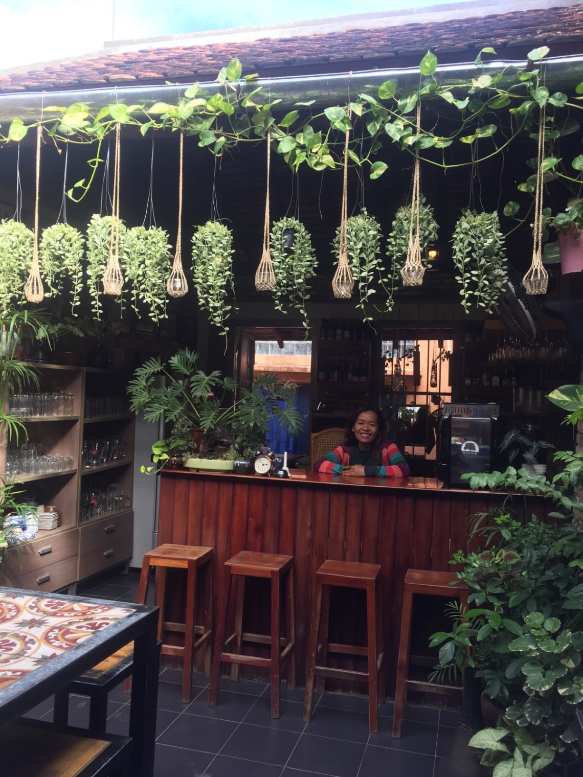 Auf dem Rückweg habe ich eine Pause im Park am Fluss und in einem Café gemacht. Da die Galerie auf dem Rückweg immer noch geschlossen war bin ich zum alten Bahnhof gelaufen, der angeblich ein tolles Fotomotiv sein soll. Also es sah schon sehr verlassen aus aber alte Züge habe ich keine gesehen. Nur dass die Uhr immer 8.02 anzeigt stimmt 🙂 Zurück bin ich einen anderen Weg gelaufen und durch einige kleine Gassen gelaufen (nahe der Street 102). Dort hab ich dann auch ein Café gefunden welches auch im Lonely Planet empfohlen wurde. Das The Lonely Tree Café. Im Untergeschoss befindet sich ein Laden mit Handwerksstücken von Menschen mit Behinderung oder Waisen und im ersten Stock ist ein wunderschönes offenes Café mit Holzbänken und Pflanzen. Die Angestellten dort sind auch teilweise körperlich behindert durch Verletzungen oder Krankheit. Sie waren sehr sehr nett zu mir und ich habe mich sehr wohl gefühlt. Eigentlich wollte ich später wieder ins Eden zum Abendessen und wollte hier nur einen Snack essen aber als die Portion Crispy Auberginen kam war das Abendessen erledigt. Es war eine mega Portion für 2,5 Dollar 🙂 Ich bin also länger geblieben, habe noch zwei hausgemachte Eistees geschlürft und hab einfach mal nichts gemacht und nur die Ruhe und das schöne Ambiente genossen. Dafür hat man ja Urlaub 🙂