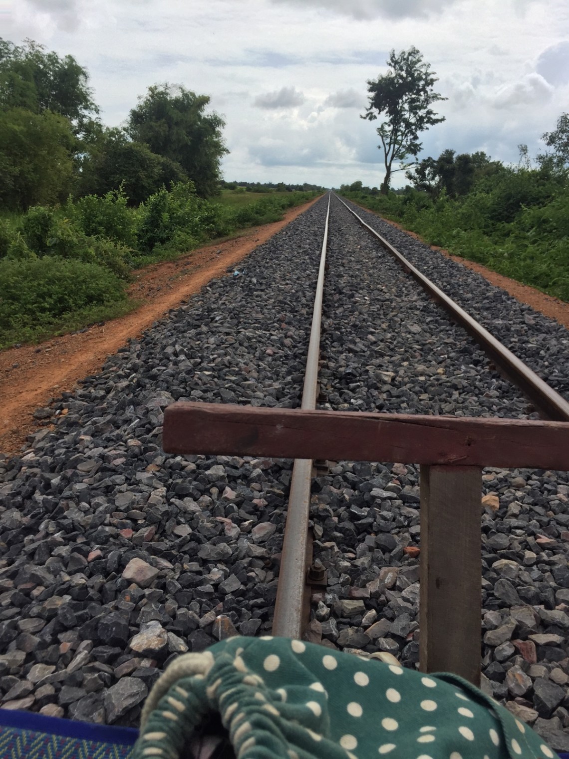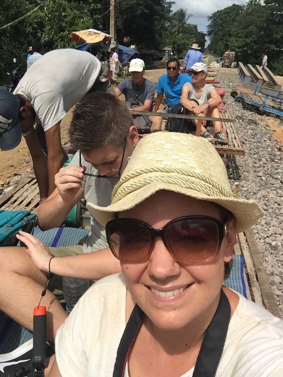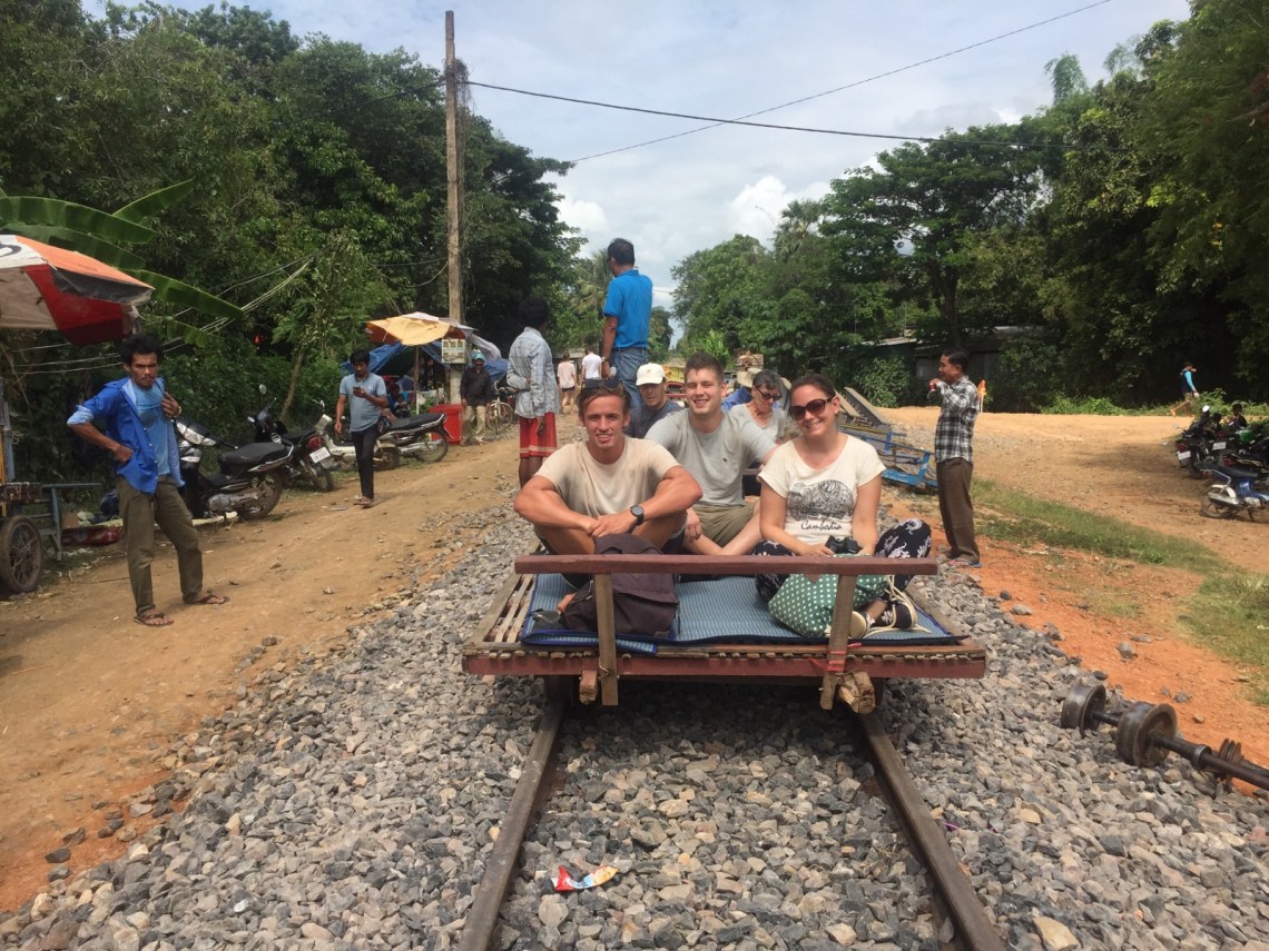 Danach gab es zum Stimmungswechsel das Kontrastprogramm: Bamboo Train! 🙂 Der alte Bamboo Train soll ja angeblich nicht mehr existieren weil er umgebaut und sicherer gemacht werden soll. Daher wurde ein neuer Bamboo Train an anderer Stelle für die Touristen gebaut, der allerdings auch nur von Touristen besucht wird und keinen anderen Zweck hat. Einer der Jungs hat dann gefragt zu welchem Bamboo Train wir fahren und unser Guide meinte: the old one! the new one is boring 🙂 🙂 Also es gibt ihn noch, allerdings nur eine kurze Teilstrecke weil in der Mitte wirklich eine Baustelle ist und er dort nicht mehr befahren werden kann. Aber 10 Minuten sind besser als nix 🙂 Kostet 5 Dollar und man hat jede Menge Spaß 🙂 Man steigt auf die Holzplanke die auf zwei Stangen mit Rollen liegt und los geht der kleine Motor und die lustige Fahrt. Da die Strecke nur ein Gleis hat kommt natürlich auch Gegenverkehr. Dann muss der der weniger geladen hat von der Strecke runter gehoben werden und der andere Wagen kann vorbei fahren. Ist uns drei mal passiert. Die Fahrt ist holprig aber man fährt durch die Felder und wird mit einem schönen Ausblick entschädigt. Nach 10 Minuten kommt man in eine Art Dorf, was sich aber als Verkaufsstände herausgestellt hat und muss aussteigen. Dort wartet man dann in einer Hütte wo man natürlich Tshirts mit Bamboo Train Aufdrucken kaufen kann oder auch was zu trinken bekommt. Ein kleines Mädchen der Familie der die Hütte gehört hat hat sich einfach zwischen uns gesetzt und die Kekse von einem der Holländer genascht und sich gefreut als sie sich selbst im Handy auf einem Foto gesehen hat. Kinder sind eben überall gleich 🙂 Dann ging es wieder zurück diesmal ohne Abstieg vom Gleis und die Tour ging weiter.