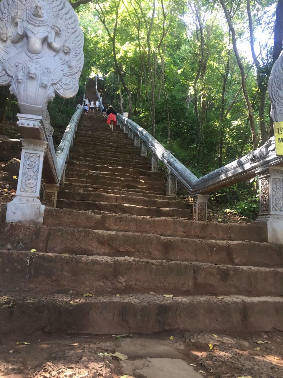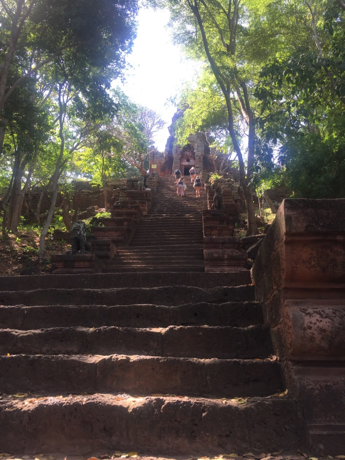 Anschließend sind wir zum Tempel Prasat Banan gefahren. Unser Guide meinte wir machen den Tempel lieber vor dem Mittagessen weil wir ein paar Stufen hinauf laufen müssen. Ein paar Stufen waren dann allerdings 358!!! In der Mittagshitze. Puh… Ich hab in der Mitte eine Pause eingelegt denn die Stufen waren sehr steil und ich konnte vor lauter Schweiß der mir unter der Sonnenbrille über die Augen gerannt ist nichts mehr sehen 🙂 Irgendwann hab ich es aber auch nach oben geschafft und konnte die schöne Aussicht genießen. Die Tempel waren eher klein aber sehr schön. Der Weg runter war leichter und so kamen wir pünktlich um halb drei 🙂 🙂 zum Mittagessen. Unser Fahrer lag während des Essens in der Hängematte und hat geschnarcht.