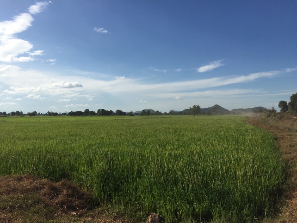 Gestärkt sind wir durch die Felder und über sehr holprige Straßen zum Bergtempel Phnom Sampeau gefahren und wieder mussten wir den Berg hinauf laufen. Auf halbem Weg kann man links zu den Killing Caves abbiegen. Dort gibt es einen sehr schönen buddhistischen Tempel und eine nicht so schöne Darstellung der Foltermethoden der Roten Khmer mit richtigen lebensgroßen Figuren. Außerdem die Killing Cave, eine Höhle in die früher von oben die Leichen geworfen wurden. Unten in der Höhle sind die Knochen und Schädel aufgetürmt. Wieder kein schöner Ort. Von dort kann man weiter nach oben zum Tempel und der Aussichtsplattform laufen und hinter dem Tempel über eine Treppe zurück ins Dorf. Die Aussicht ist grandios. Man kann weit über die Felder schauen.