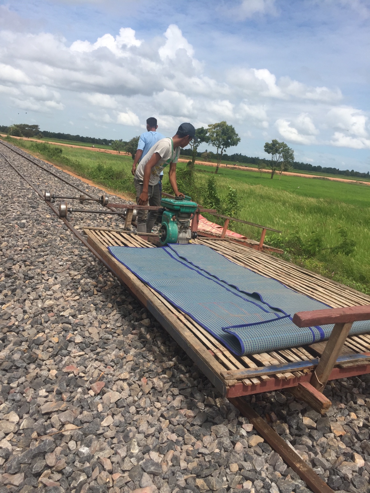Danach gab es zum Stimmungswechsel das Kontrastprogramm: Bamboo Train! 🙂 Der alte Bamboo Train soll ja angeblich nicht mehr existieren weil er umgebaut und sicherer gemacht werden soll. Daher wurde ein neuer Bamboo Train an anderer Stelle für die Touristen gebaut, der allerdings auch nur von Touristen besucht wird und keinen anderen Zweck hat. Einer der Jungs hat dann gefragt zu welchem Bamboo Train wir fahren und unser Guide meinte: the old one! the new one is boring 🙂 🙂 Also es gibt ihn noch, allerdings nur eine kurze Teilstrecke weil in der Mitte wirklich eine Baustelle ist und er dort nicht mehr befahren werden kann. Aber 10 Minuten sind besser als nix 🙂 Kostet 5 Dollar und man hat jede Menge Spaß 🙂 Man steigt auf die Holzplanke die auf zwei Stangen mit Rollen liegt und los geht der kleine Motor und die lustige Fahrt. Da die Strecke nur ein Gleis hat kommt natürlich auch Gegenverkehr. Dann muss der der weniger geladen hat von der Strecke runter gehoben werden und der andere Wagen kann vorbei fahren. Ist uns drei mal passiert. Die Fahrt ist holprig aber man fährt durch die Felder und wird mit einem schönen Ausblick entschädigt. Nach 10 Minuten kommt man in eine Art Dorf, was sich aber als Verkaufsstände herausgestellt hat und muss aussteigen. Dort wartet man dann in einer Hütte wo man natürlich Tshirts mit Bamboo Train Aufdrucken kaufen kann oder auch was zu trinken bekommt. Ein kleines Mädchen der Familie der die Hütte gehört hat hat sich einfach zwischen uns gesetzt und die Kekse von einem der Holländer genascht und sich gefreut als sie sich selbst im Handy auf einem Foto gesehen hat. Kinder sind eben überall gleich 🙂 Dann ging es wieder zurück diesmal ohne Abstieg vom Gleis und die Tour ging weiter.