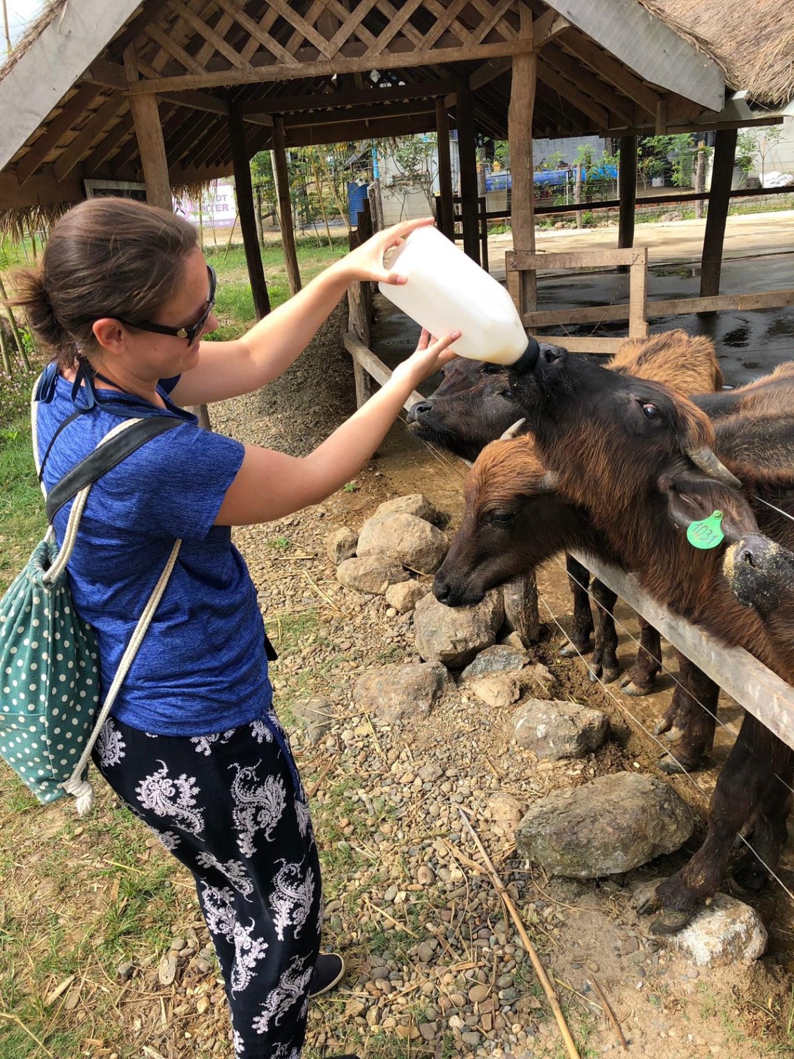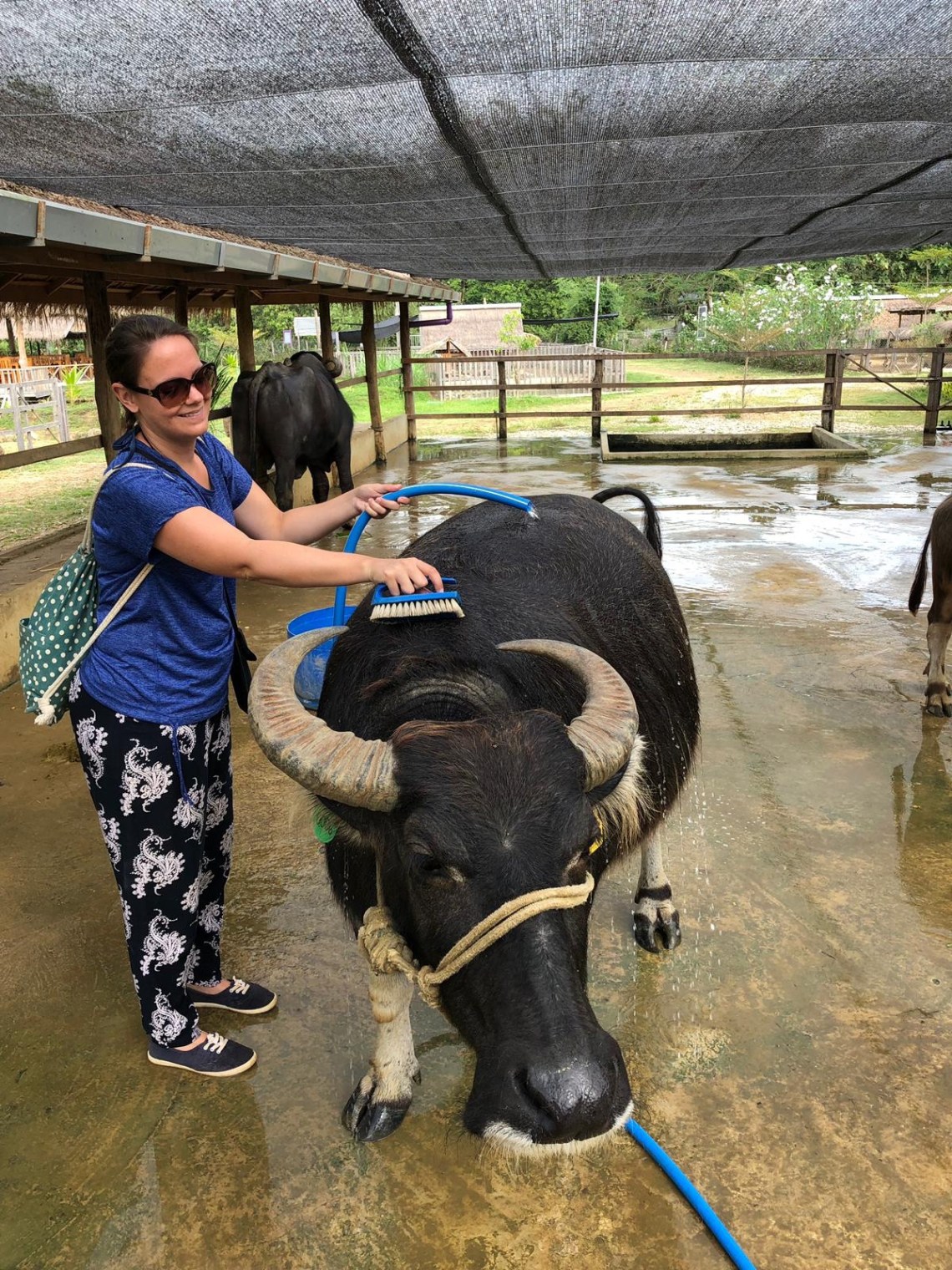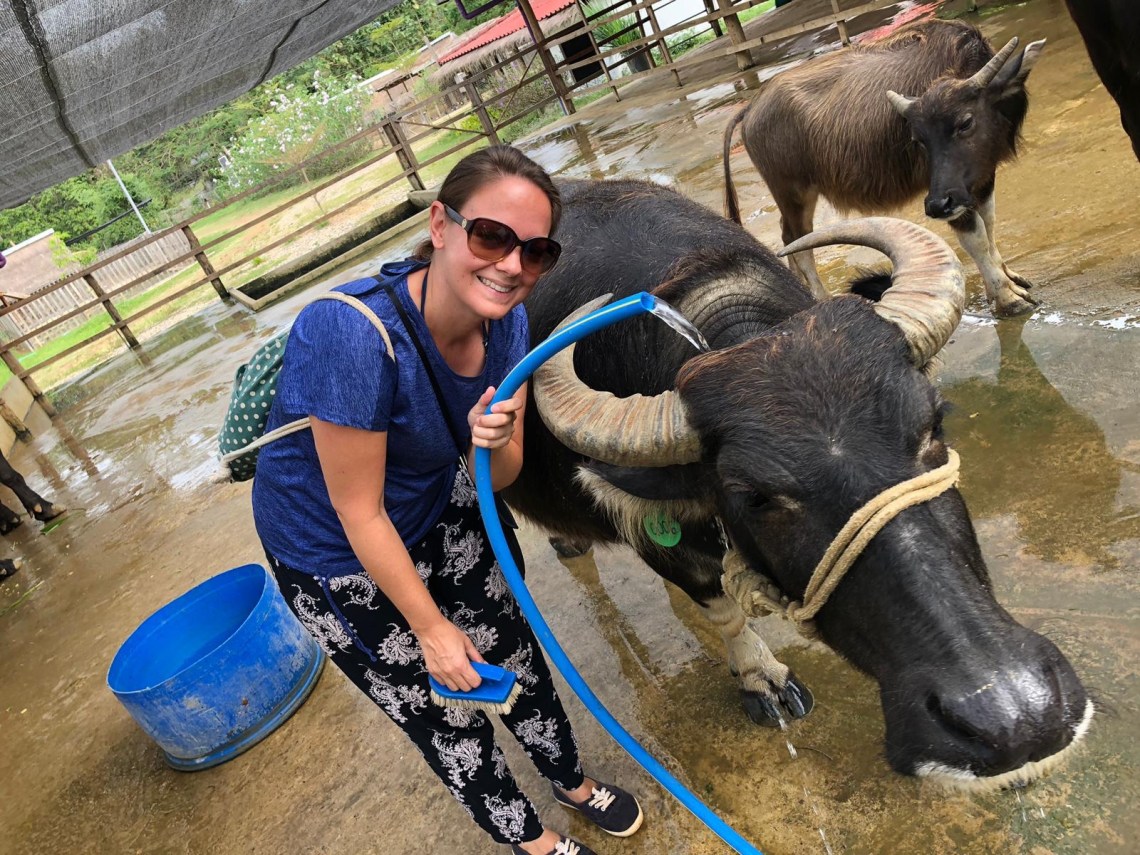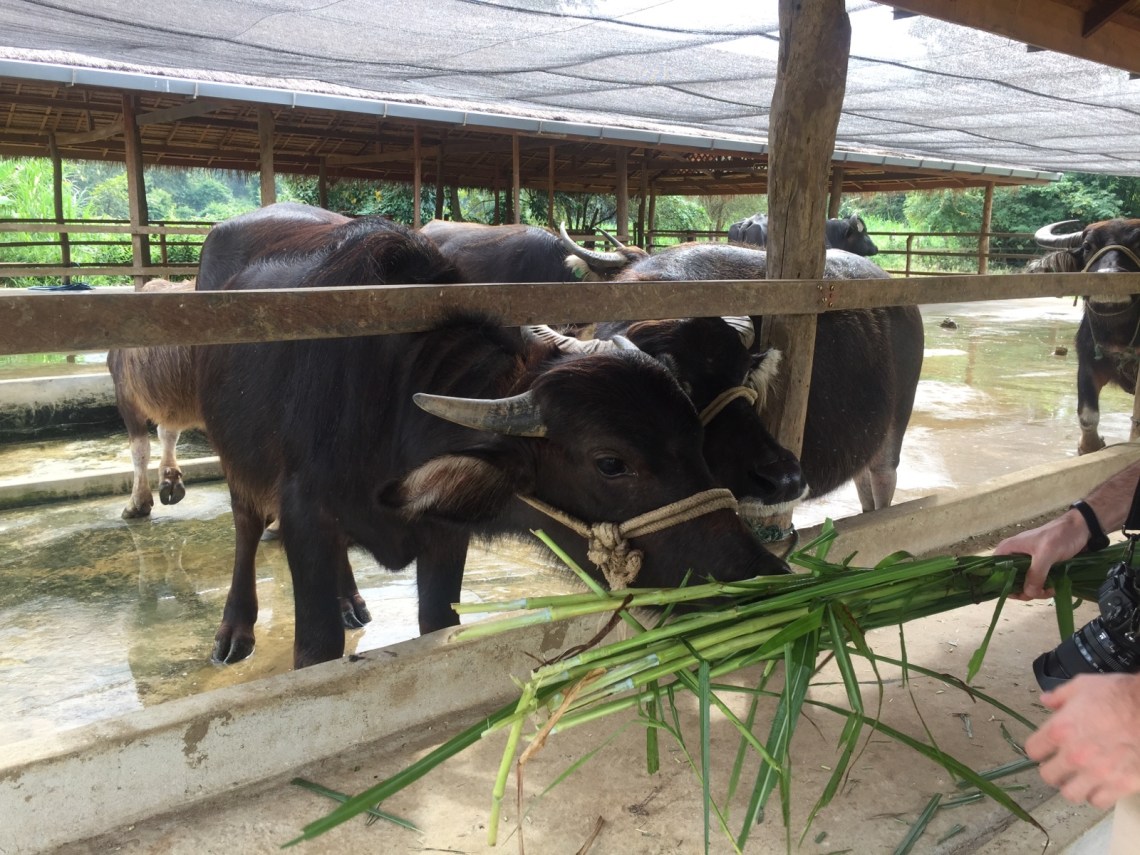 Um neun Uhr hat uns ein Fahrer abgeholt, denn wir hatten einen Ausflug zum Kuang Si Wasserfall gebucht 🙂 Die Fahrt dauert ca 1 Stunde und man kommt vorher noch an einer Wasserbüffel Milch Farm vorbei. Dort wollte ich unbedingt hin. Die Farm ist ein Projekt um Bauern zu zeigen dass sie mit ihren Wasserbüffeln auch Geld verdienen können ohne sie zu schlachten oder zu verkaufen. Sie können ihre Büffel dort hinbringen, dort werden sie medizinisch untersucht und gemolken. Und den Bauern wird gezeigt wie man sie per Hand melken kann und wie sie sie füttern können um sie gesünder zu ernähren. Außerdem gibt es noch verschiedene Tiergehege um den Bauern eine artgerechtere Tierhaltung beizubringen. Hasen, Schweine und Hühner. Das kleine Häschen hatte es mir besonders angetan 🙂 Dann dürften wir selbst melken… Daniel hat es super hinbekommen, ich eher nicht so und ich wollte die Büffelkuh nicht so stressen. Dann durften wir die Büffel waschen und schrubben und füttern. Das war sehr lustig weil sie sehr anhänglich waren 🙂 Zum Abschluss gab es Büffelmilcheis 🙂