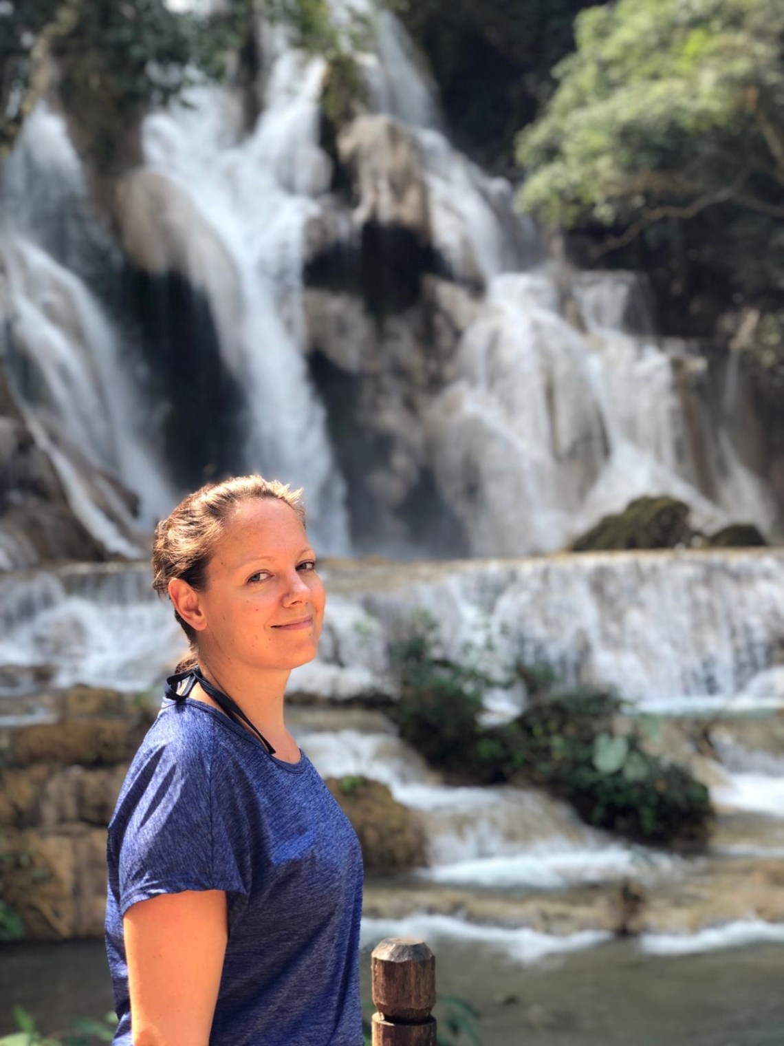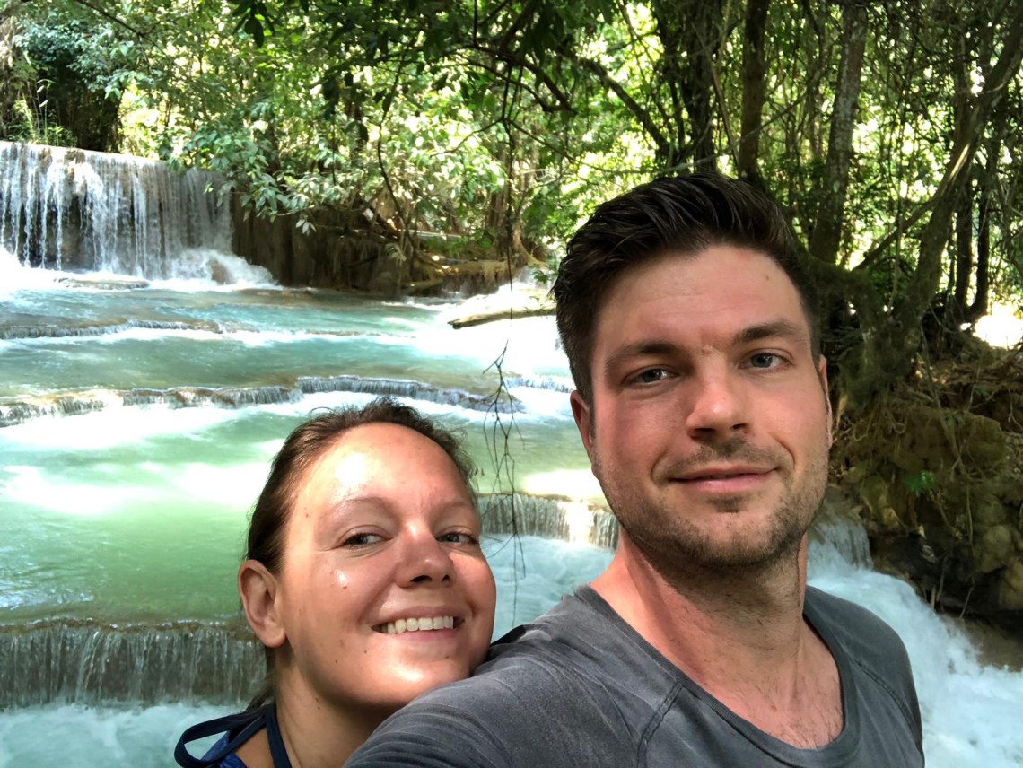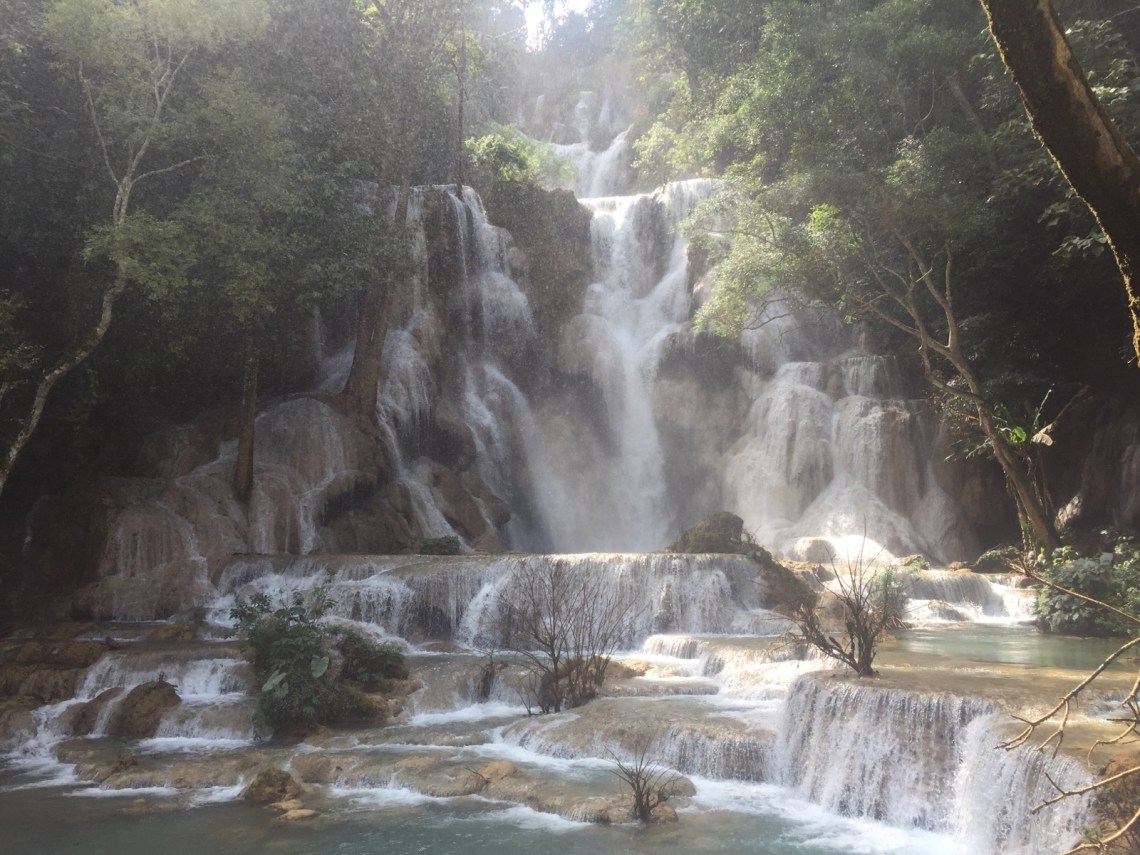 Dann sind wir zum Wasserfall gefahren. Auf dem Parkplatz standen schon jede Menge Minivans. Man zahlt einen Eintritt von 20000 Kip also 2 €. Inbegriffen ist auch das Bären Auffangcenter welches man auf dem Weg zum Wasserfall anschauen kann. Die Bären sind echt süß, sehr dick und flauschig. Der Wasserfall ist der schönste in Laos, besonders in der Regenzeit oder nach der Regenzeit denn dann hat er am meisten Wasser. Es war unglaublich schön dort. Das hellblaue und türkisblaue Wasser fließt in mehrere Becken auf einer Strecke von ca 1 km den Berg hinab. Schwimmen kann man dort natürlich auch. Wir sind erst einmal bis nach ganz oben gelaufen wo sich der Fluss über die Kante ca 30 Meter herunter ergießt. Kurz nachdem wir wieder an den Becken entlang nach unten laufen wollten kam eine ganze Horde chinesischer Touristen an. Da hatten wir Glück denn wir hatten schon wunderschöne Fotos von dem paradiesischen Wasserbecken gemacht ganz ohne Menschen 🙂 In der Mitte etwa sind wir dann auch schwimmen gegangen. Dort war schon mehr los denn jeder wollte ein Foto im hellblauen Pool. Wir auch 🙂 Es war gar nicht so einfach sich schwimmend ein Plätzchen zu suchen wo gerade keine anderen Menschen im Wasser waren. Es war aber sehr erfrischend und wirklich ein Erlebnis dort zu baden. Es gibt auch Umkleidekabinen, man kann also trocken wieder zurück 🙂