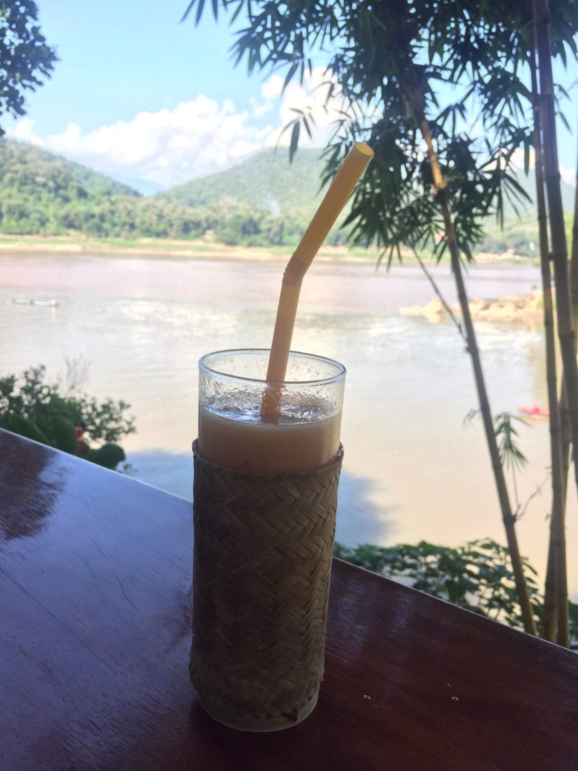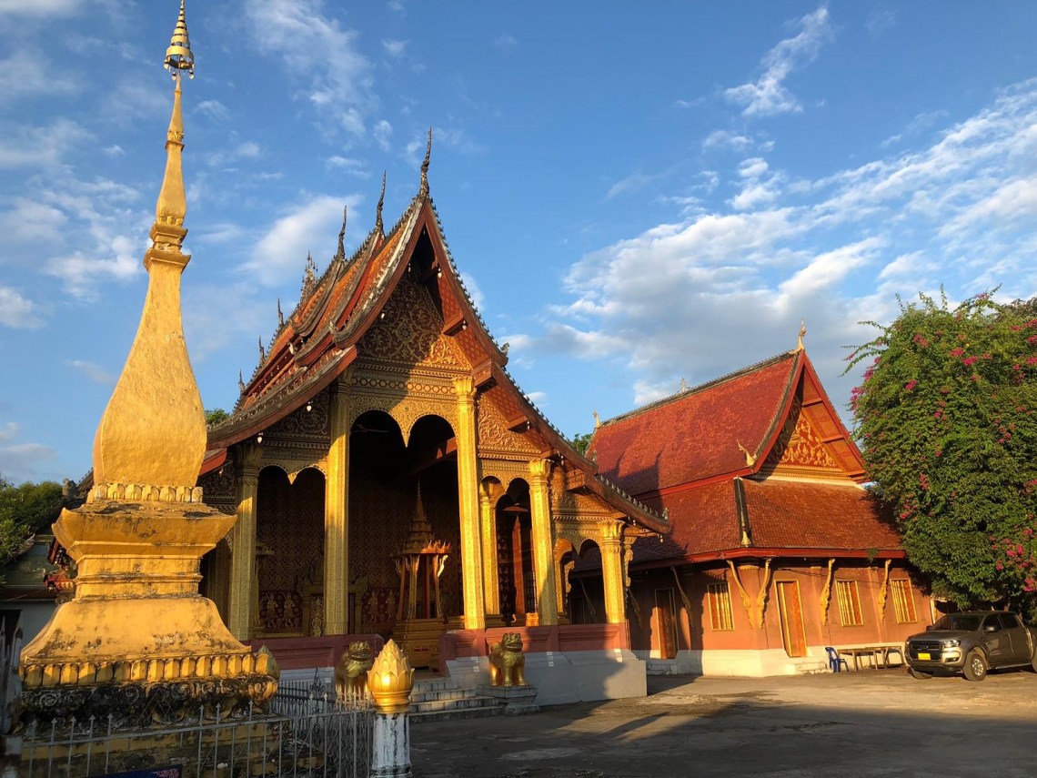 Wir sind am Mekong gestartet und bis zum Ende der Halbinsel gelaufen. Dort haben wir einen Stop in einem Café mit Blick auf den Mekong gemacht und einen gemischten Fruchtshake geschlürft 🙂 es war ein Café von einem Hotel und sehr schick. Den Namen weiß ich leider nicht mehr, war zu teuer 🙂 Anschließend sind wir zum größten und bedeutendsten Kloster von Luang Prabang gelaufen, das Xieng Thong. Der Tempel ist sehr bekannt durch sein auffälliges Dach welches aus drei Ebenen besteht und wunderschön verziert ist. Außerdem hat er die meisten Spitzen auf dem Dach. Kein Tempel in Luang Prabang darf mehr Spitzen auf dem Dach haben als der Wat Xieng Thong 🙂