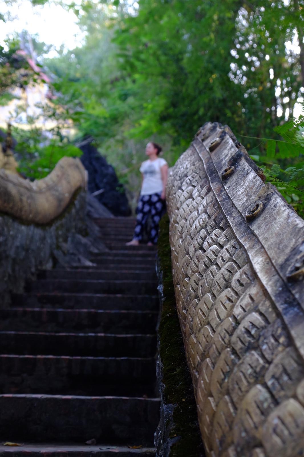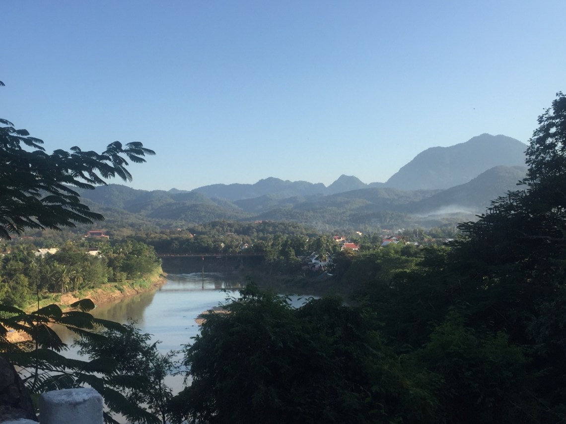 Nach einer Stärkung im Joma am Nam Khan Fluss (der Nam Kham fließt am Ende der Halbinsel in den Mekong) mit Matcha iced Latte sind wir zum Mount Phousi gelaufen. Der Mount Phousi steht mitten in der Stadt. Es gibt mehrere Steintreppen von verschiedenen Seiten über die man auf den Gipfel kommt. Es sind insgesamt 329 Stufen die sich lohnen denn von oben hat man einen herrlichen Ausblick auf den Mekong und Luang Prabang und die Berge. Vor allem für den grandiosen Sonnenuntergang laufen die meisten Touristen und Einheimischen dort hinauf. Wir natürlich auch 🙂 Wir sind die Nordseite hochgelaufen, also nicht den Weg von der Hauptstraße aus, weil man dort auf dem Weg nach oben noch das Kloster besichtigen kann und an einigen Buddhastatuen vorbei kommt und Buddhas Fußabdruck in einer Höhle sehen kann. Naja… mit viel Fantasie kann man einen Fußabdruck erkennen. Oben angekommen ist man nicht wirklich lange unter sich wenn es gegen Abend zugeht. Wir waren zum Glück schon gegen halb fünf oben und könnten uns somit einen guten Platz am Geländer sichern von dem aus man den Sonnenuntergang sehen konnte. Es gab natürlich wie immer an solchen Plätzen Dramen weil manche nicht früh genug hoch gelaufen sind und dann keinen guten Platz hatten 🙂