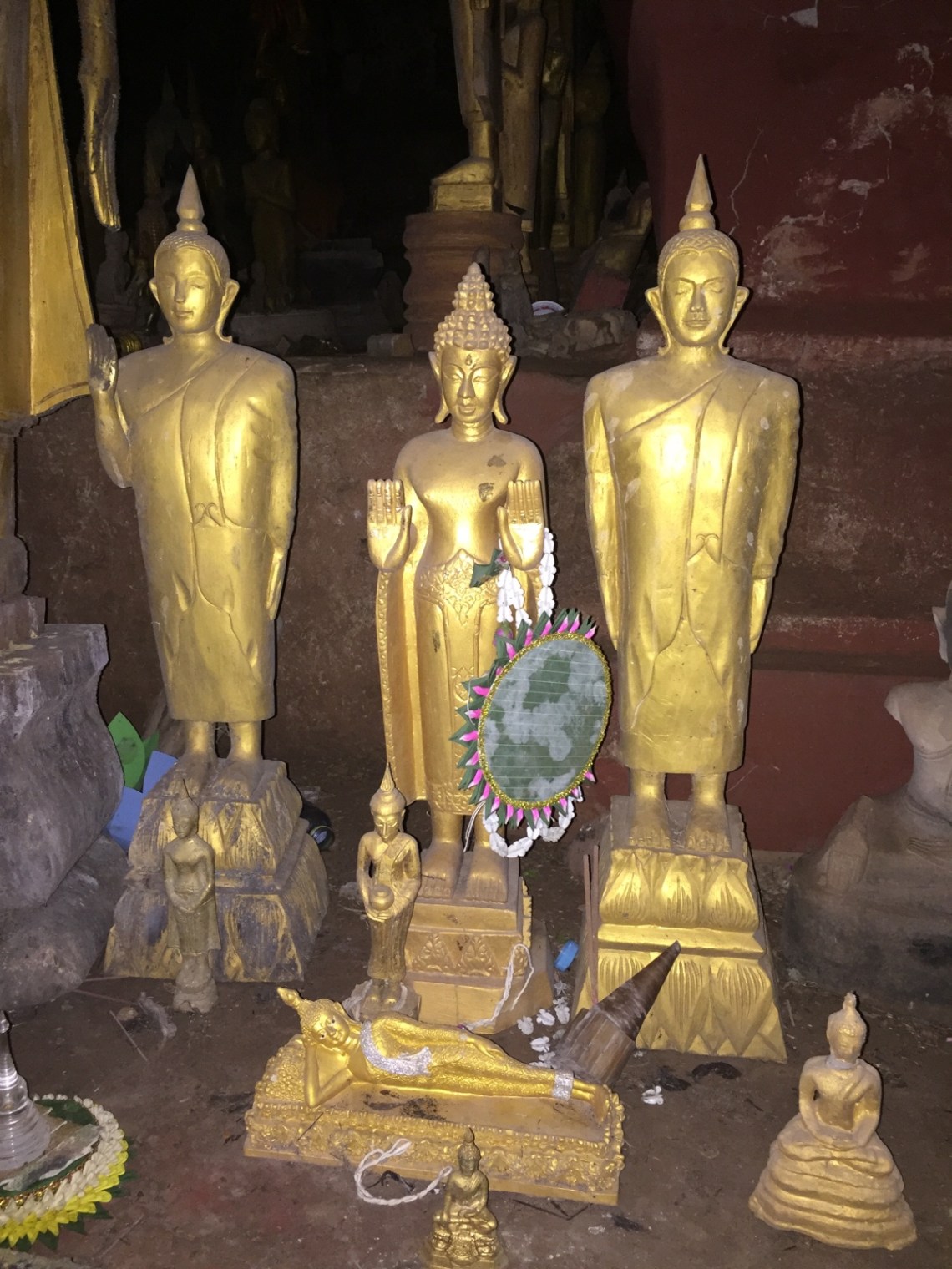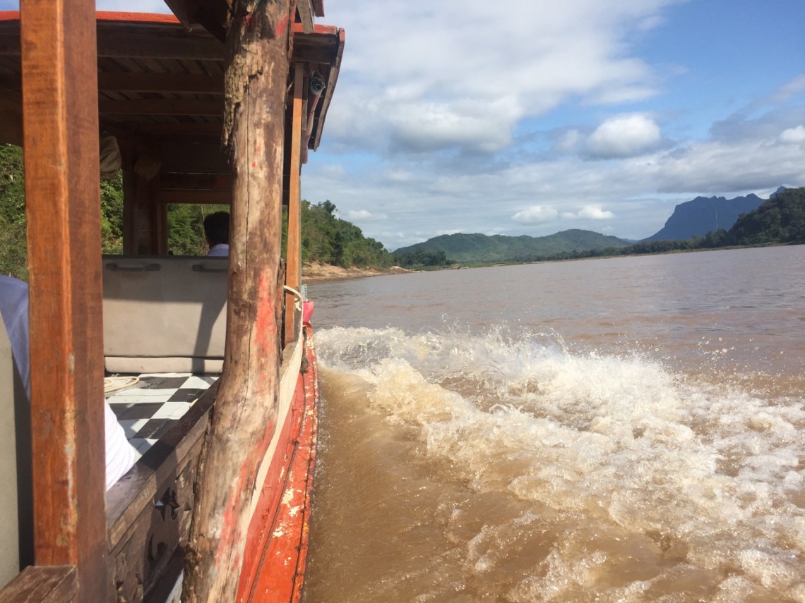 Danach sind wir frühstücken gegangen in einer französischen Bäckerei um uns für die Bootsfahrt zu den Pak Ou Höhlen zu stärken. Um halb neun ging es los mit dem Boot den Mekong hinauf zu den Höhlen. Alleine wegen der einstündigen Fahrt auf dem Mekong lohnt sich der halbtägige Ausflug schon. Wir haben 8€ bei einer Agentur bezahlt. Direkt am Boot kostet das Ticket 6,5€. Besser also direkt morgens zur Bootablegestelle laufen und dort das Ticket kaufen. Die beiden Höhlen sind bekannt dafür dass dort hunderte Buddhastatuen im dunklen stehen. Eigentlich dachte ich dass man mit dem Boot durch die Höhlen durch fahren kann aber leider nein, wir mussten wieder viele viele Treppenstufen hochsteigen. Ist zwar gut für die Beinmuskeln aber so langsam kann ich keine Treppen mehr sehen 🙂 Die erste Höhle oben ist komplett dunkel und man muss das Handylicht benutzen oder eine Taschenlampe ausleihen. Im Tempel befinden sich viele Buddhastatuen. Sie wurden dort zum Schutz hingebracht da die Chinesen alle Buddhastatuen vernichten wollten. Also wurde alle Statuen von den Familien und Klöstern eingesammelt und dort in die beiden Höhlen gebracht. Wenn man die Geschichte kennt finde ich die Höhlen spannend. Wenn nicht, sind es nur zwei Höhlen mit vielen Buddhas 🙂