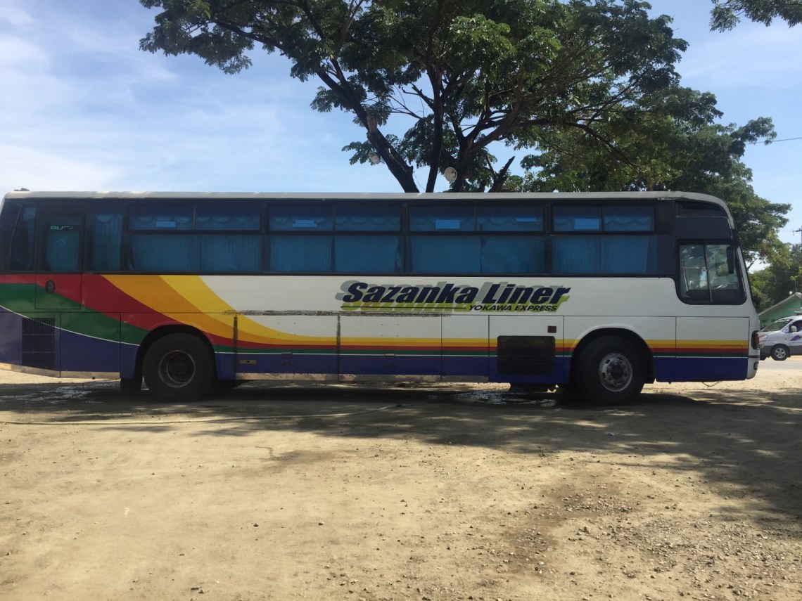 Das Hotel hat mir ein Busticket nach Taungoo organisiert. Um halb zehn ging der Bus und um halb neun musste ich los da die Bushaltestelle etwas außerhalb ist. Als ich nach dem Busticket gefragt habe habe ich mich auch nach der Größe des Busses und der Fahrtzeit erkundigt. Ich habe Taungoo nämlich ausgewählt weil es in der Mitte zwischen Mandalay und Yangoon liegt und direkt am Highway. Deswegen bin ich davon ausgegangen dass die Busse dann auch über den Highway fahren… 🙂 Die Fahrtzeit sollte 8 Stunden dauern, was mir lang vorkam aber die Zeiten hier sind ja nicht so genau.