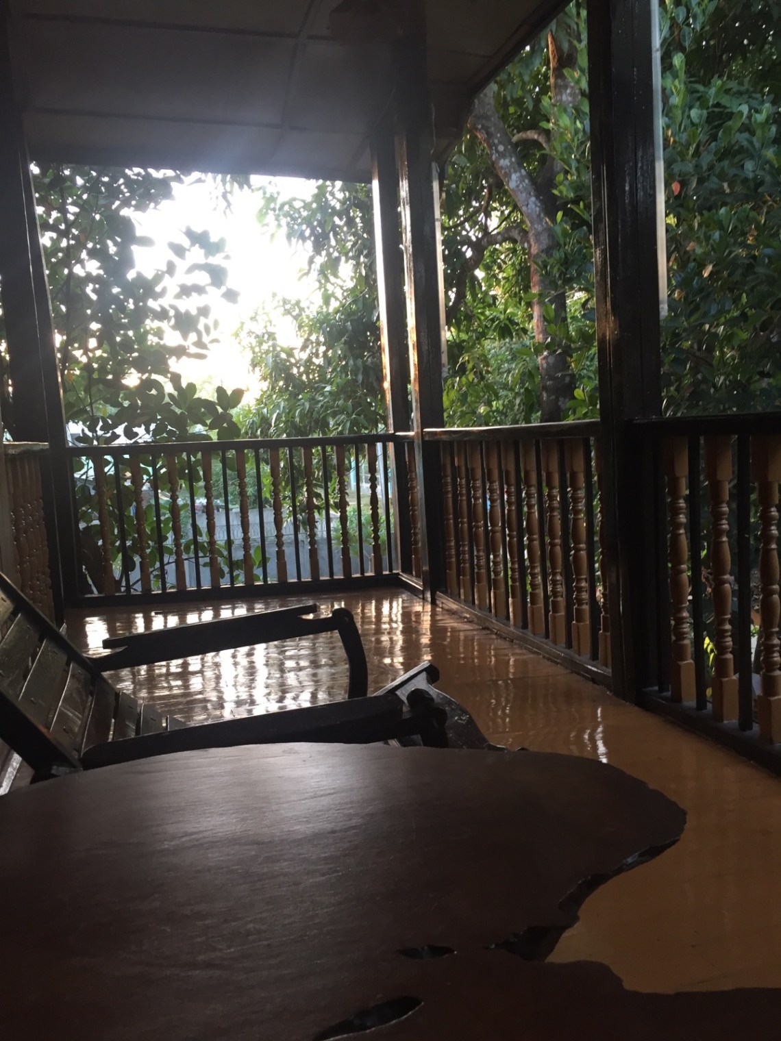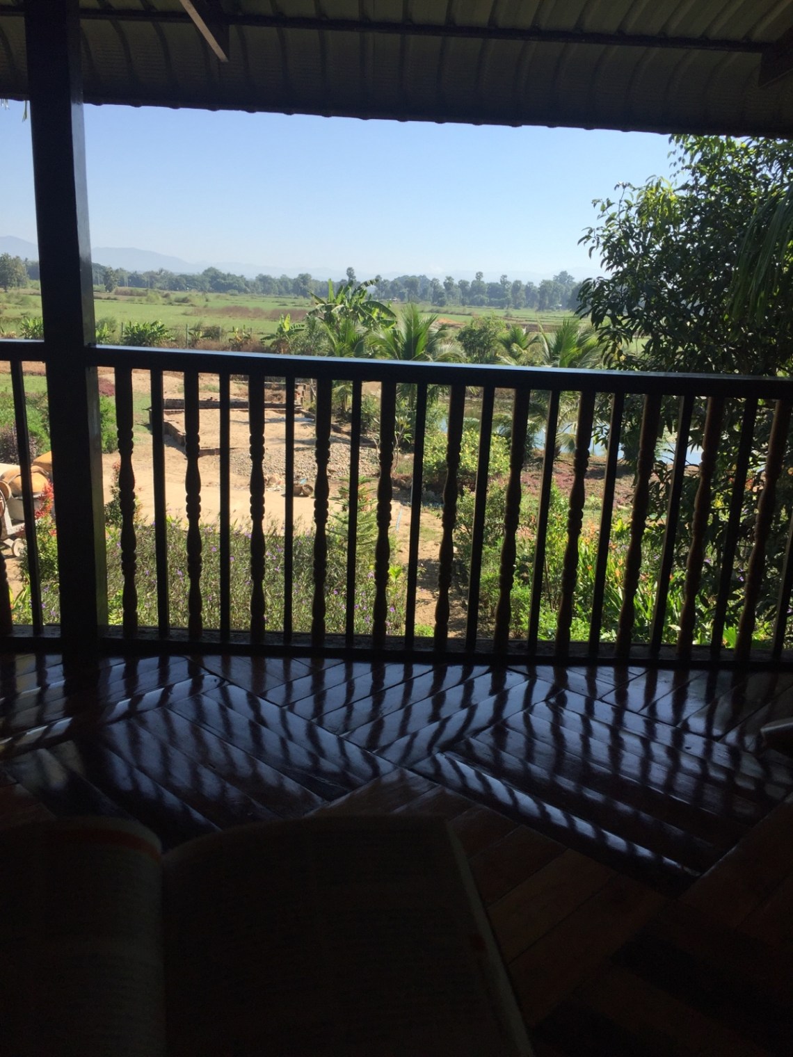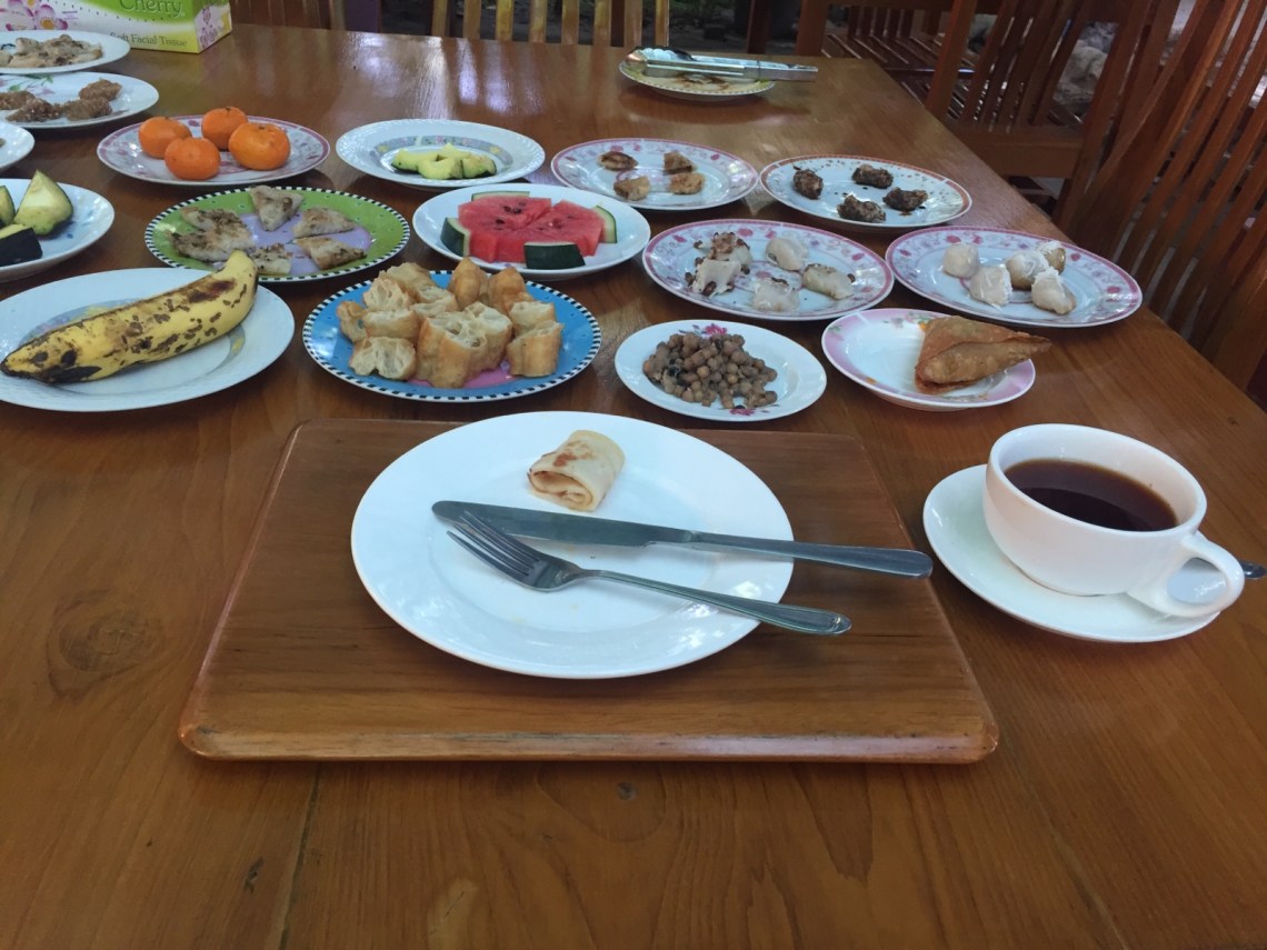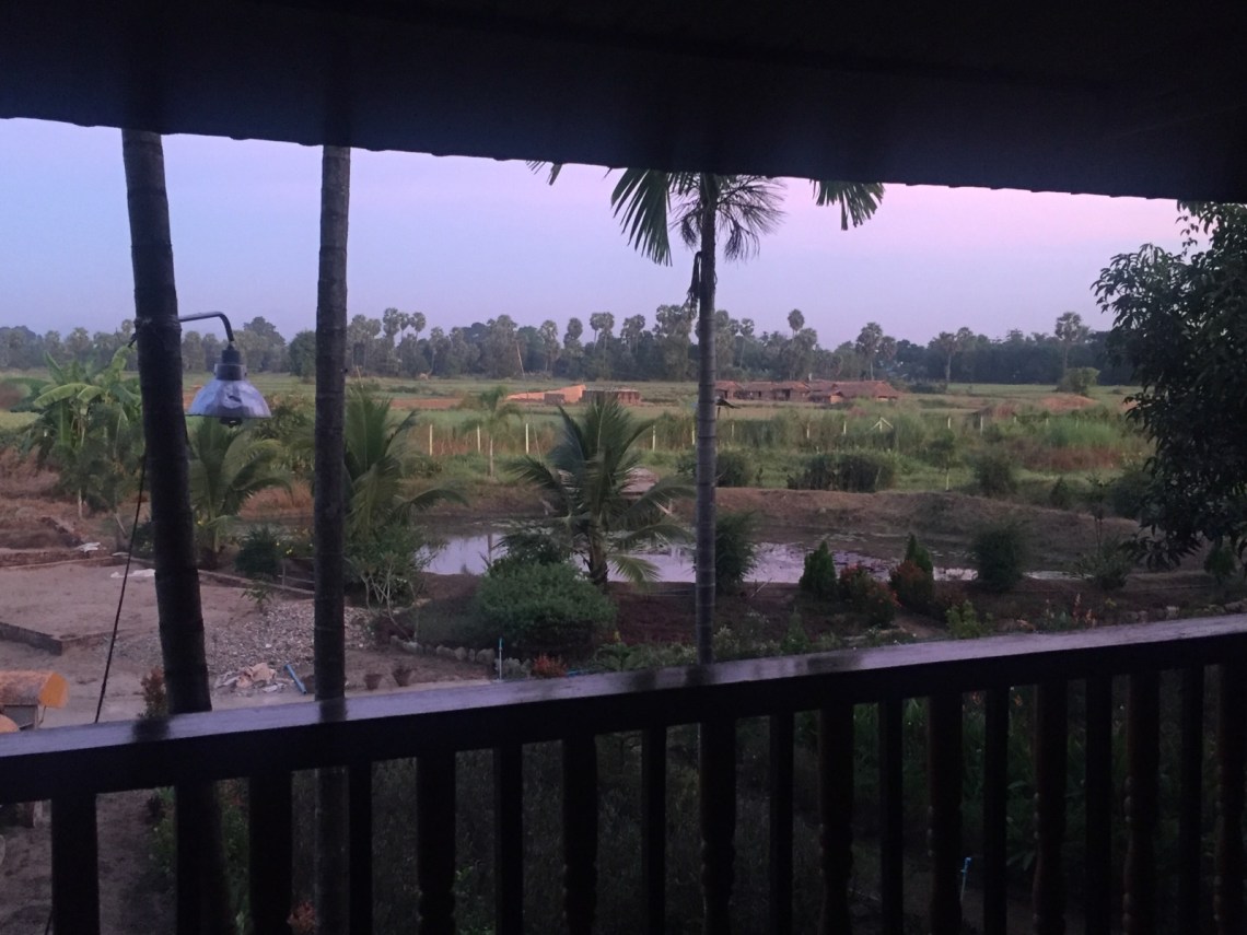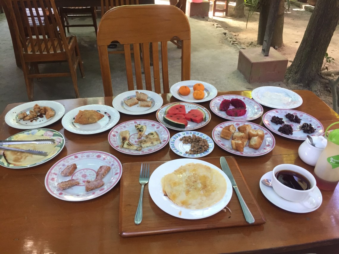 Gestern musste ich umziehen weil das große Zimmer reserviert war. Ich bin nun in einem kleineren Zimmer mit Balkon auf der Gartenseite. Auch sehr schön. Zum Frühstück wieder viele viele Teller und diesmal habe ich einen Ingwertee bekommen weil ich so gehustet habe. Eigentlich wollte ich danach in die Stadt aber da die Bauarbeiten mittwochs wohl ausfallen und alles ruhig war, habe ich den Tag wieder so verbracht wie den vorigen. Habe auf dem Kissen auf der Veranda gesessen, Musik gehört und einfach die Ruhe und die Aussicht genossen. Die Mädchen die geputzt haben, haben wunderschön gesungen beim putzen und es war einfach ein bezaubernder Moment. Im Feld haben Kinder gespielt, der Wind hat die Palmenblätter hin und her geweht und ab und zu kamen Vögel vorbei. Totale Entspannung… Mittagsschlaf gab es auch 🙂 Schließlich habe ich mich ins Restaurant gesetzt und diese Seite etwas aufgeräumt und neu gestaltet. Und mit meinen Eltern geskypt 🙂 Abendessen war wieder das gleiche weil es so lecker ist.