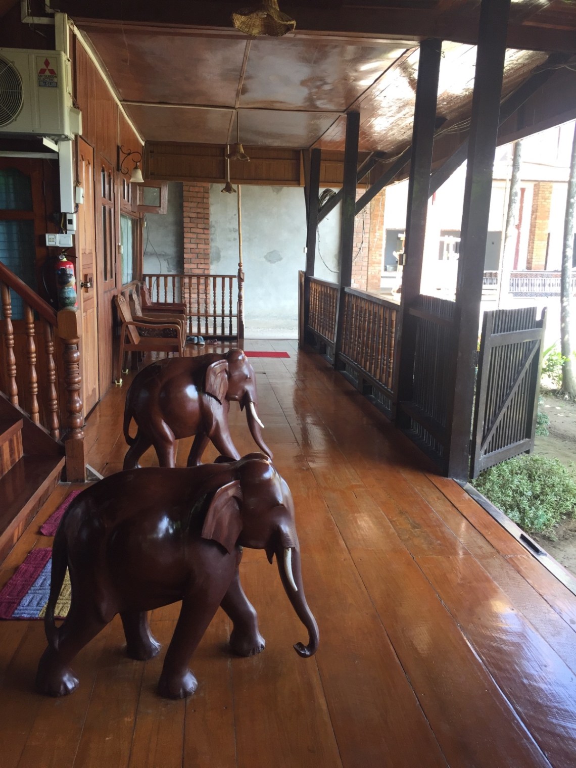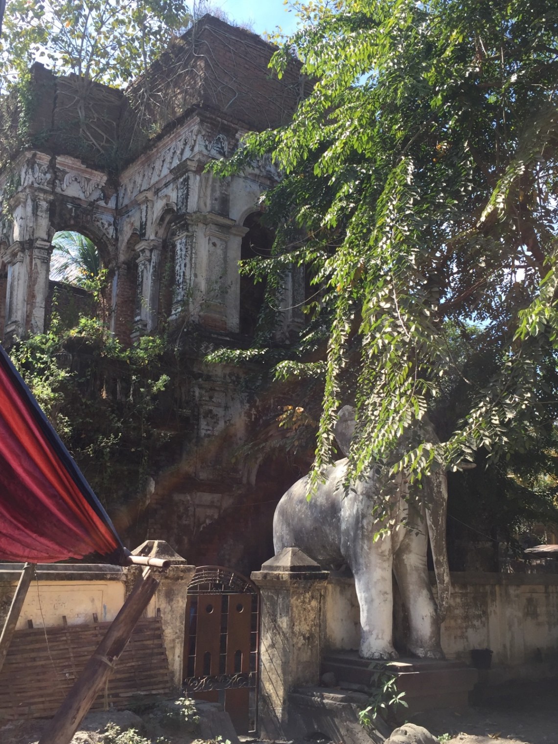 Nach Besichtigung der Pagode, die übrigens sehr schön ist und viele Details zum anschauen hat bin ich zum Angel Café gelaufen. Auf dem Weg dorthin habe ich ein altes Gemäuer gesehen welches überwuchert war und von Elefantenstatuen beschützt. Das habe ich mir angesehen und wurde von einem jungen und einem älteren Mann begrüßt. Es waren Bilder ausgestellt und der Mann war der Künstler. Der Junge hat übersetzt und wir haben uns etwas unterhalten. Er hatte ein Deutschland Trikot an und hat sich gefreut als er gehört hat dass ich aus Deutschland komme 🙂 Überhaupt werde ich hier immer sehr freundlich und neugierig begrüßt und es macht Spaß sich mit ein paar wenigen Worten zu unterhalten. An der Pagode hat mich auch eine Frau nach draußen begleitet und mir erklärt das auf der anderen Seite das Kloster ist.