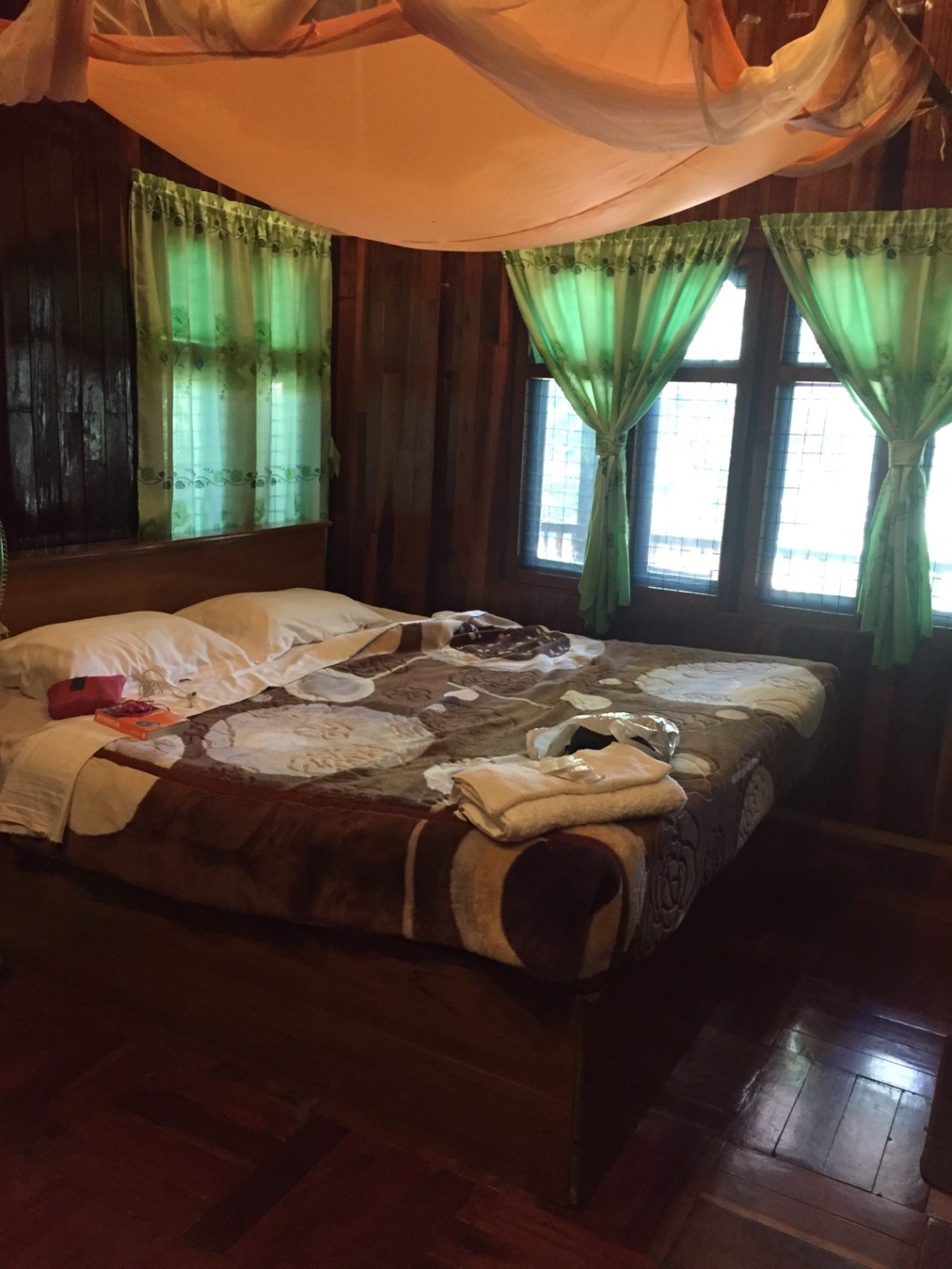 Das Frühstück ist gigantisch.. Man bekommt neben Pancakes und Toast noch ca 10 kleine Teller mit verschiedenen burmesischen Kleinigkeiten. Viel zu viel für eine Person aber super lecker. Die Mutter der Besitzerin hat sich ganz lieb gekümmert und sogar die Fliegen verscheucht. Am ersten morgen habe ich mit Heidi gefrühstückt, die dann leider mit dem Zug nach Yangon weiter gefahren ist. Sie reist auch alleine und liebt das Entdecken und Reisen genauso wie ich. Nachdem ich versucht habe alle Teller wenigstens zu probieren bin ich vollgefuttert nochmal ins Bett gefallen. Dann habe ich mich auf die obere Terrasse gesetzt und trotz des Baulärms mit Kopfhörern und Musik auf die Felder geschaut und entspannt. Um 12 Uhr war Mittagspause und da konnte ich dann auch in Ruhe meditieren und etwas Yoga machen. Es war einfach wundervoll die Ruhe zu genießen und einfach mal nichts zu machen. Auch das gehört zu einer schönen Reise, die ruhigen Momente zu suchen um wieder gestärkt für neue Taten zu sein. Ich hätte den ganzen Tag dort sitzen können. Aber durch die Erkältung war ich müde. Also wieder Mittagsschläfchen 🙂