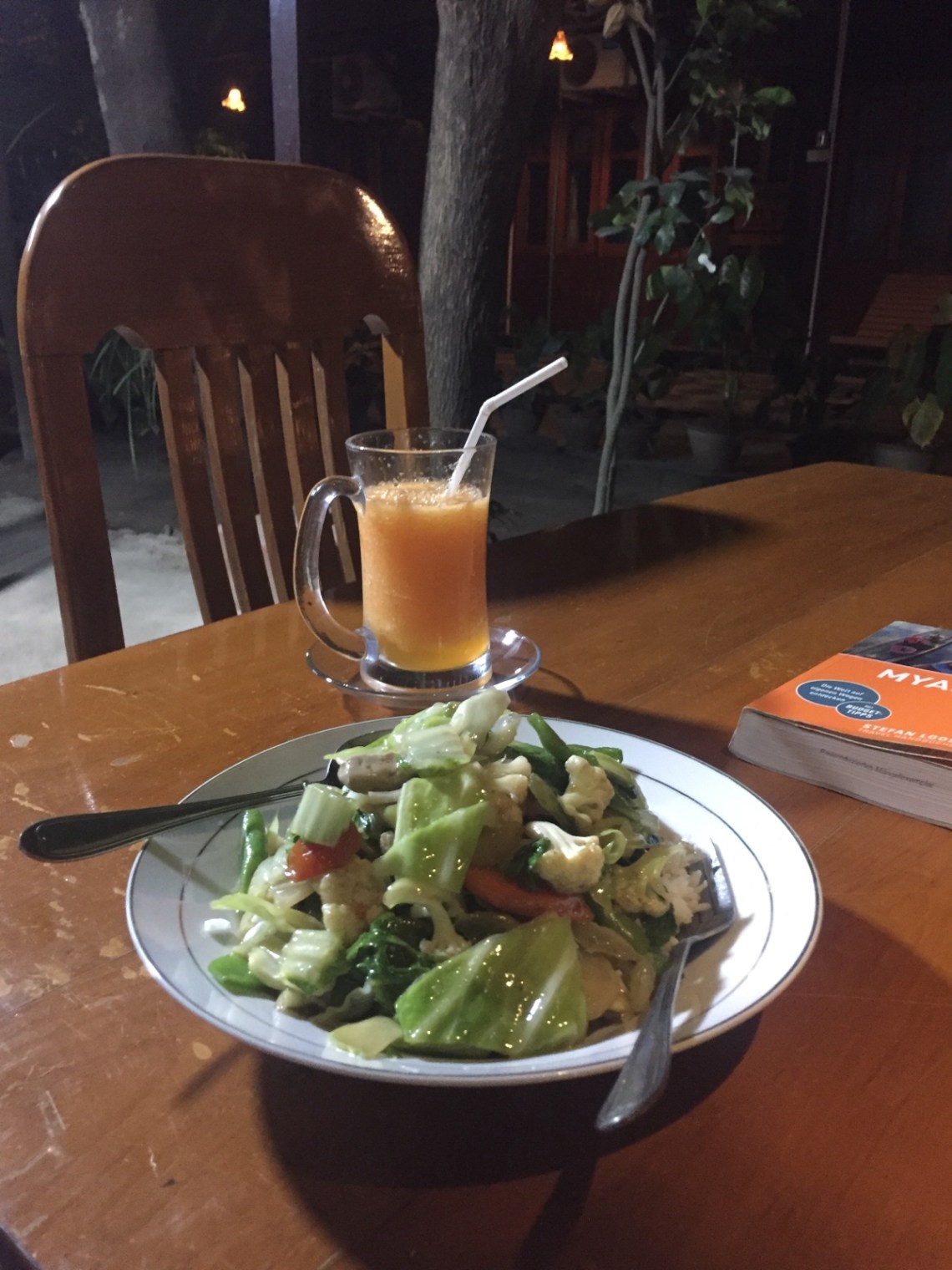 Trotz Schnupfen und Husten bin ich abends ins kleine Restaurant zwischen den Gästehäusern und habe wieder Reis mit Gemüse gegessen. Ich war der einzige Gast. Das Gemüse kommt aus dem Garten und es hat super frisch geschmeckt.