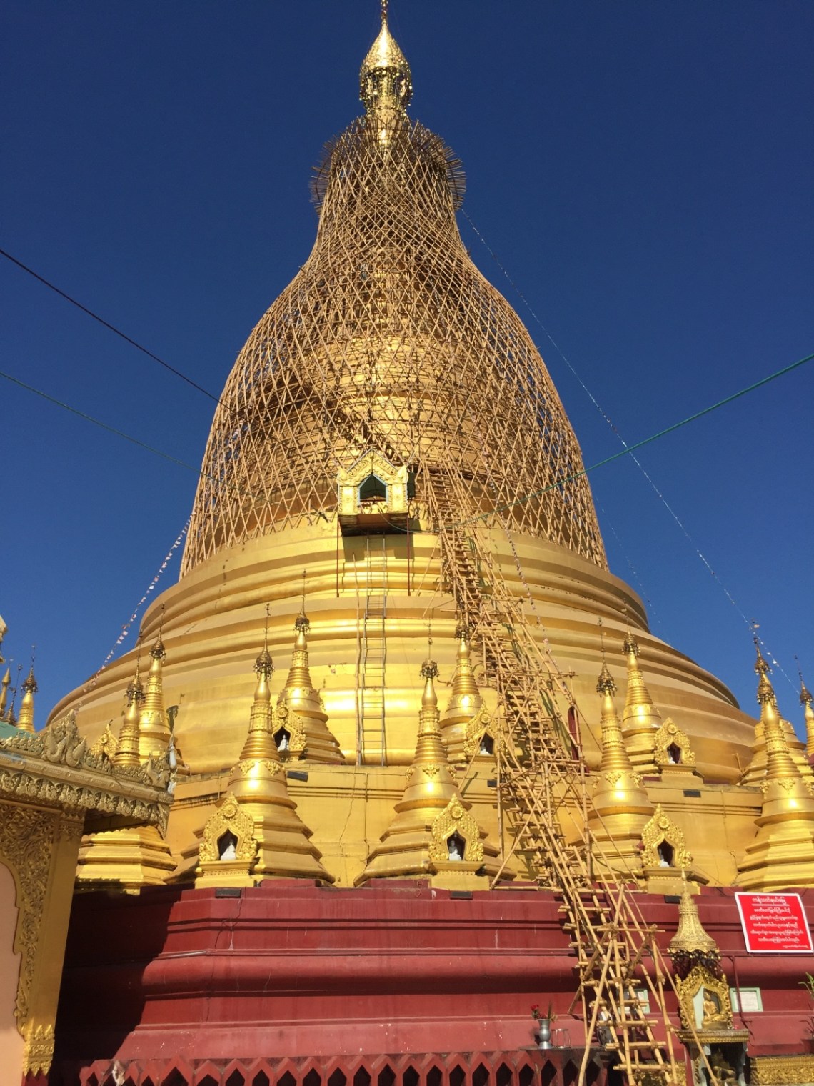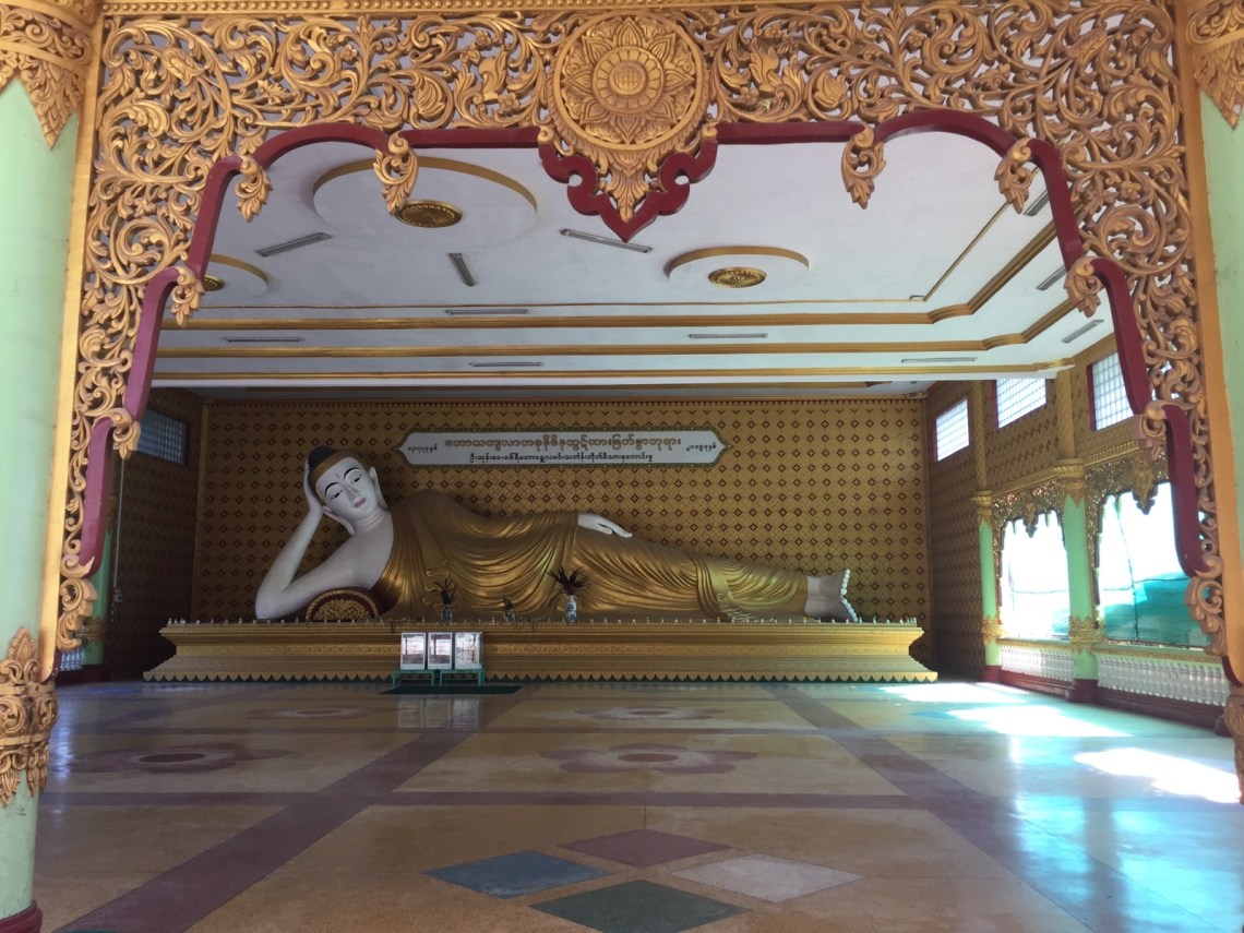 Heute morgen bin ich nach einem wieder sehr großen Frühstück in die Stadt gefahren. Eigentlich wollte ich das Fahrrad nehmen aber das Schloss war kaputt. Also hat mich ein Junge vom Hotel mit dem Mofa in die Stadt gefahren. Erst mal bin ich etwas planlos durch das Motorradgewirr und die vielen Stände gelaufen und wurde überall neugierig angeschaut. Wie irgendwie immer war ich die einzige Ausländerin 🙂 Bei maps.me habe ich dann den Weg zum See gefunden und auf dem Weg dorthin auch die Shwesandaw Pagode. Ja hier heißen viele Pagoden Shwesandaw. Das hat mit der dortigen Reliquie zu tun, dem goldenen Haar Buddhas. Shwe heißt Gold und das gesamt Wort so etwas wie Goldene Haarreliquie. Deswegen gibt es auch mehrere Shwesandaw Pagoden in Myanmar. Überall dort wo einmal der Überlieferung nach ein goldenes Haar Buddhas als Reliquie aufbewahrt wurde.