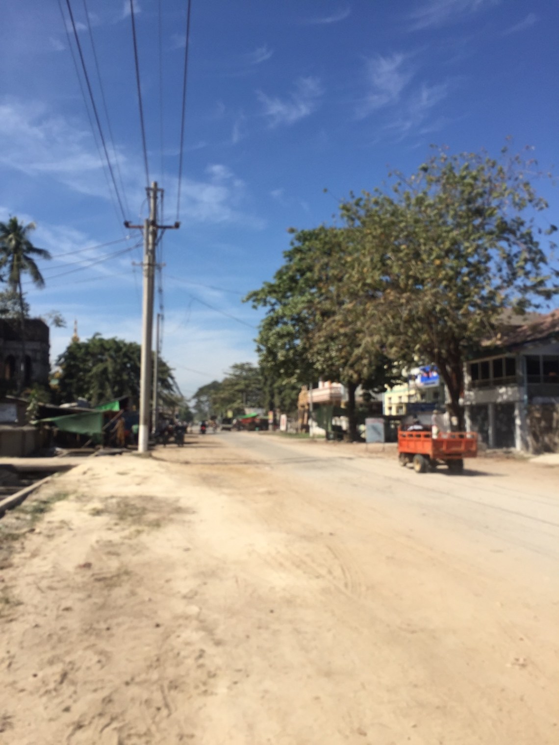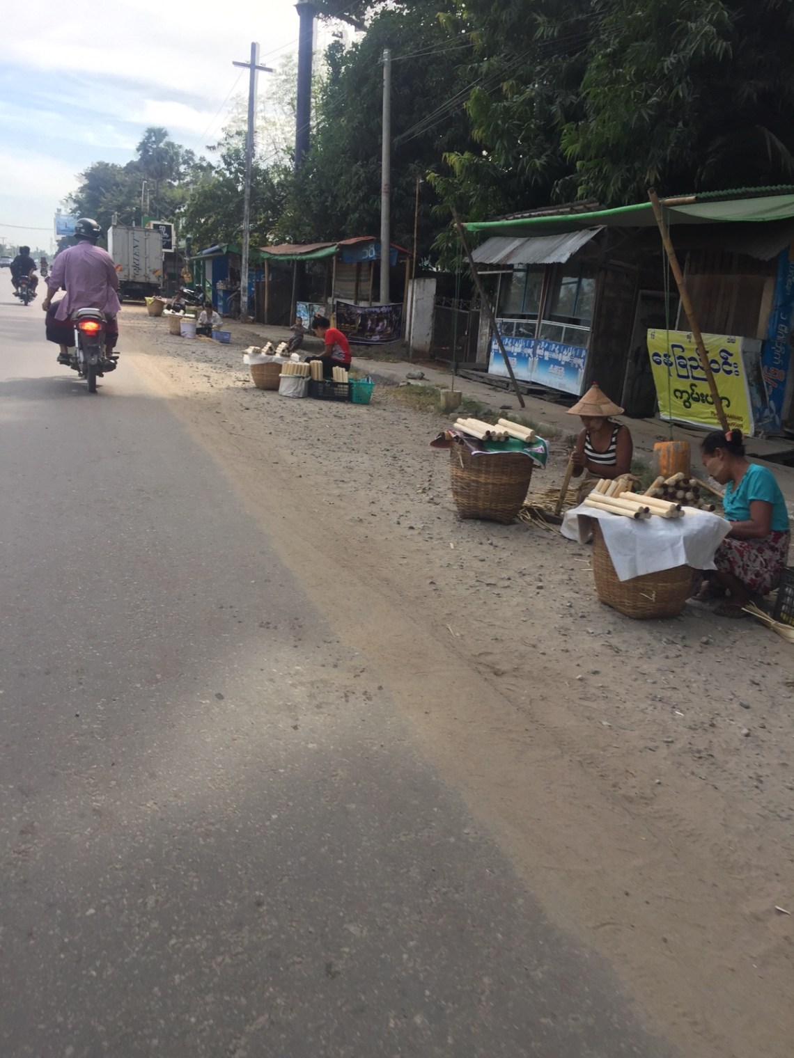 Schließlich bin ich über die äußere Hauptstraße zurück in Richtung Stadtmauer gelaufen und habe ein Taxi gesucht. Gefunden habe ich wieder nur eine Motorrad-Rikscha, aber bei Tageslicht hat es viel mehr Spaß gemacht. Ein Spaziergang durch Taungoo ist spannend weil man dort die Menschen bei ihrem täglichen Leben beobachten kann und das nochmal völlig anders ist als in einer Großstadt. Es gibt viele Stände mit Essen und allem was man so braucht, Werkstätten, Teestuben, Ziegen auf der Straße und einfach viele verschiedene Menschen, die einen alle meistens freundlich anschauen 🙂
