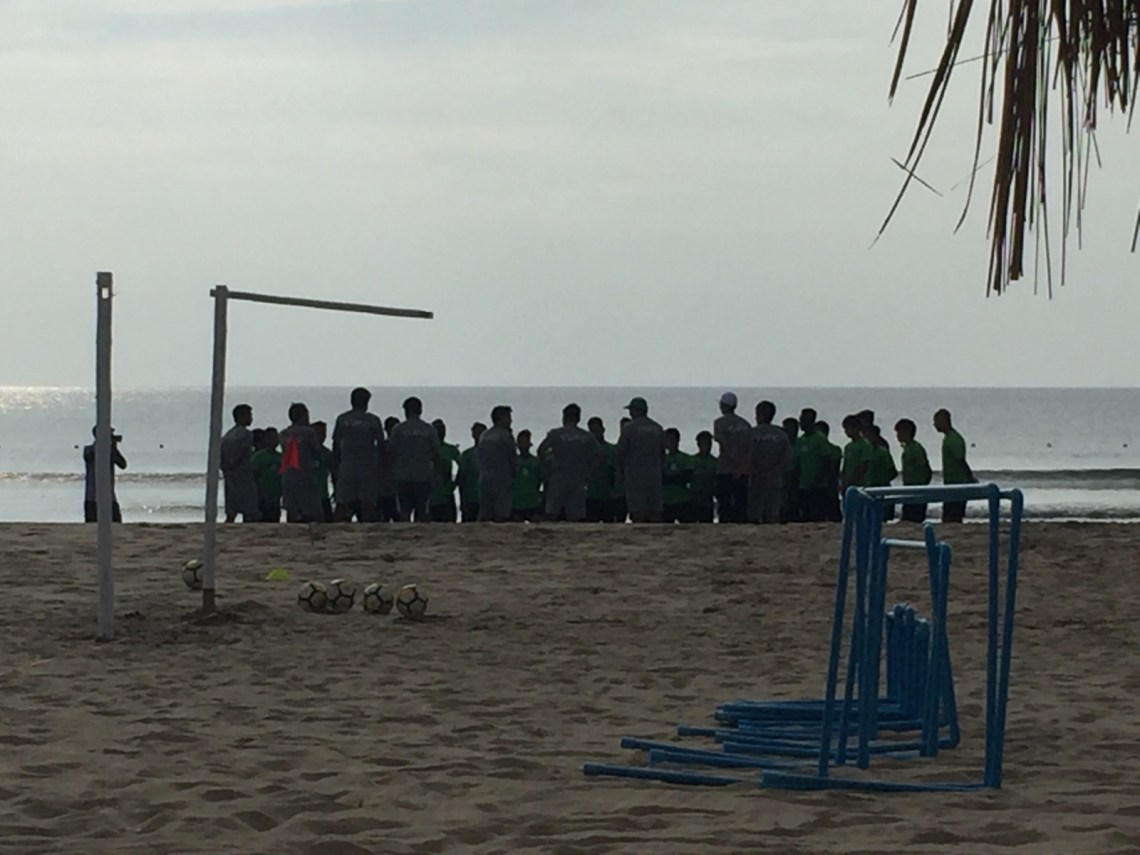 Wir sind also direkt zum Strand gelaufen. Der erste Eindruck war nicht so schön weil es schon sehr dreckig war und wir nur die Plastikstühle der lokalen Teestuben am Strand gesehen haben. Das lag aber an der Lage und weiter zur Strandmitte hin würde es besser und wir haben sogar Holzliegen vor einem Hotel gefunden die wir kostenlos benutzen durften. Getränke gab es dort auch. Wir wurden darauf hingewiesen dass wir uns lieber in die zweite Reihe legen sollen weil dort ein Fußballspiel stattfindet. Wir waren verwundert, hatten aber auch die Tore und den abgesteckten Bereich gesehen. Es hat sich heraus gestellt dass der FC Yangon United (Meister in Myanmar 2018) dort sein Trainingslager hat und abends am Strand trainiert. Nationalspieler waren auch dabei 🙂 Es war sehr lustig den Jungs beim Springen über Hürden und Fußballspielen zuzuschauen. Die Trainer waren sehr fordernd aber es wurde immer wieder gelacht und viele Fotos gemacht. Eine gute Unterhaltung 🙂 Auf dem Rückweg zum Guesthouse ging die Sonne unter und wir konnten einen wunderschönen Sonnenuntergang am Strand sehen. Und schon sah alles gar nicht mehr so schlimm aus 🙂