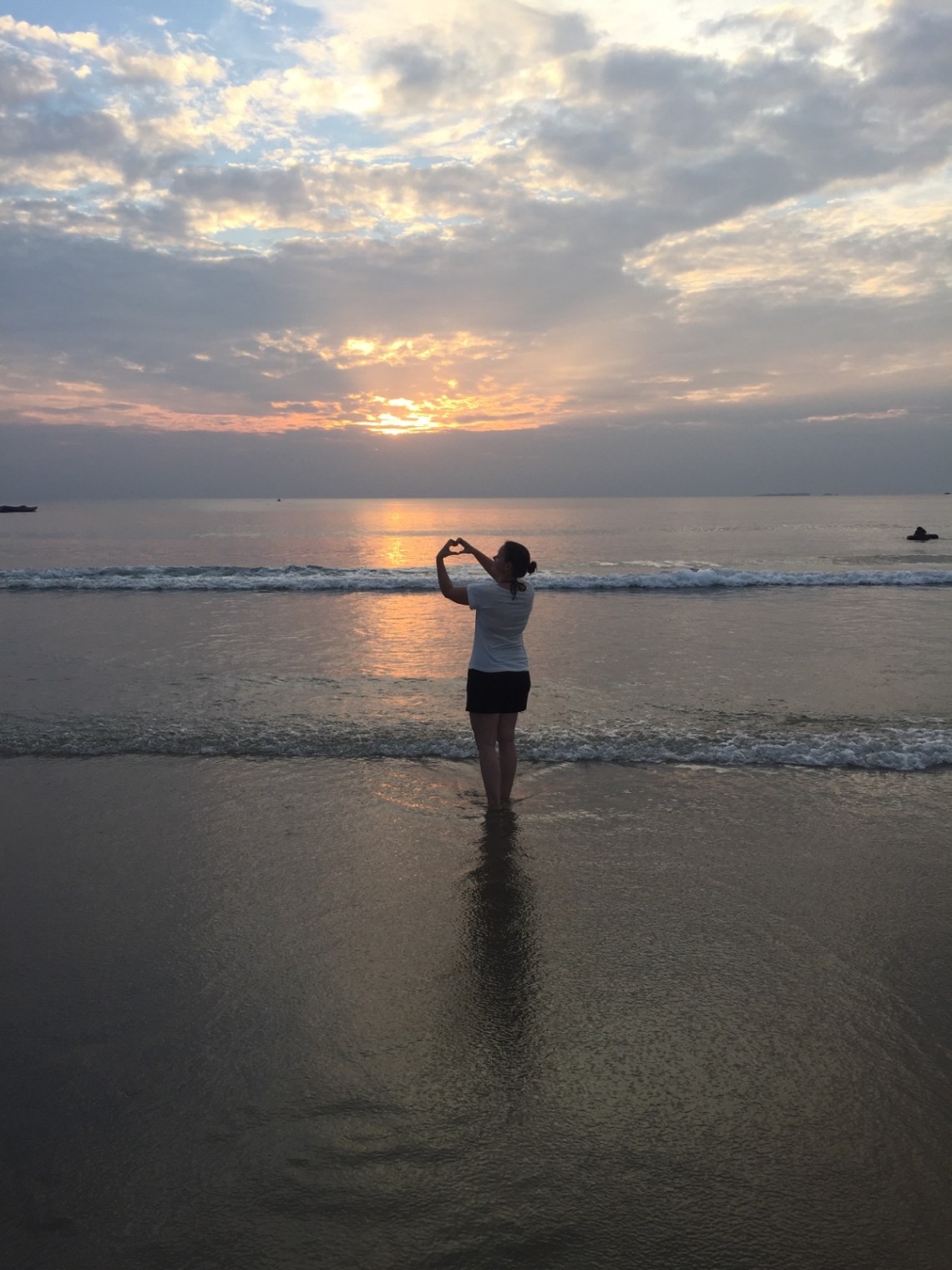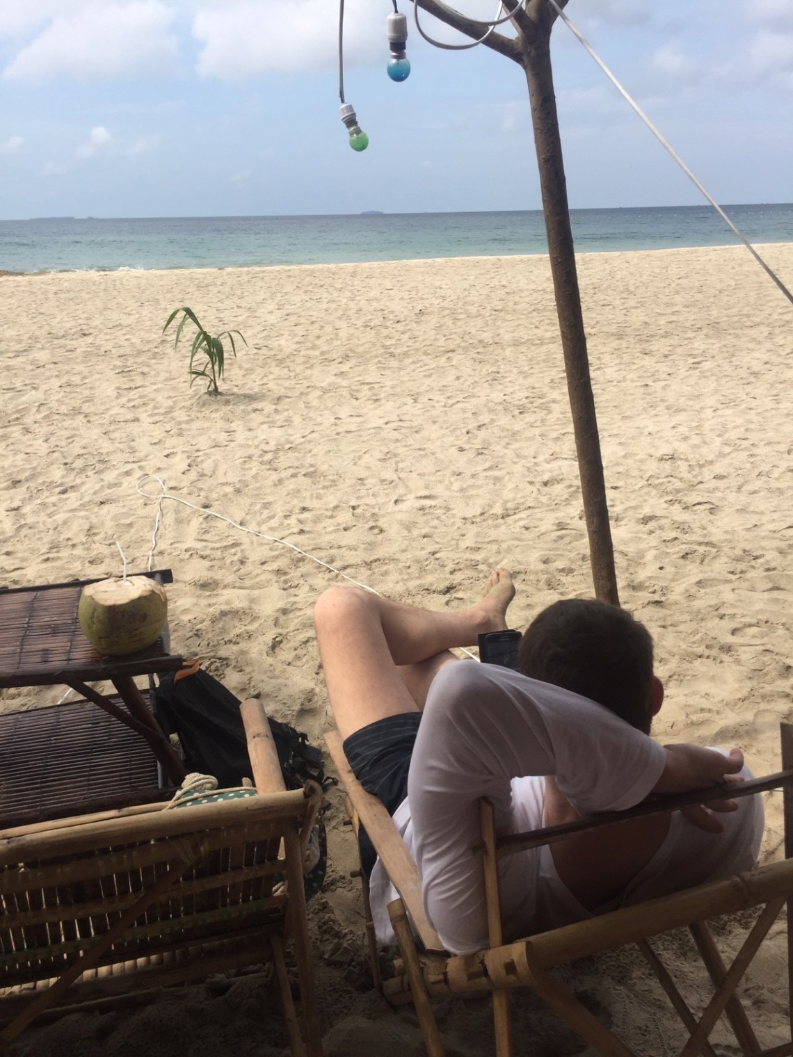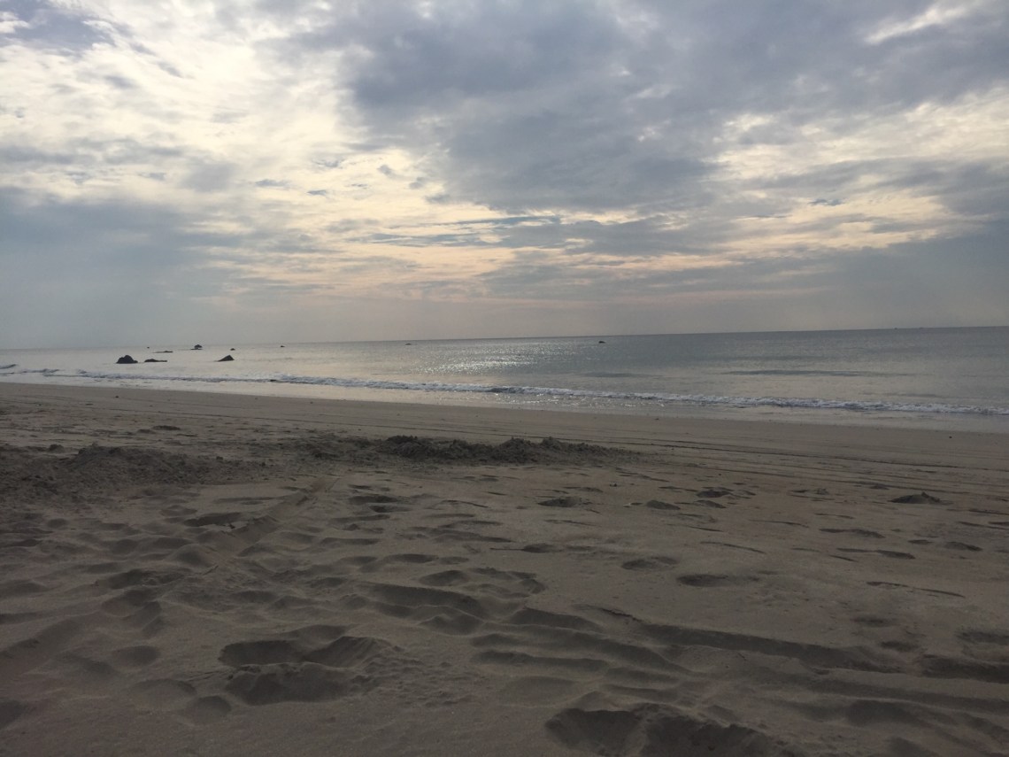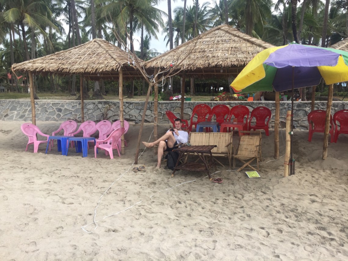 Am nächsten Morgen haben wir uns Fahrräder ausgeliehen und sind die Straße durch das Dorf entlang zur Mitte des Strandes gefahren. Dort gibt es die Zwillingspagoden und auch den schöneren Strand. Da es keinen direkten Weg zum Strand gibt muss man immer an einem Hotel fragen ob man durch die Anlage zum Strand laufen darf. War gar kein Problem und die Fahrräder durften wir auch dort an der Rezeption stehen lassen. Wir sind direkt bei den Zwillingspagoden gestartet. Der Strand war traumhaft und menschenleer. Endlich Entspannung 🙂 Man kann kilometerweit laufen ohne auf andere Menschen zu treffen. Nur ab und zu kommt mal ein Motorrad oder Pferde vorbei. Wir haben die Strandbad des Pearl Hotels gefunden und uns dort in die Holzliegestühle in den Schatten gesetzt. Getränke und Mittagessen gab es auch. Frische Kokosnuss, Papayasalat (unglaublich scharf) und Seafood-Curry. Mehr ging nicht 🙂 Nach 2 Stunden nichts tun im Liegestuhl haben wir uns auf den Sand gelegt und dort weiter entspannt. Es war traumhaft. Ein wunderschöner Strand, das Rauschen der Wellen, Krebse auf Futtersuche und Gittarenmusik im Hintergrund weil der Kellner sich so die Zeit vertrieben hat. Ein toller Moment!