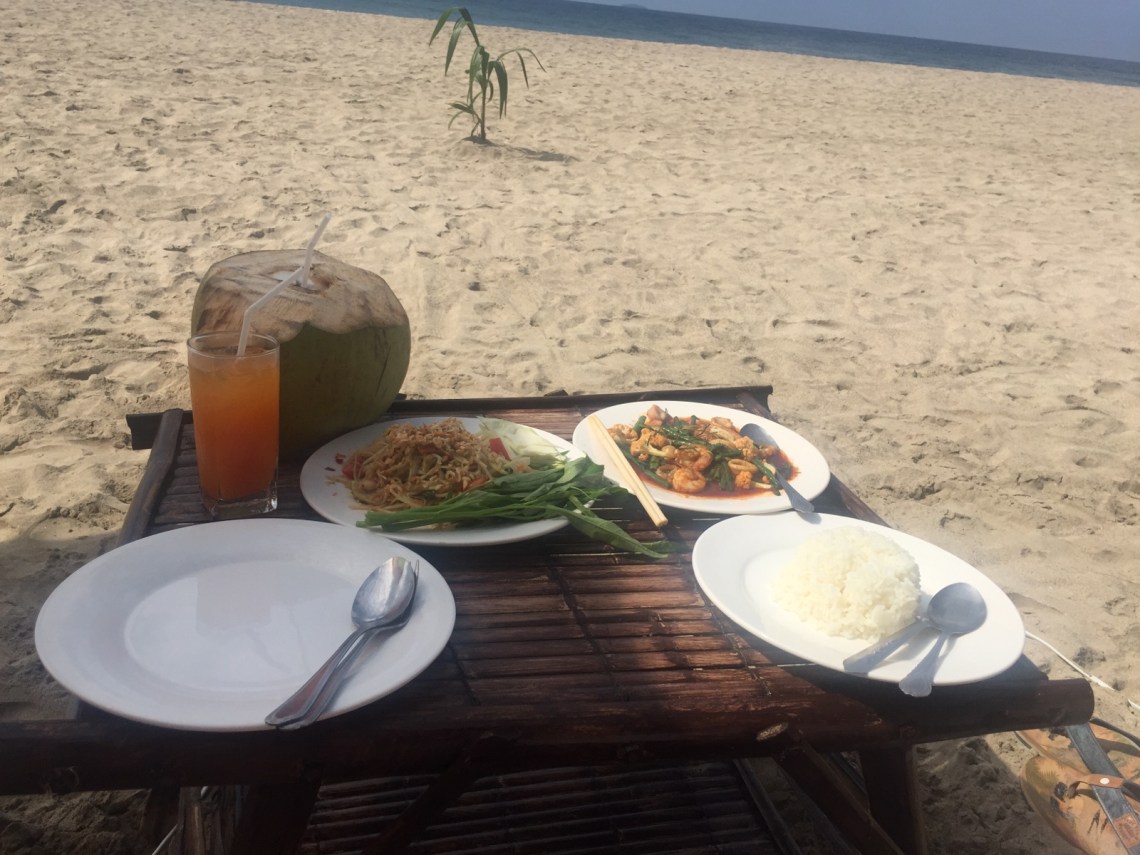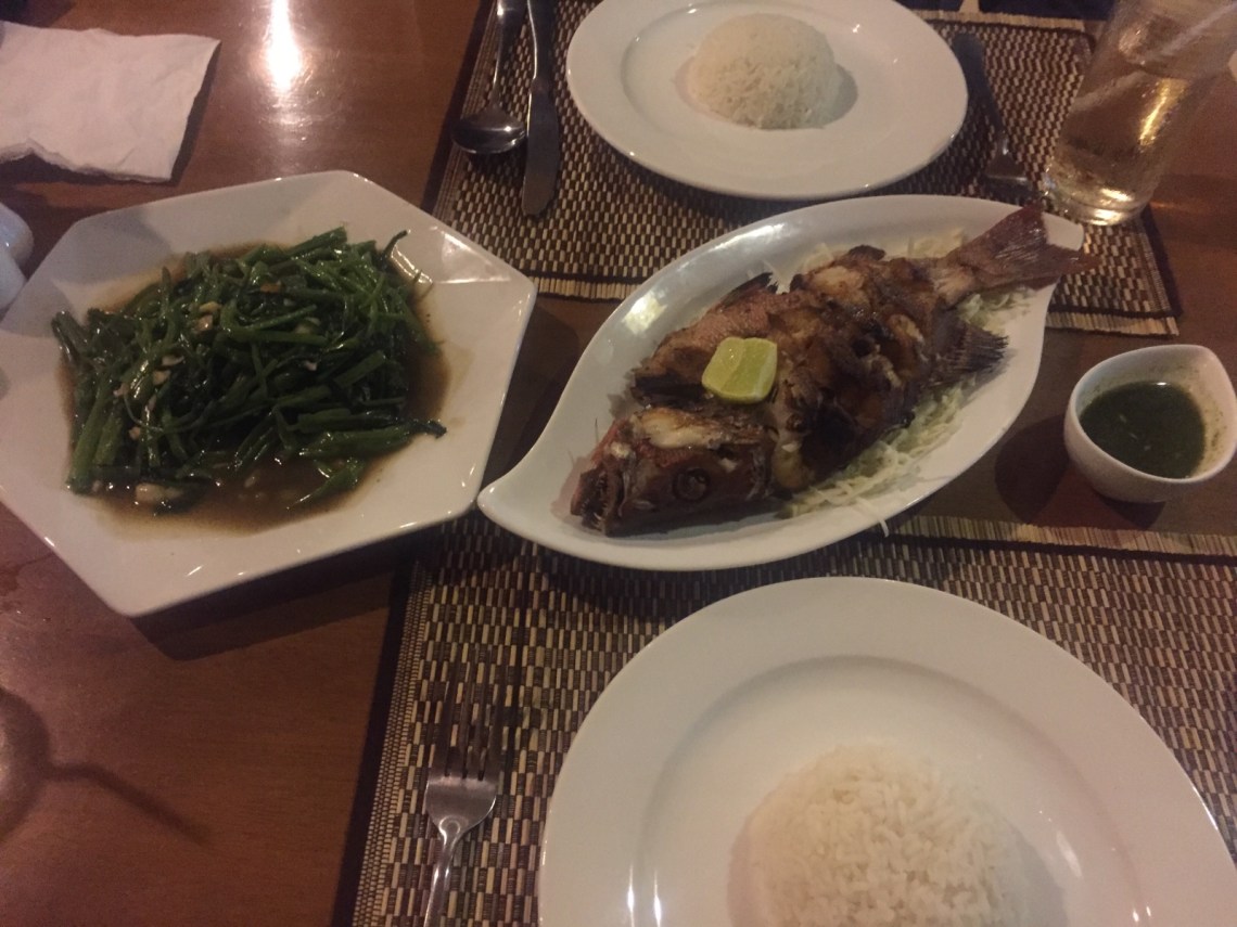 Als es Nachmittag war mussten wir zurück laufen und fahren da es keine Straßenlampen gibt und die Fahrräder kein Licht haben. Es war schön durch das Dorf und die Felder zu fahren. Abends waren wir im Home Food Restaurant und haben dort frischen gegrillten Fisch und Morning Glory gegessen. Seafood am Meer, war klar 🙂