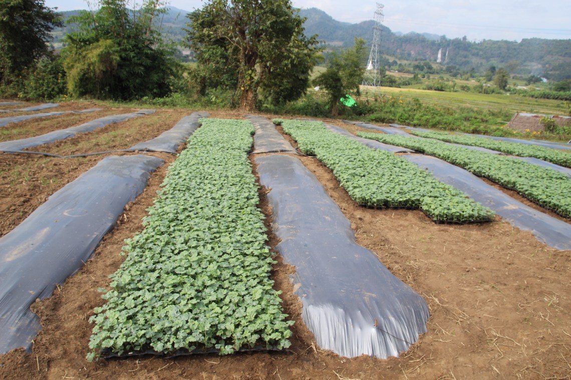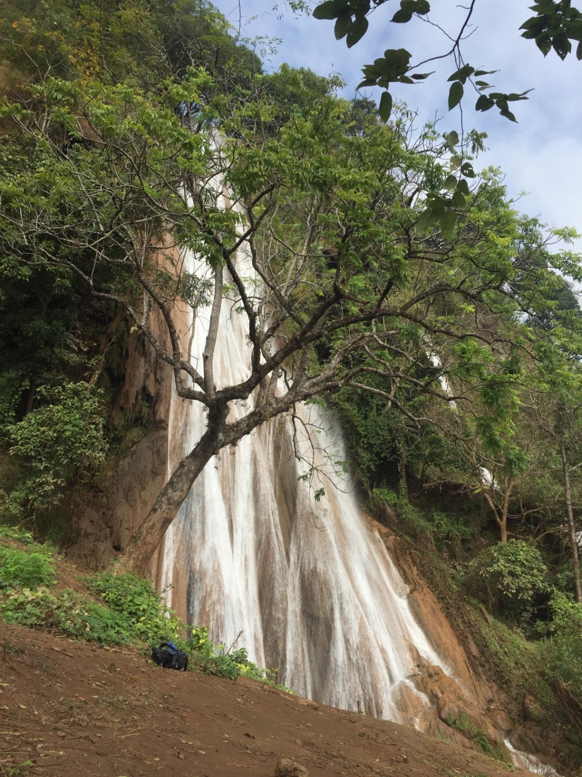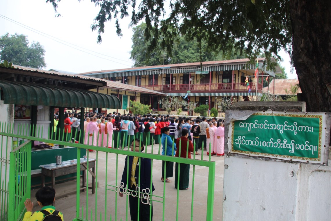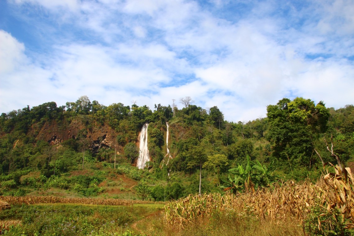 Es war ein halber Tag geplant mit einer Wanderung durch die Reisfelder, zum Wasserfall und durch viele kleine Dörfer. Cho hat uns morgens im Guesthouse abgeholt und wir sind durch Hsipaw zu den Feldern gelaufen. Auf dem Weg haben wir den morgendlichen Gesang in den Schulen hören und sehen können, einen fahrenden Motorradmarkt gesehen, die Produktion von Kimchi, viele freundliche Menschen die uns neugierig angeschaut und angelächelt haben und konnten die frische Bergluft genießen. Der Besuch vor der Schule war lustig. Zwei Schüler kamen zu spät und sind mit hängendem Kopf zu dem anderen singenden Schülern geflitzt nachdem die Direktorin ihnen das verschlossene Tor geöffnet hat 🙂 In der Nähe sind wir an getrockneten Sojapaste-Fladen vorbei gekommen. Sie lagen auf einem Gitter in der Sonne. Cho hat uns erklärt dass die Sojabohnen eine Nacht eingelegt werden und dann mit verschiedenen Kräutern wie Koriander, Zwiebeln, Knoblauch und Chili vermischt und zu einem Brei gerührt werden. Dann werden aus dem Teig dünne runde Fladen geformt und in die Sonne zum trocknen gelegt. Wir sind aus dem Dorf raus Richtung Felder gelaufen und mussten durch den Friedhof, da die Straße dort hindurch geführt hat. Es fahren auch Motorräder durch, es ist also kein geschlossener Ort wie bei uns. Der Friedhof ist unterteilt in muslimische Gräber, chinesische und buddhistische. Es war etwas komisch an den vielen Gräbern mit Fotos vorbei zu laufen. Aber hier hat man eine andere Beziehung zum Tod. Danach geht es ja schließlich weiter 🙂 Dann ging es den Berg hinauf zu den Feldern, wo gerade Mais geerntet wird und vorbei an Auberginen und Tomaten Feldern. Es gibt hier so viele Gemüsefelder und Obstanbau, Mais und selbstverständlich auch Reis. Die Felder sind groß und werden professionell aber traditionell bewässert. Landwirtschaft ist hier die größte Einnahmequelle da die Ernte in das nahegelegene China gebracht wird. Vor allem die Wassermelonen. Ich habe hier zum ersten Mal Wassermelonenfelder gesehen 🙂 Der Weg zum Wasserfall hat uns auch an kleinen Häusern und Holzhütten vorbei geführt. Dort hat uns Cho drei Damen vorgestellt die in einer Hütte am Wegrand wohnen und gerade Tee gekocht haben. Sie haben uns eingeladen und uns viele Fragen wie zb was wir so in Deutschland frühstücken gestellt. Cho hat übersetzt. Wir sind auch an kleinen Flüssen mit Mini-Wasserkraftwerken vorbei gelaufen. Man rechnet an einer Holzhütte einfach nicht mit einem kleinen Wasserrad das Strom produziert mitten im Feld. Aber wie alles hier ist es einfach anders und überraschend 🙂 Cho hat uns alle Pflanzen erklärt und ich weiß jetzt sogar wie Senf aussieht und dass man die Blätter der Pflanze essen kann, meistens in einer Suppe. Sesampflanzen haben wir auch gesehen.
