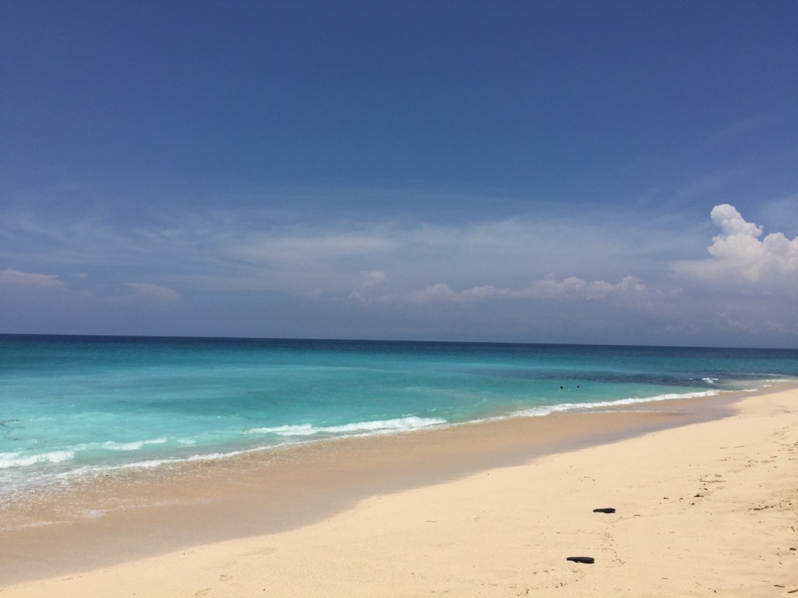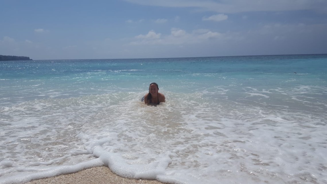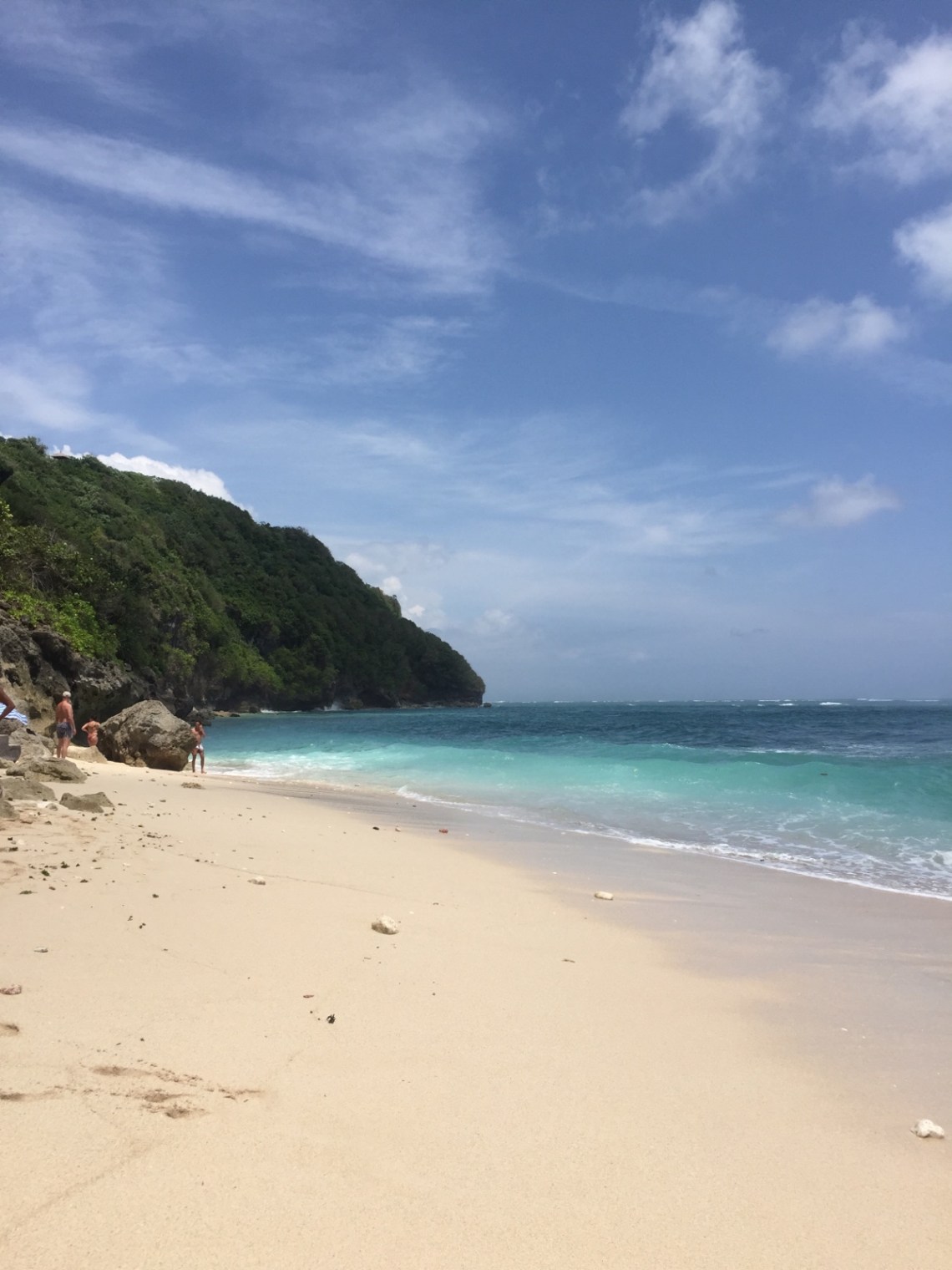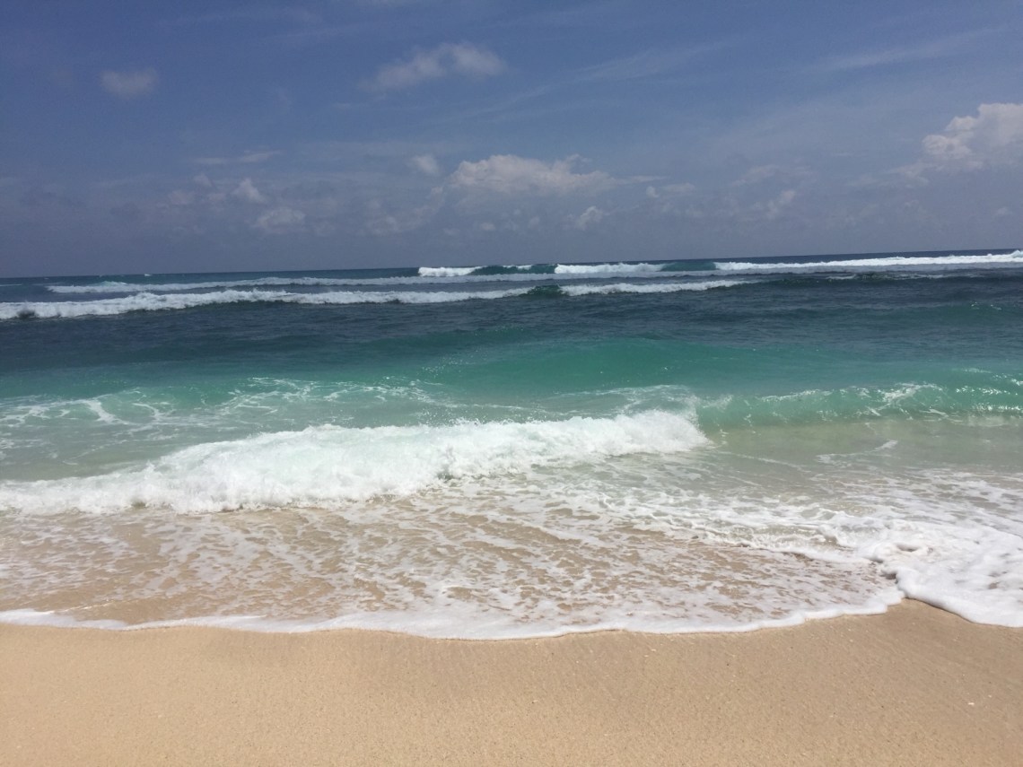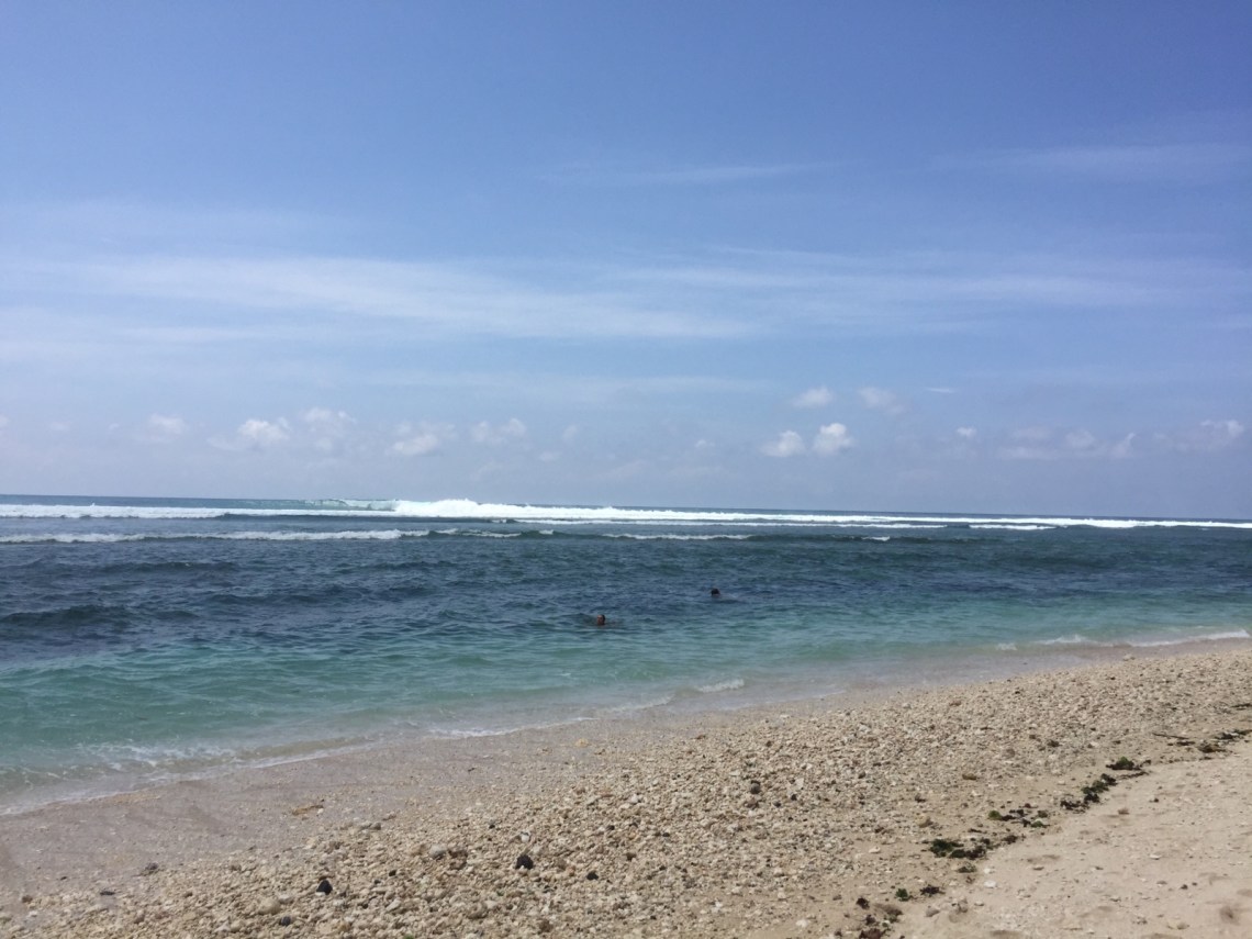 So vollgefuttert sind wir dann an den Dreamland Beach gefahren. Der Strand ist etwas weiter entfernt aber dafür haben wir ja das Auto. Vom Parkplatz aus, den man über den Weg zum Wyndham Hotel erreicht, muss man noch an einigen Verkaufsständen vorbei und kommt dann am grandiosen Sandstrand an. Die Liegen mit Schirm sind etwas teuer. Pro Liege 100000 Rupiah, ca 6 Euro. Der Strand ist sehr schön allerdings gibt es dort hohe Wellen und Strömung. Macht super viel Spaß sich dort hin und her werfen zu lassen, allerdings sollte man nur als guter Schwimmer ins Wasser gehen oder am Rand bleiben.