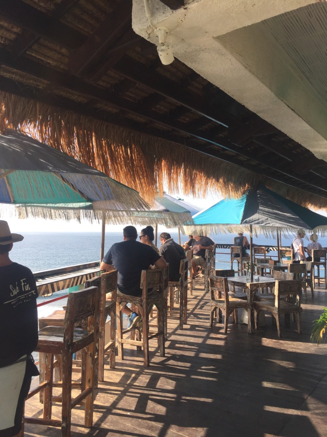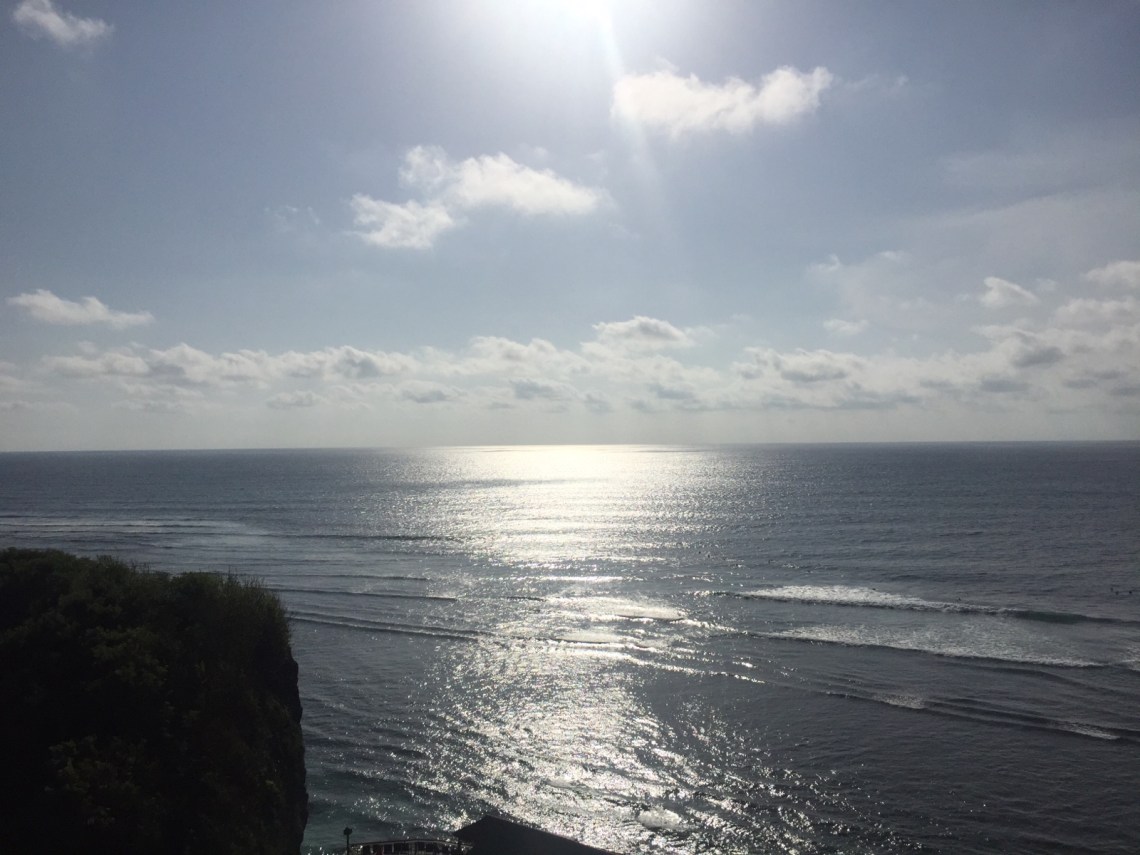 Zum Strand runter ging es über ein paar Treppen und Stufen zwischen den Klippen durch. Leider hatten wir keine Badesachen dabei weil wir erst mal schauen wollten wie es dort so aussieht. Es war sehr voll aber der Strand war toll. Türkisblaues Wasser, Klippen, Sandstrand und viele Surfer. Ja Uluwatu ist ein Surfer Paradies mit vielen tollen Stränden die meistens eher aufgrund der Strömung und den Wellen zum Surfen anstatt zum schwimmen geeignet sind. Ohne Badesachen war es also etwas doof und so sind wir zur Single Fin Bar gefahren, die oberhalb des Uluwatu Strandes liegt. Von dort aus kann man gemütlich einen Fruchtsaft schlürfen und den Surfern zuschauen. Grandiose Aussicht!
