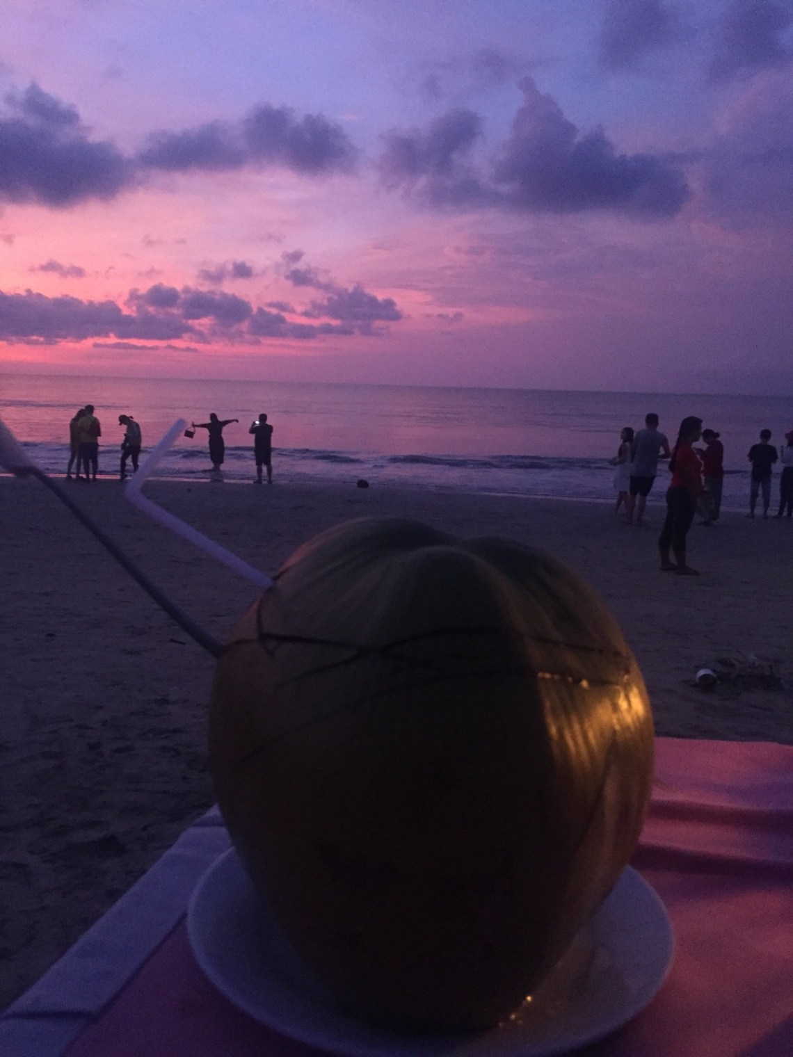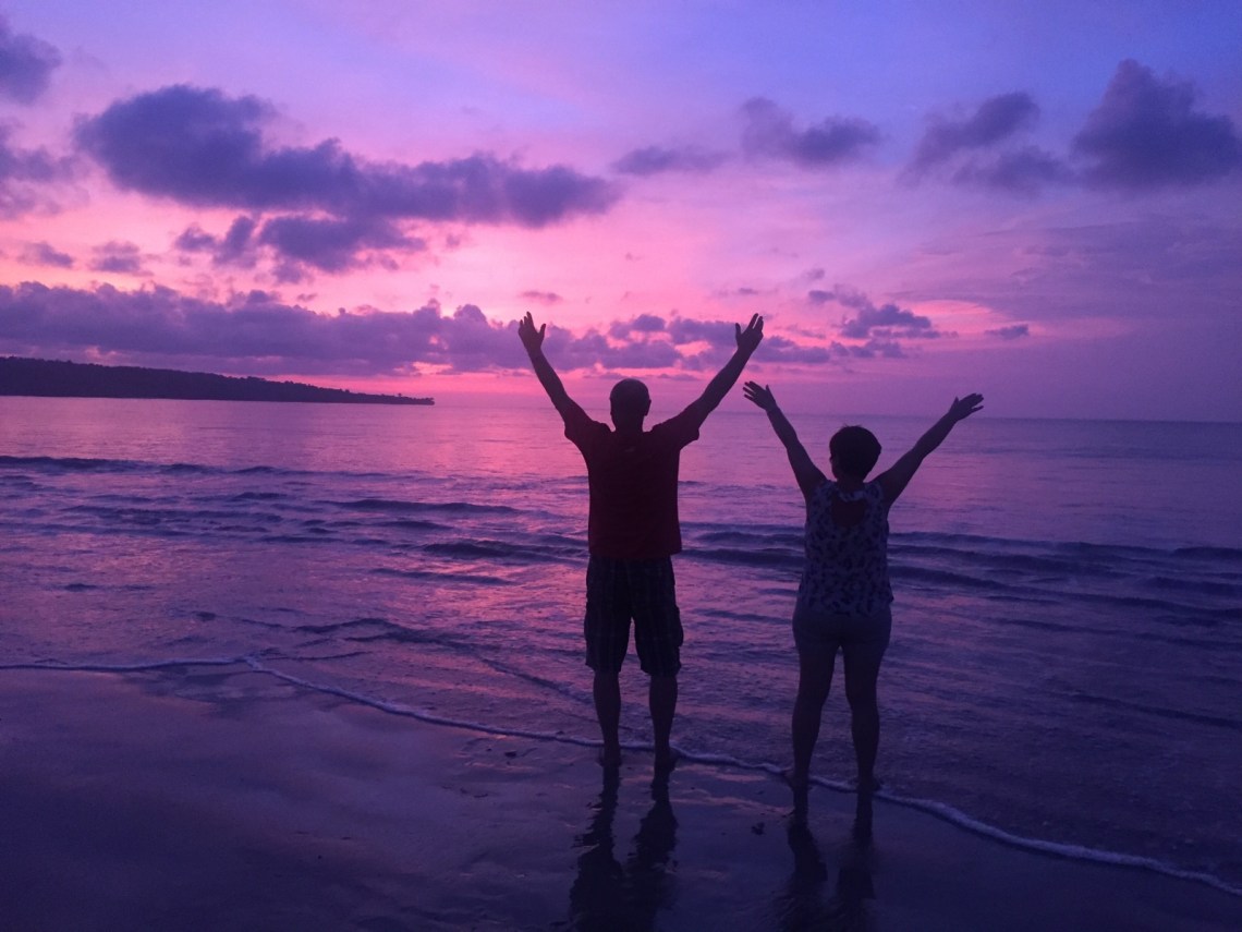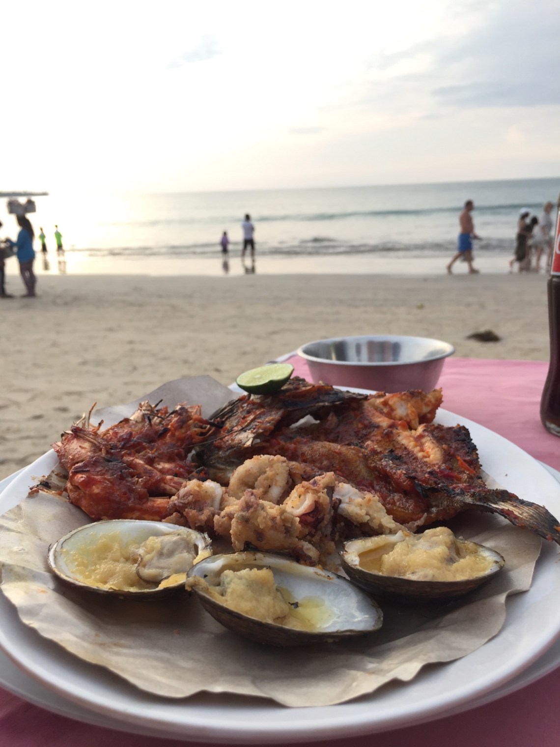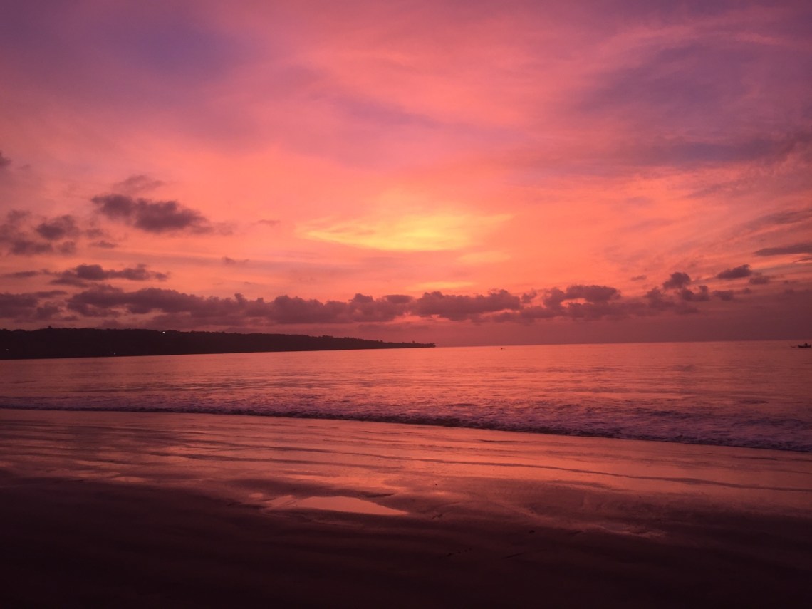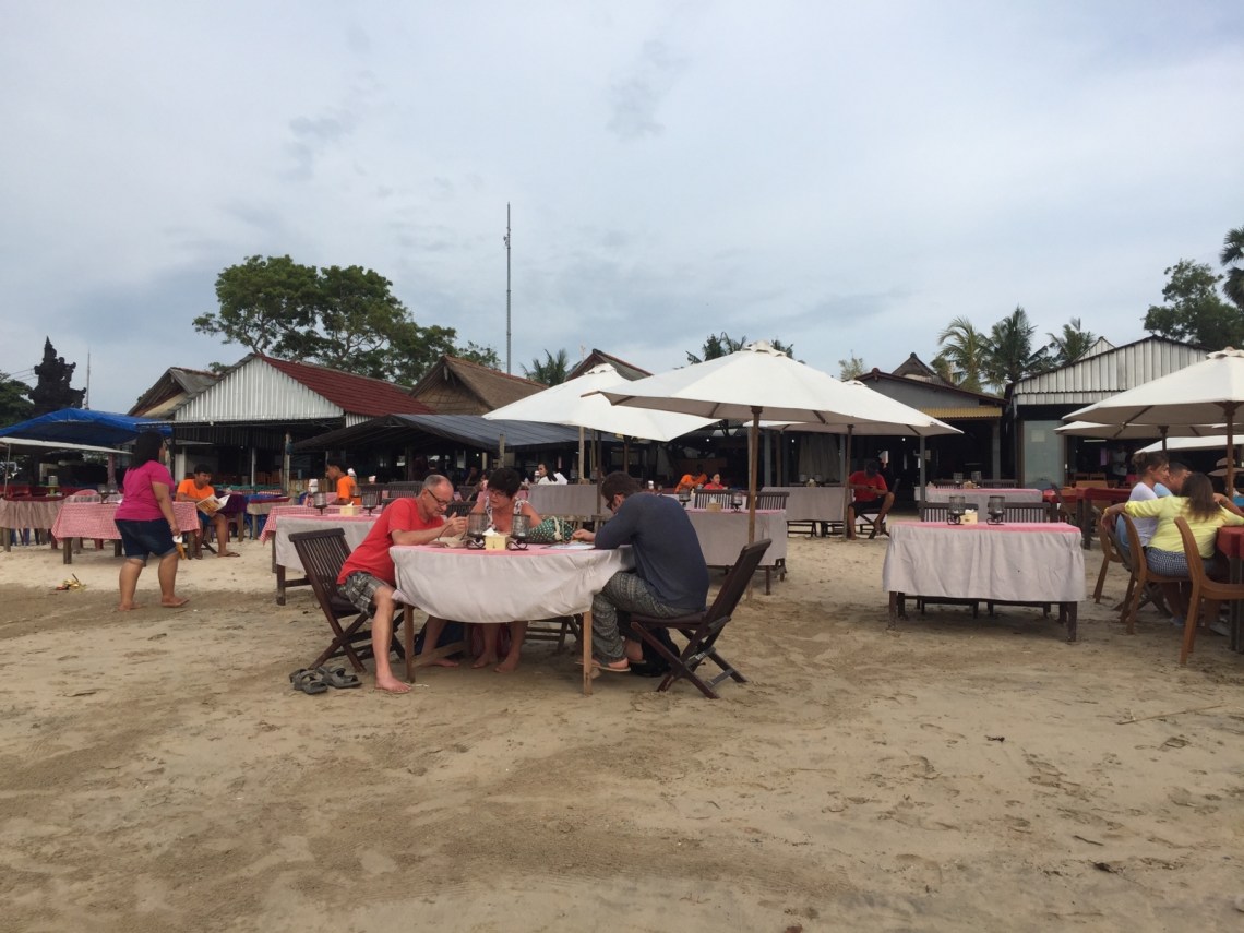 Auf dem Rückweg haben wir den Stop fürs Abendessen am Jimbaran Strand gemacht. Der Strand ist sehr weitläufig und es gibt dort ein Seafood-Restaurant nach dem anderen. Man sucht sich einfach eins aus und setzt sich an einen Tisch am Strand und geniest leckeren frischen Fisch, ein Bier und schaut mit Füßen im Sand den Sonnenuntergang an. Wunderschön entspannt und ein perfekter Moment. Tolle Fotos kann man natürlich auch machen 🙂