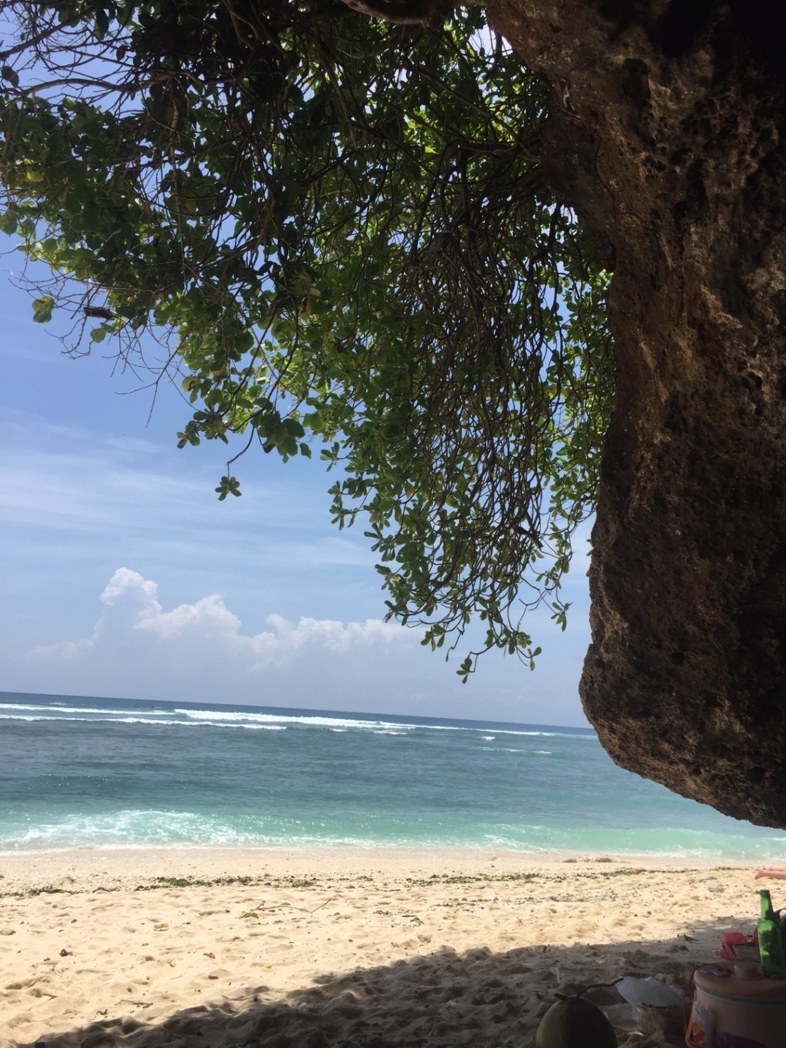 Dann sind wir zu einem der schönsten und bekanntesten Strände hier in Uluwatu gefahren. Dem Green Bowl Beach. Trotz seiner Bekanntheit ist dort nie viel los weil man über 200 Treppenstufen hinab steigen muss. Und logischerweise auf dem Rückweg auch wieder hinauf.. Aber es lohnt sich. Die Aussicht auf die von allen Seiten hereinbrechenden Wellen ist gigantisch. Es gibt dort eine Höhle in der man sich in den Schatten legen kann. Von dort aus kann man chillen und einfach den Surfern zuschauen. Sehr entspannend. Die Wellen sind sehr hoch dort und die Strömung kommt von allen Seiten. Außerdem sind Steine am Strand was es etwas schwierig macht ins Wasser und wieder raus zu kommen. Man muss aufpassen dass man nicht abgetrieben wird oder gegen einen der vielen großen Steine geschleudert wird. Im Wasser ist es also nicht so entspannt aber trotzdem lustig und erfrischend. Man muss nur ein bisschen aufpassen. Für Surfer allerdings ein Traum 🙂 Für mich der schönste Strand zum entspannen weil ich es mag einfach nur den Wellen zuzuschauen. Wer feinen Sandstrand und flaches ruhiges Wasser mag wird es dort wohl nicht so gut finden.