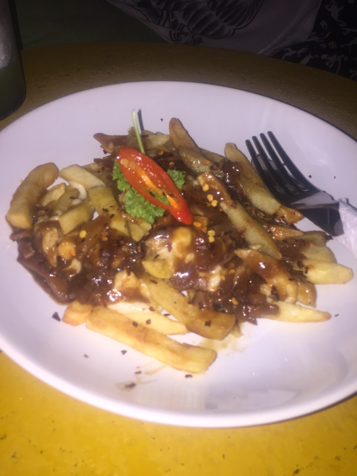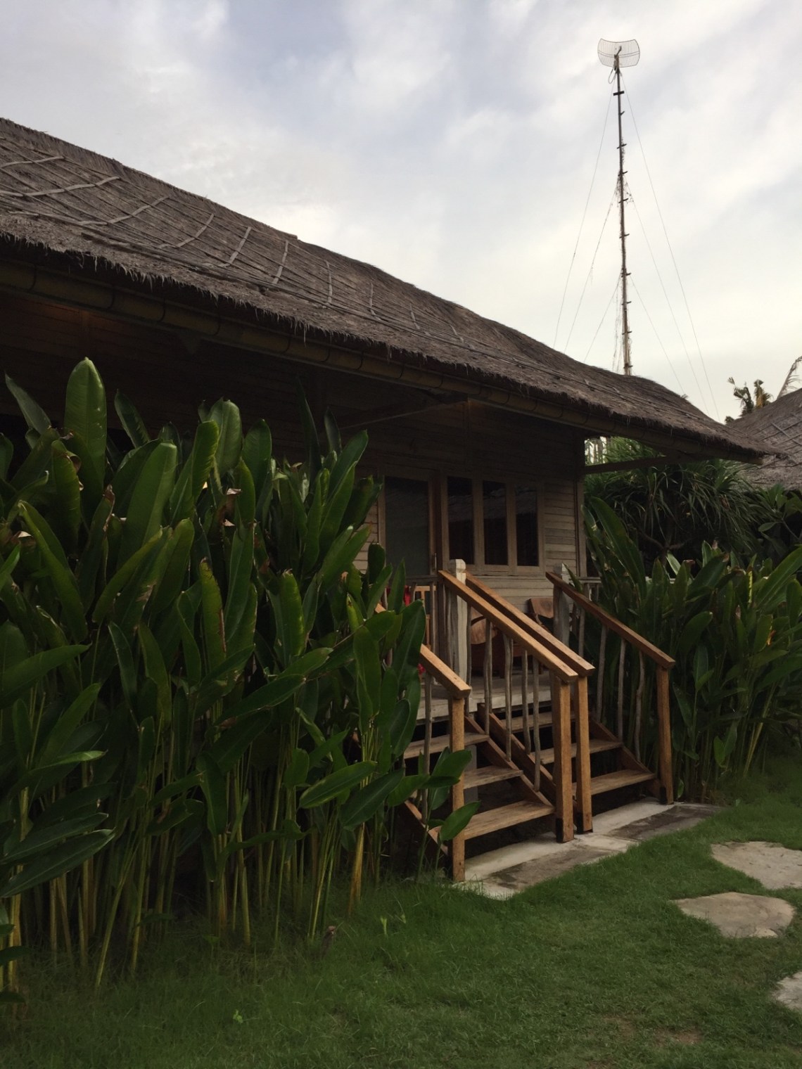Den Rest des Tages lag ich mit Erkältung flach. Mario, der Manager hier, der auch deutsch spricht, war sehr nett und hat mir einen Tee mit Kurkuma und Ingwer gemacht. Abends waren wir mal kurz im Green Garden um etwas gesundes zu essen. Vitamine sind ja wichtig bei Erkältung. Außerdem gibt es dort Jamu. Kurkuma ist hier die Waffe gegen alles. Auf dem Rückweg fiel der Strom aus, wie öfter hier. Als wir im Hotel ankamen kam und Mario schon entgegen um die schlechte Nachricht zu überbringen. Aber wir sind das ja schon gewohnt und finden es nicht schlimm. Leider geht dann die Klimaanlage nicht… Da es nur im Restaurant Licht gab, haben wir uns an die Bar gesetzt und von Mario noch einen Jamu bekommen. Überhaupt wird sich hier ganz toll um uns gekümmert und alle Wünsche erfüllt. Da es auf der Insel nur Salzwasser gibt, auch aus der Dusche und Wasserhahn, habe ich sogar einen Kanister mit frischem Wasser bekommen wegen meiner Neurodermitis, damit ich nach dem Duschen und Gesicht waschen das Salzwasser abspülen kann. Super nett. Eigentlich hatte ich nur gefragt ob es Salzwasser ist und hatte mich schon damit abgefunden meine Flasche jeden Tag vorher aufzufüllen dafür, aber Dana hat sofort angeboten mir einen Kanister ins Bad zu stellen. Wirklich super.