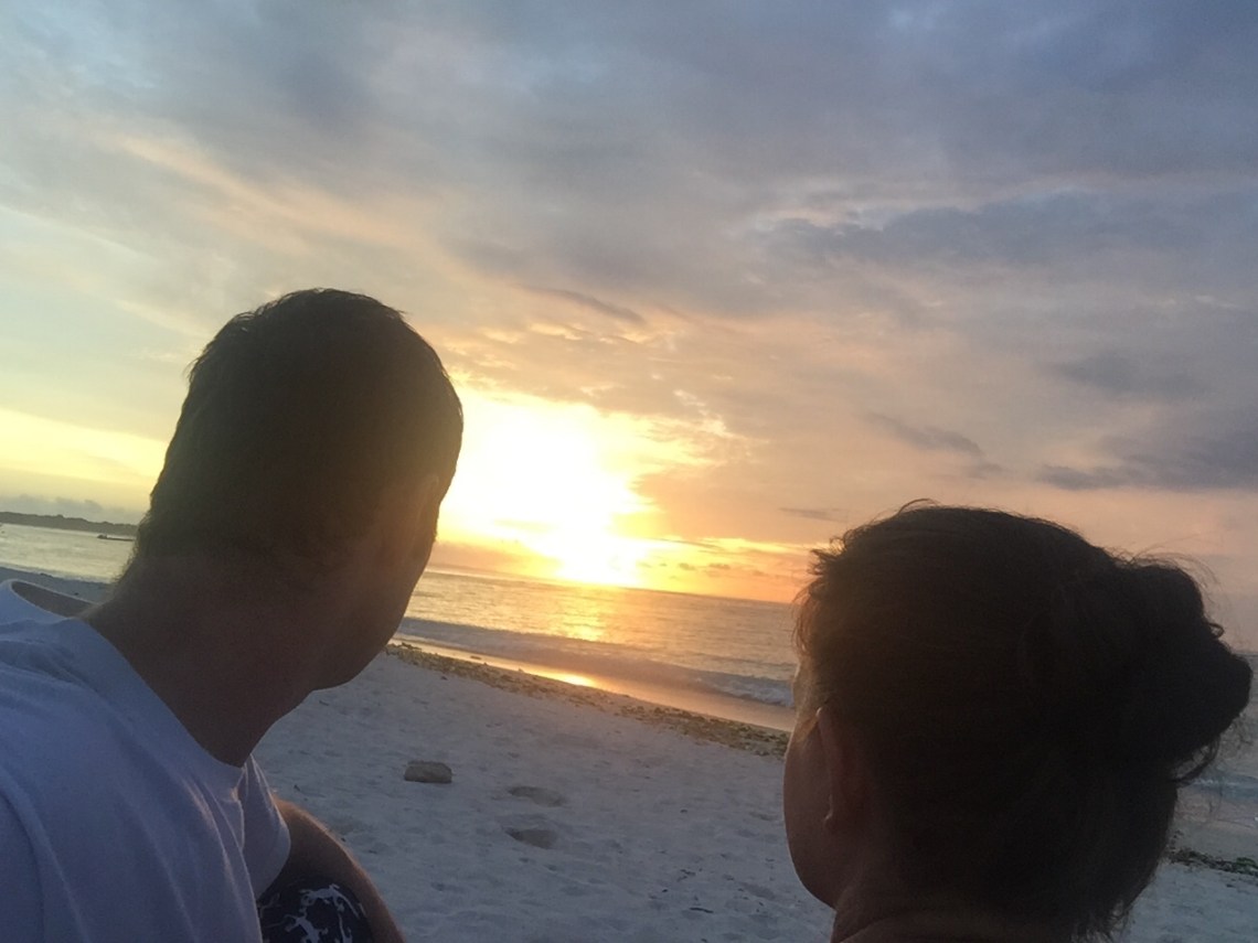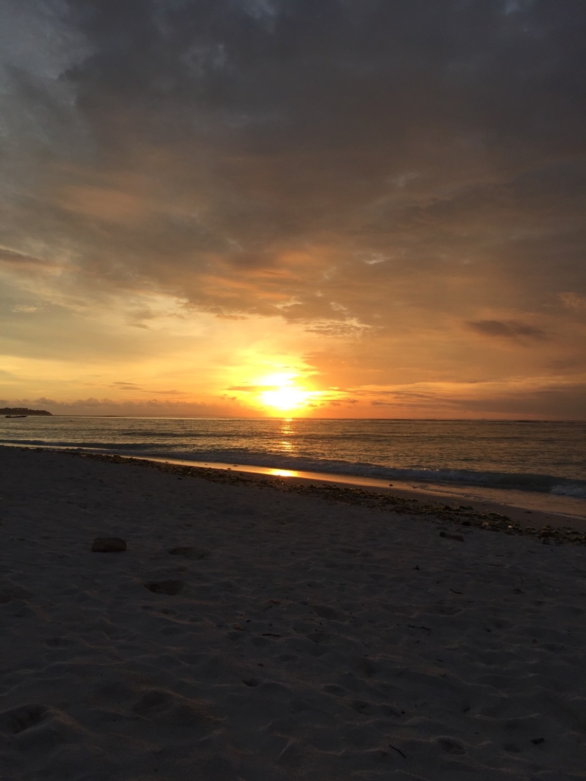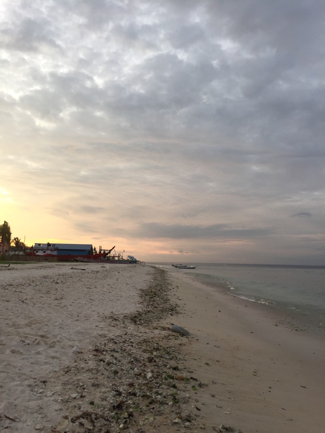 Abends sind wir zum Strand gelaufen, der direkt gegenüber ist. Beim Namen sind wir uns nicht sicher ob er Pasir Puthi oder Mahagiri heißt… Auf jeden Fall oberhalb vom Paradise Beach. Der Strand ist sehr weiß von den vielen kleinen Korallen weswegen man etwas aufpassen muss beim drüber laufen. Aber es ist wunderschön und wir haben einen traumhaften Sonnenuntergang erlebt. Wir sind vorbei an spielenden Kindern, alten Booten und Holzhäusern vor denen die Einheimischen ihr Abendessen vorbereitet haben. Schließlich sind wir in der Blue Corner Strandbar mit großen Kissen im Sand gelandet und haben dort frischen Saft und Pommes mit Rindfleischsoße gegessen. Das war sehr lustig, denn dieses Gericht kennen wir eigentlich nur aus einem kleinen Dorf in Hessen, direkt neben dem kleinen Dorf in dem wir wohnen und dort gibt es Pommes mit Hackfleischsoße schon seit Jahrzehnten und heißt dort „Gematscheltes“. Gothie und Petti, wir haben an euch gedacht 🙂