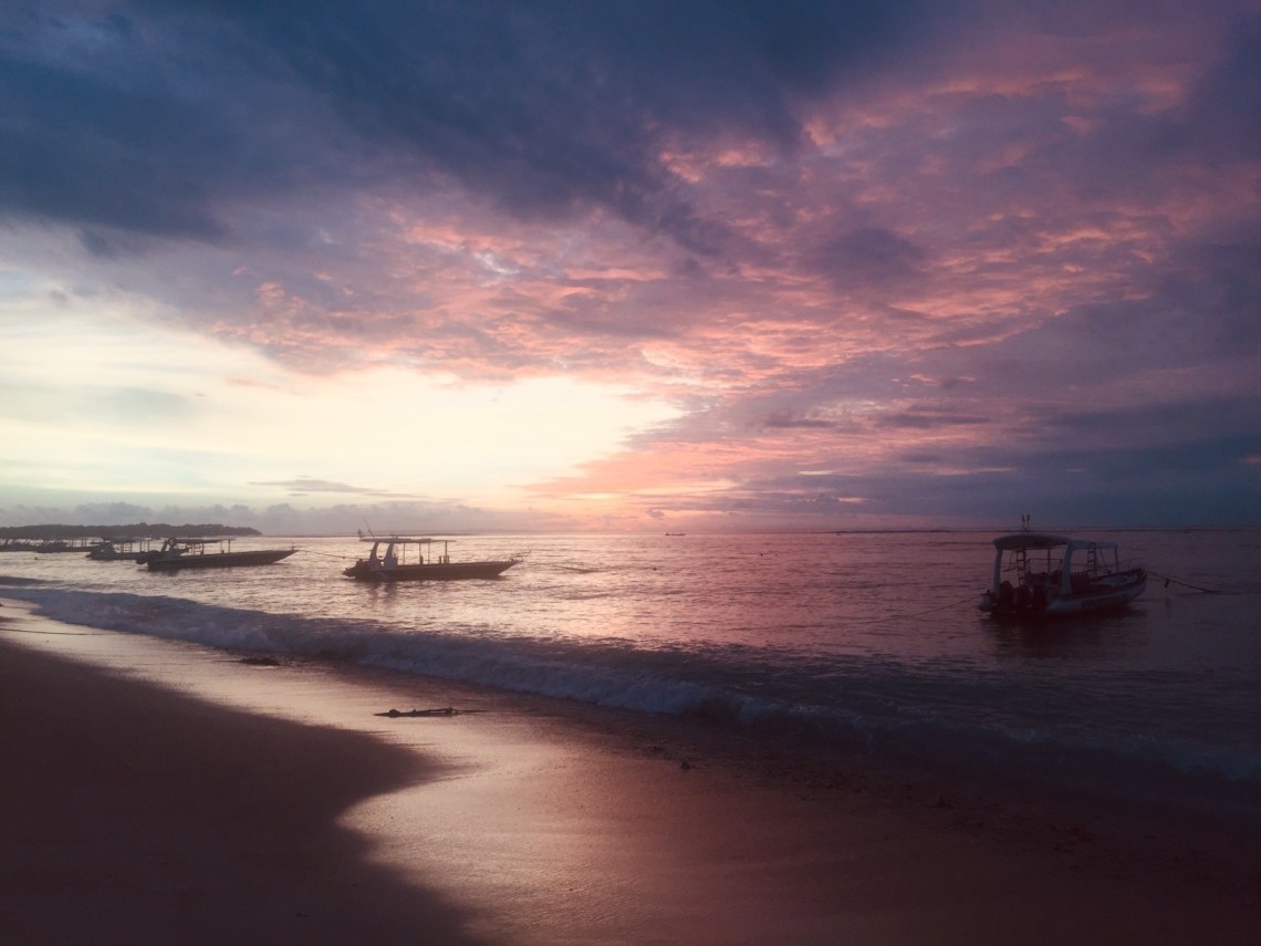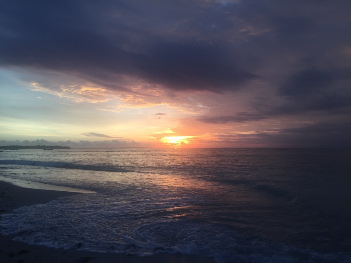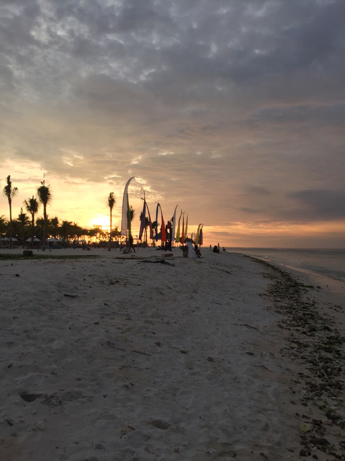 Abends sind wir zum Strand gelaufen, der direkt gegenüber ist. Beim Namen sind wir uns nicht sicher ob er Pasir Puthi oder Mahagiri heißt… Auf jeden Fall oberhalb vom Paradise Beach. Der Strand ist sehr weiß von den vielen kleinen Korallen weswegen man etwas aufpassen muss beim drüber laufen. Aber es ist wunderschön und wir haben einen traumhaften Sonnenuntergang erlebt. Wir sind vorbei an spielenden Kindern, alten Booten und Holzhäusern vor denen die Einheimischen ihr Abendessen vorbereitet haben. Schließlich sind wir in der Blue Corner Strandbar mit großen Kissen im Sand gelandet und haben dort frischen Saft und Pommes mit Rindfleischsoße gegessen. Das war sehr lustig, denn dieses Gericht kennen wir eigentlich nur aus einem kleinen Dorf in Hessen, direkt neben dem kleinen Dorf in dem wir wohnen und dort gibt es Pommes mit Hackfleischsoße schon seit Jahrzehnten und heißt dort „Gematscheltes“. Gothie und Petti, wir haben an euch gedacht 🙂