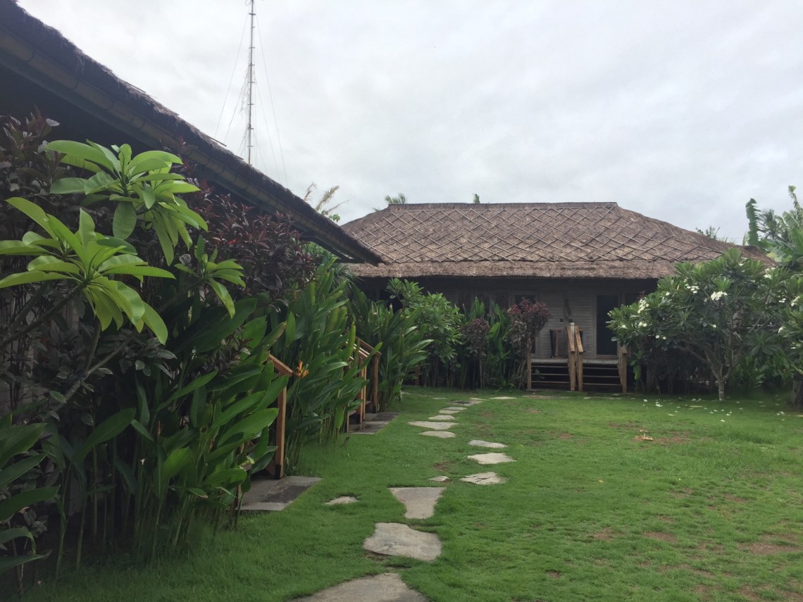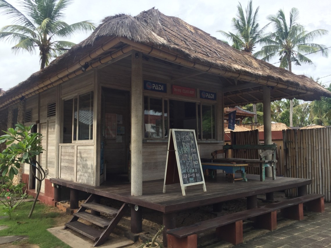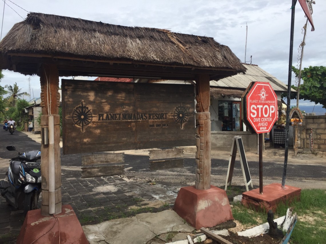 Unser Hotel ist das Planet Nomadas und ist im Norden von Lembongan. Es hat eine Tauchschule und ist, wie der Name schon vermuten lässt, spanisch. Aufgrund der sehr guten Bewertungen und der ruhigen Lage haben wir uns dafür entschieden und auch wegen der Tauchschule. Es gibt nur 6 Bungalows in einer Gartenanlage, was es sehr familiär und entspannt macht. Wir wurden sehr freundlich und fröhlich vom Besitzer Dana empfangen und haben sogar einen typisch indonesischen Drink zur Begrüßung bekommen. Einen Jamu, das National-Heilgetränk hier 🙂 Besteht aus Kurkuma, Ingwer, Tamarinde und Limette. Wir konnten auch sofort den Bungalow beziehen. Es gibt ein offenes Bad mit Dusche und ein Bett mit Moskitonetz und Klimaanlage und Ventilator. Also alles bestens 🙂 Frühstück ist sogar mit im Preis was nicht in der Bestätigung stand. Überraschung 🙂