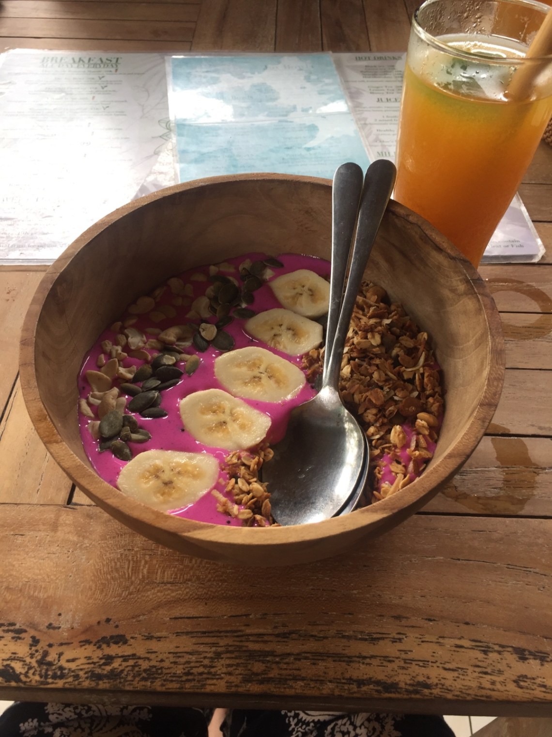 Heute fahren wir weiter nach Nusa Ceningan, die kleine Insel die mit Nusa Lembongan über eine Brücke verbunden ist. Aber vorher gönne ich mir noch einen leckeren Smoothiebowl im Green Garden 🙂