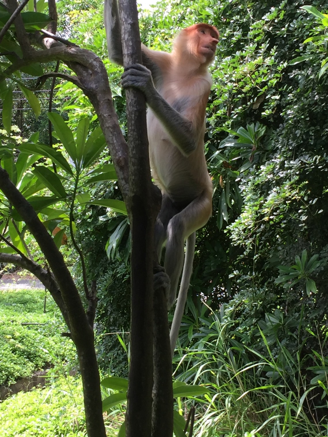 Heute morgen bin ich zum ersten Highlight hier gestartet. Das Labuk Bay Proboscis Monkey Sanctuary. In diesem kleinen Reservat leben Nasenaffen. Die Nasenaffen gibt es nur noch auf Borneo. Diese Gruppe dort hatte Glück im Unglück. Der Besitzer der umliegenden Palmölplantage hat ihnen ein Stück Mangrovenwald gelassen und so haben sie überlebt. Allerdings ist das Waldstück zu klein um alle dort lebenden Nasenaffen zu ernähren. Deshalb werden sie täglich mit Obst und ungezuckerten Pancakes gefüttert. Eigentlich ernähren sie sich von Blättern. Sie sind Wiederkäuer und haben mehrere Mägen. So wie Kühe. Das ermöglicht ihnen die teilweise giftigen Blätter zu verdauen. Daher kommt aber auch ihr dicker runder Bauch 🙂 Die Nasenaffen sind endemisch, das bedeutet sie leben nur hier in Borneo. Deshalb ist es so wichtig ihren Lebensraum zu schützen und zu erhalten, da sie sonst aussterben werden. Ich bin also mit gemischten Gefühlen dort hingefahren, möchte aber auch unterstützen dass sie dort bleiben können. Jeden Morgen um halb zehn fährt ein Shuttlebus des Reservats vor dem Sandakan Hotel ab. Die Hinfahrt kostet 20 Ringgit, die Rückfahrt auch. Die Fahrt dauert ca 1 1/2 Stunden. Shuttlebus hält am Ticketstand an, man kauft dort das Ticket für 60 RM, zahlt den Shuttlebus und die Fotografiererlaubnis (10RM). Insgesamt kostet der Ausflug also 110 RM, was etwa 24 Euro sind. Dann steigt man wieder in den Bus, der weiter zur Platform B fährt wo um 11.30 Uhr die zweite Fütterung statt findet. Es gibt insgesamt 4 Fütterungen am Tag. Man kann auch früher mit dem Taxi dort hinfahren, um die erste Fütterung um 9.30 Uhr zu sehen. Allerdings gilt das Ticket nur für 2 Fütterungen. Was ich ehrlich gesagt seltsam finde. Naja, mit dem Shuttlebus sieht man die Fütterungen um 11.30 Uhr und 14.30 Uhr. Danach fährt er wieder zurück. Die Plattform B ist ein langes Holzhaus mit einer Terrasse am Ende. Dort sind im Garten zwischen den Bäumen die hohen Tische aufgestellt. Wir hatten Glück und haben am Eingang zur Terrasse sogar einen Hornvogel gesehen. Im Wald und im Garten saßen schon einige Nasenaffen und haben auf das Futter gewartet. Sie sind wirklich lustig und ihre Mimik ist der unseren so gleich. Ich hätte sie stundenlang anschauen können. Die langen Nasen haben übrigens nur die Männchen. Sie haben keine Funktion außer als Schönheitsmerkmal für die Weibchen. Wer die größte Nase hat bekommt die Weibchen 🙂 Die Nasenaffen leben in mehreren Gruppen. Der Herdenführer mit seinem Harem und die jungen Männchen in einer eigenen Gruppe. Die Jungen haben gespielt und die Weibchen haben auf ihre Babys aufgepasst. Der älteren Männchen haben gechillt. Es sieht so lustig aus wenn sie mit ihren langen dünnen Beinen im halben Schneidersitz auf einem Ast sitzen oder sich mit den Armen auf die Knie abstützen und ganz entspannt auf dem Boden sitzen. Einfach cool 🙂 Dann kam das Essen 🙂 Alle sind losgestürzt aber es gab kein Durcheinander oder Ärger. Das Essen war auf zwei Plattformen verteilt und so hat jeder etwas abbekommen. Danach haben alle auf dem Rasen gechillt oder gespielt. Herrlich! Das werde ich nie wieder vergessen.