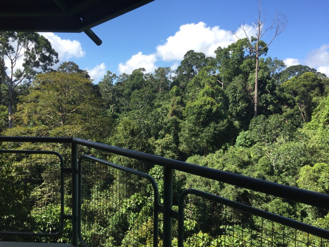 Das Gebiet liegt direkt im Regenwald und besteht aus einem Besucherzentrum mit vielen Informationen über Flora und Fauna, einem Botanischen Garten und verschieden Wanderwegen durch den Wald. Man kann dort alles und nichts sehen. Je nachdem wieviel Glück man hat. Es gibt dort verschiedene Affenarten, viele viele Vögel, Loris, Tasire, Schlangen, Spinnen usw… Also alles was der Regenwald so zu bieten hat. Ich bin extra früh aufgestanden und habe mich morgens auf den Weg gemacht. Es sind nur 10 Minuten zu Fuß. Der Eintritt kostet 15 RM was gerade mal 3 Euro sind. Ich habe mich entschieden, erst mal einige Wege und den Canopy Walk abzulaufen und mir mittags das Besucherzentrum anzuschauen. Ich war völlig alleine im Wald. Natur und Ruhe pur. Ein unglaubliches Erlebnis. So ursprünglich. Ich bin auf die Aussichtstürme gelaufen und habe dort 40 Meter über dem Boden auf die riesigen Bäume geschaut und die Vögel beobachtet. Von allen Seiten her hat es gepiept und gezirpt. Wie eine Urwald Einschlaf Musik nur in echt 🙂 Dort saß ich sehr lange und habe einfach die großartige Natur genossen.