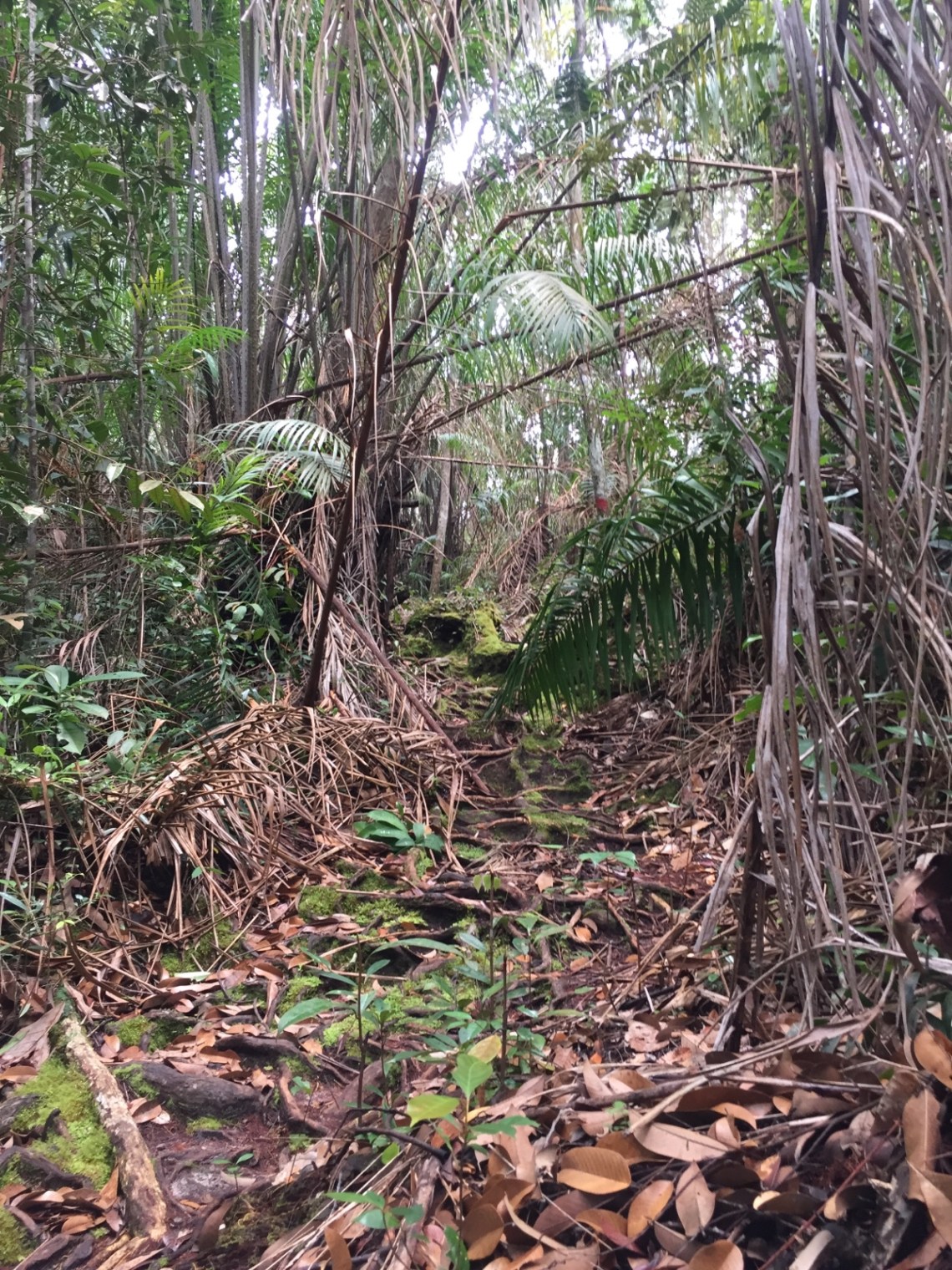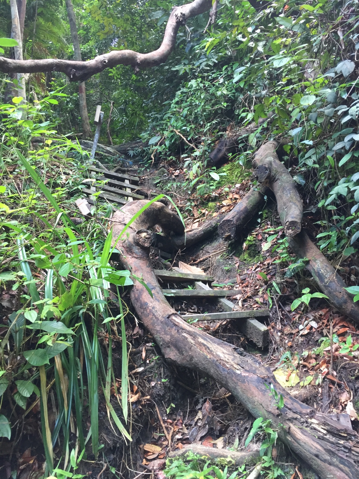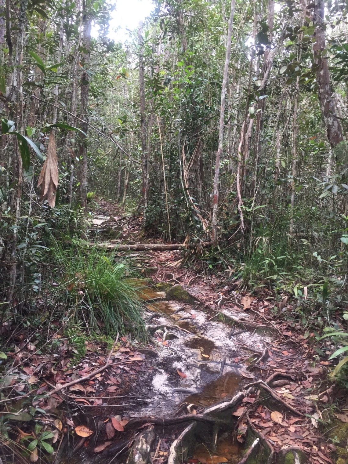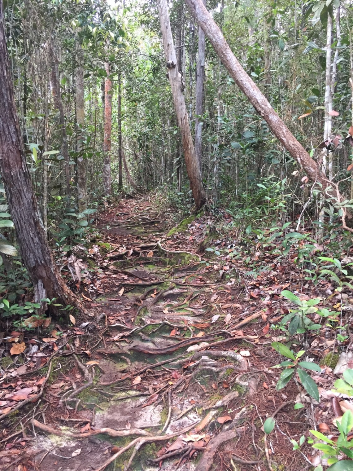 Am nächsten Morgen haben wir uns den großen Rundweg ausgesucht. Der Lintang Trail. 5,8 Km durch den Wald. Angeblich schafft man das in 3,5 Stunden 🙂 Wir haben 4 gebraucht. Der Rundweg ist großartig. Der Anfang ist ziemlich steil und man muss über Äste und Wurzeln nach oben klettern. Als wir oben angekommen waren waren die Bäume eher Sträucher und der Weg führte über große Steinflächen. Dann kam der wohl enttäuschendste Moment unseres Aufenthaltes… Ein Schild mit einer Streckenangabe. 500 Meter.. Wir haben erst gezweifelt ob das wirklich zu unserem Weg gehört. Aber ja wir waren in 40 Minuten genau 500 Meter weit gekommen. Und es lagen noch 5,3 km vor uns. Nach kurzer Motivationslosigkeit sind wir aber tapfer weiter gelaufen. Immerhin gingen die 500 Meter ja auch nach oben und wir sind mehr geklettert als gelaufen. Der weitere Weg war einfacher und hat uns durch verschiedene Vegetationen und Böden geführt. Große Steine, Flussbetten, Matsch, Kies, Moos, Äste usw. Also alle Vegetationen die man auf Borneo so finden kann. Es war schön anzusehen wie sich alle paar hundert Meter die Pflanzen und Bäume verändert haben. Ein wirklich toller Trekkingweg. Und die Schilder mit der Kilometerangabe kamen immer schneller und wir waren schnell bei 3 km. Er ging auf und ab und wir haben es genossen durch die Natur zu gehen. Ich habe jede Menge Kelchpflanzen fotografiert. Das sind die fleischfressenden Pflanzen. Das letzte Stück ging wieder sehr steil hinunter und wir mussten oft marode Holztreppen hinunter klettern. Am Ende waren wir erschöpft aber unglaublich glücklich dass wir es geschafft haben. Zur Belohnung gab es ein kaltes Bier 🙂