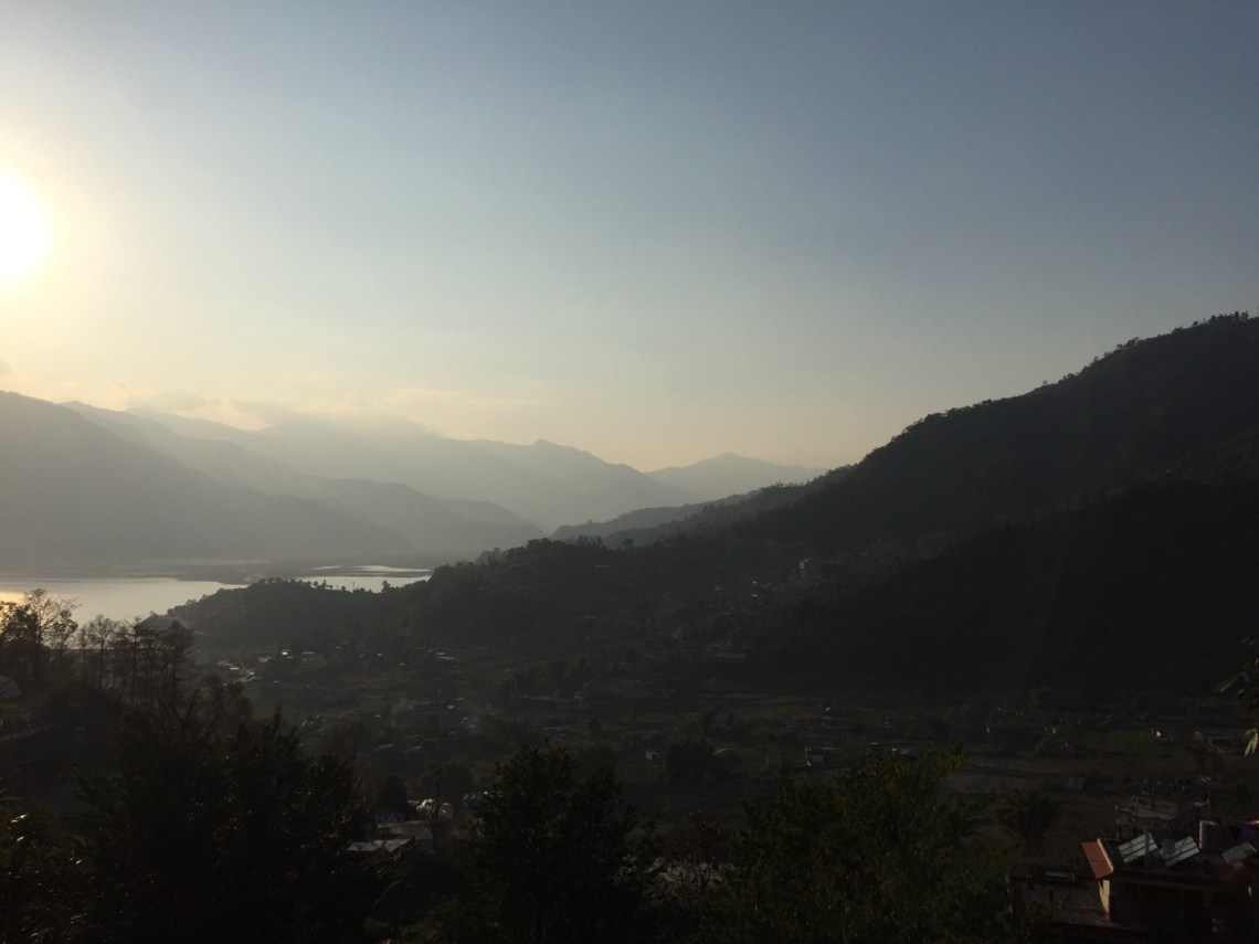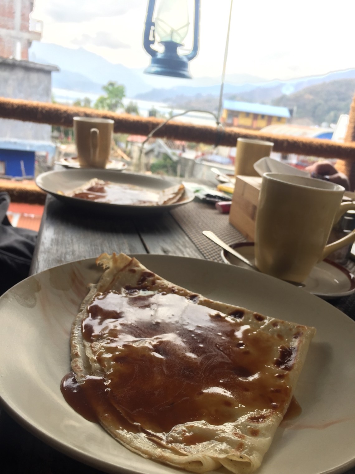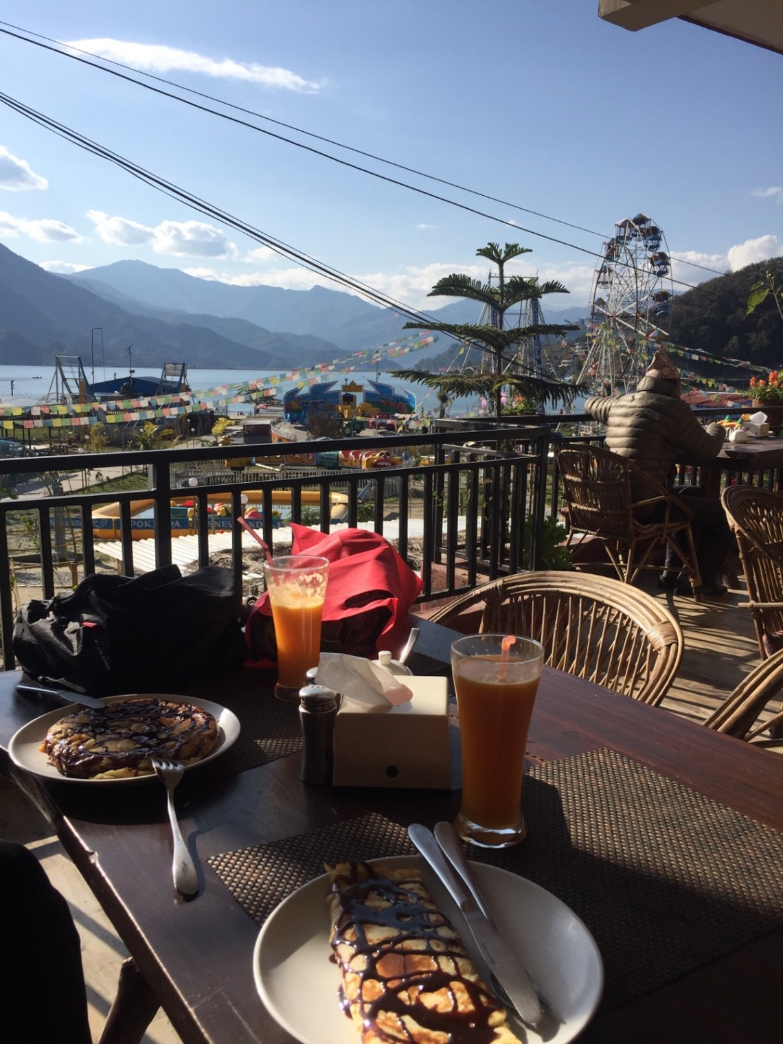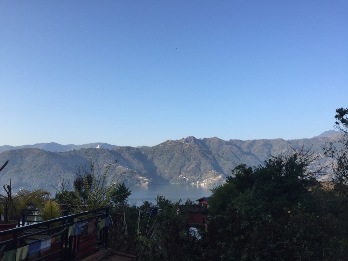 Nach dem Mittagessen hat man zwei Stunden Freizeit. Meistens habe ich gelesen und entspannt. Zweimal sind wir allerdings runter in Dorf gelaufen um Kaffee zu trinken und Schokoladenpancakes zu essen 🙂 Das gesunde vegetarische Essen war wirklich lecker aber manchmal wollten wir uns ein bisschen verwöhnen 🙂 Dafür muss man allerdings den Berg hinunter laufen bzw klettern. Je nachdem welchem Weg man nimmt. Runter dauert ca 10 Minuten, den kürzeren steileren Weg und hoch ca 20 Minuten. Also ich habe auf jeden Fall 20 Minuten gebraucht. Die Mädels die vorher zum Trekking im Himalaya waren, waren natürlich schneller 🙂 Aber was tut man nicht alles für einen leckeren Soja-Latte und Schoko-Pancake oder Salted-Caramel-Crêpes 🙂 Einmal bin ich mit Juliette, einer Französin, auf den Berg hinter dem Center gelaufen um die Aussicht zu genießen. Man muss ca 45 Minuten dem Berg hinauf laufen und kann dann über ganz Pokhara und den See schauen. Es war richtig anstrengend aber es hat sich gelohnt.