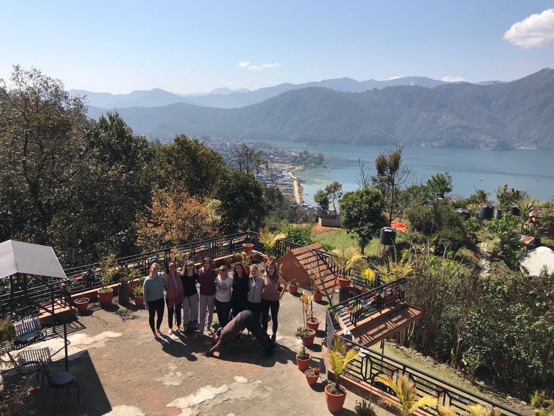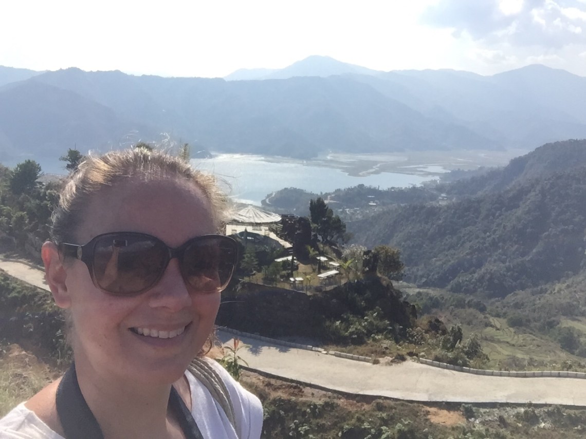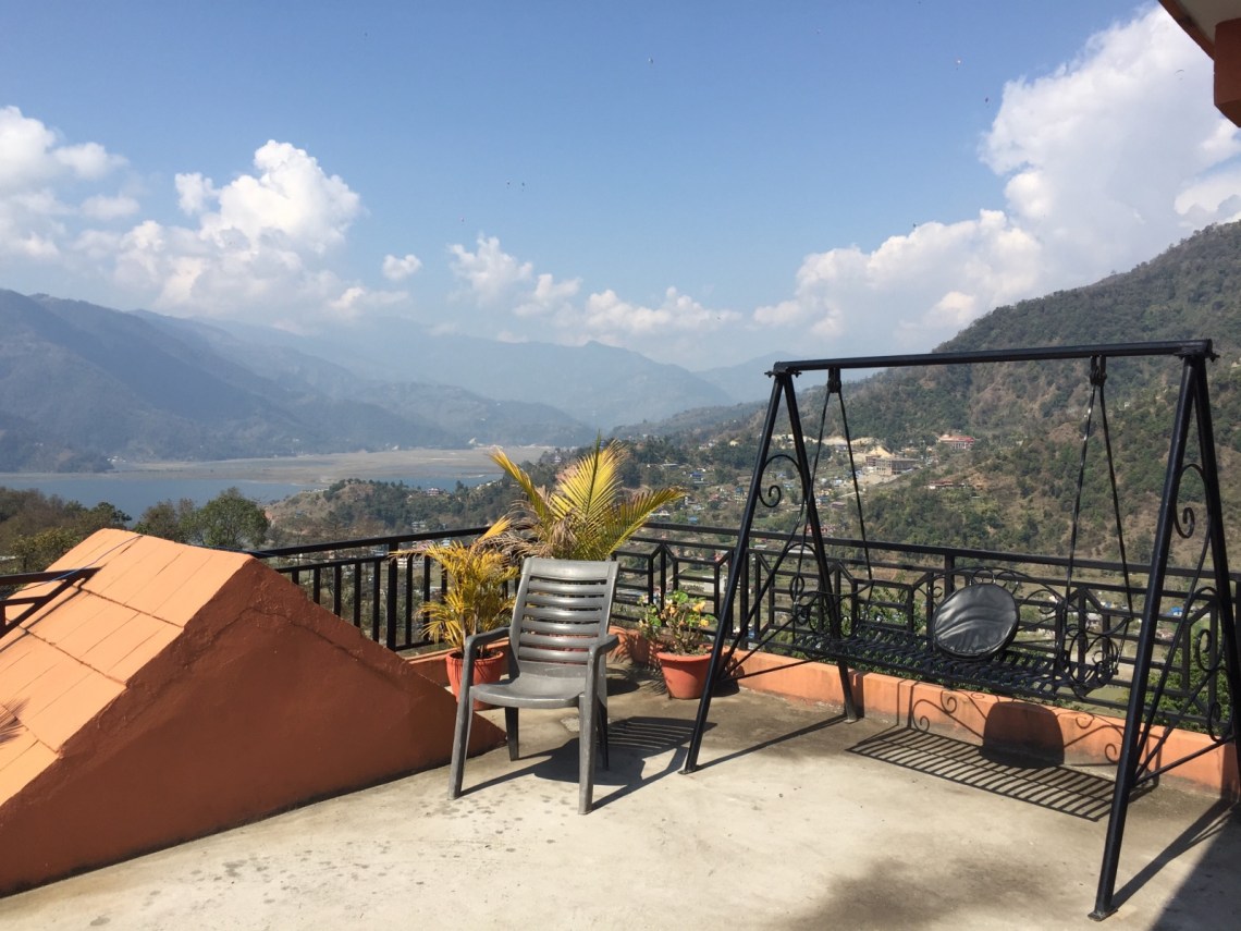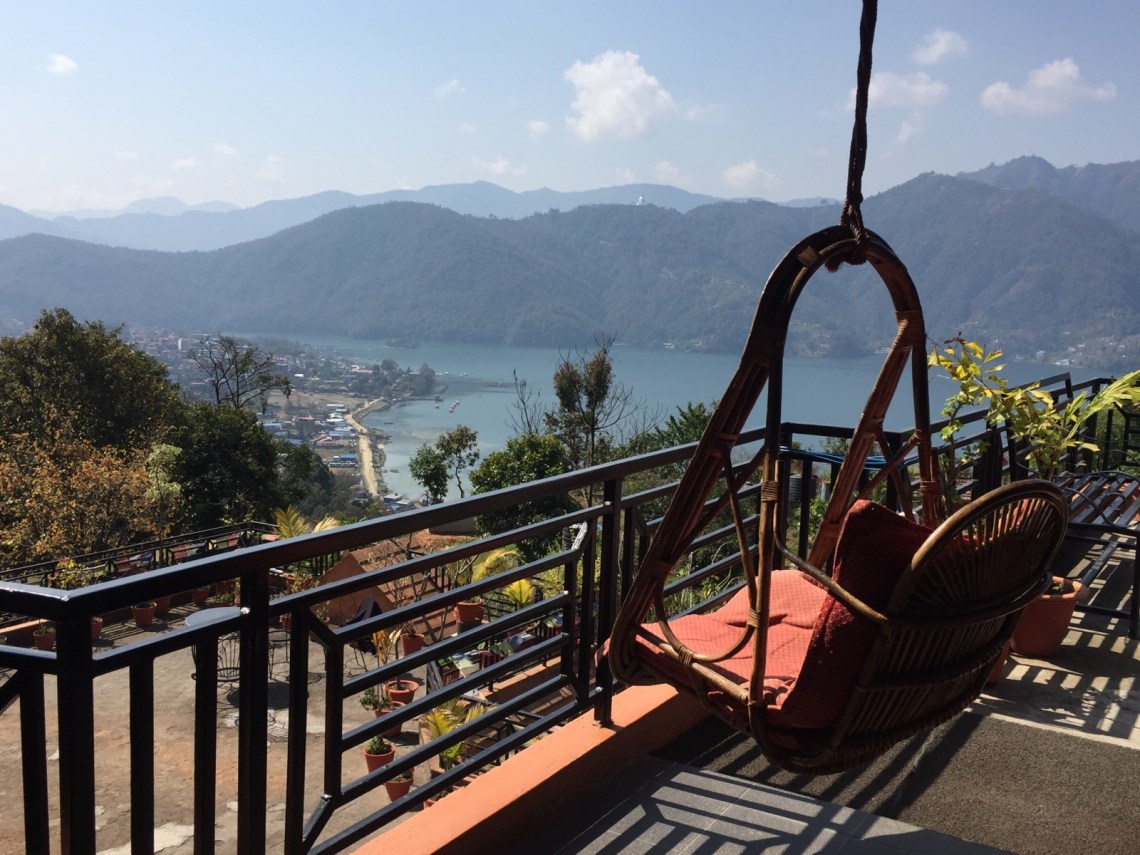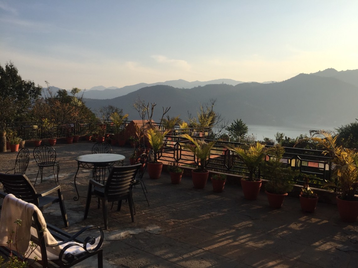 Nach dem Mittagessen hat man zwei Stunden Freizeit. Meistens habe ich gelesen und entspannt. Zweimal sind wir allerdings runter in Dorf gelaufen um Kaffee zu trinken und Schokoladenpancakes zu essen 🙂 Das gesunde vegetarische Essen war wirklich lecker aber manchmal wollten wir uns ein bisschen verwöhnen 🙂 Dafür muss man allerdings den Berg hinunter laufen bzw klettern. Je nachdem welchem Weg man nimmt. Runter dauert ca 10 Minuten, den kürzeren steileren Weg und hoch ca 20 Minuten. Also ich habe auf jeden Fall 20 Minuten gebraucht. Die Mädels die vorher zum Trekking im Himalaya waren, waren natürlich schneller 🙂 Aber was tut man nicht alles für einen leckeren Soja-Latte und Schoko-Pancake oder Salted-Caramel-Crêpes 🙂 Einmal bin ich mit Juliette, einer Französin, auf den Berg hinter dem Center gelaufen um die Aussicht zu genießen. Man muss ca 45 Minuten dem Berg hinauf laufen und kann dann über ganz Pokhara und den See schauen. Es war richtig anstrengend aber es hat sich gelohnt.