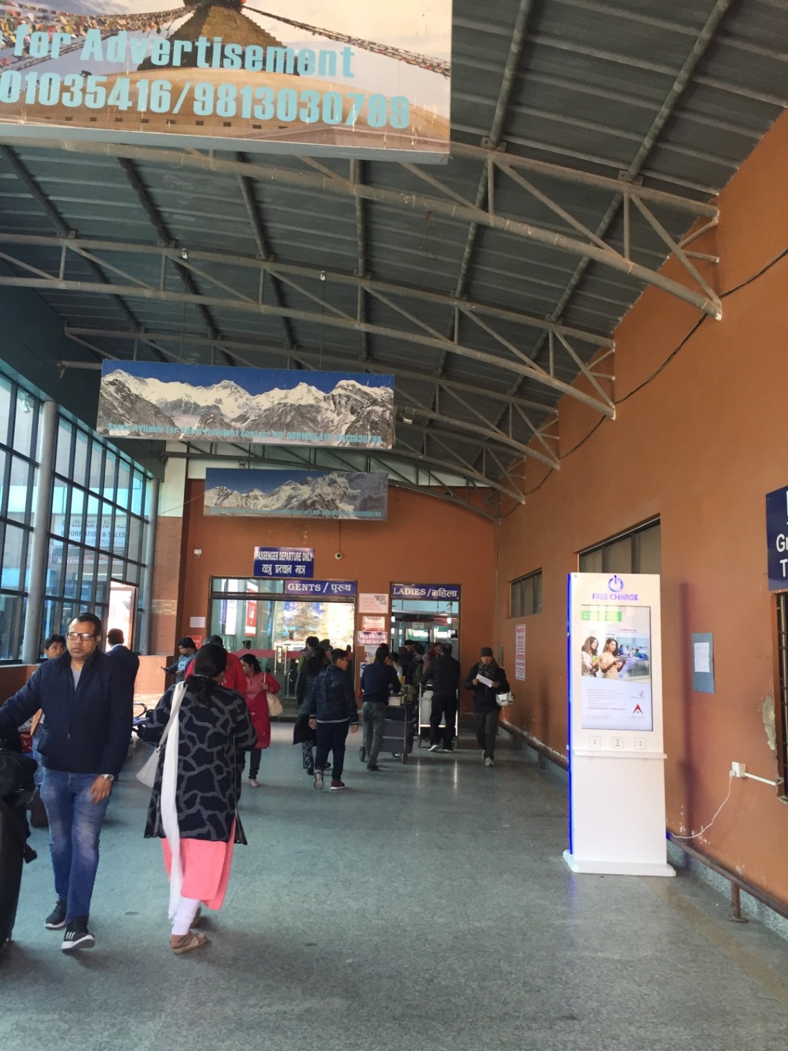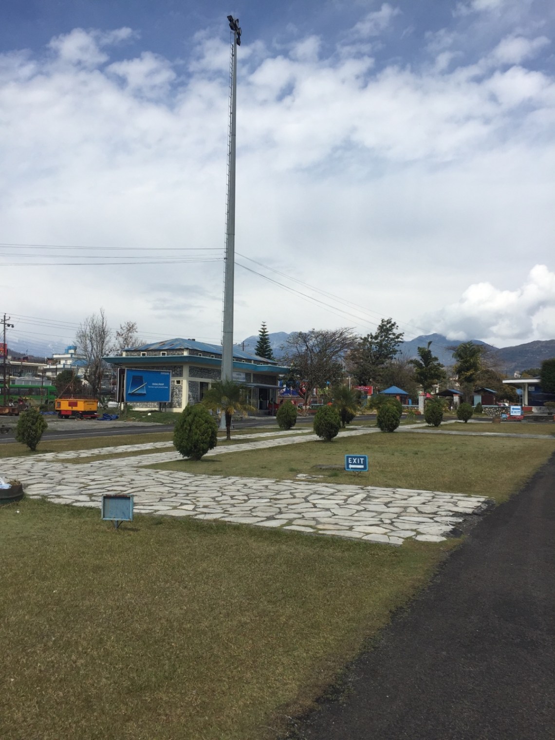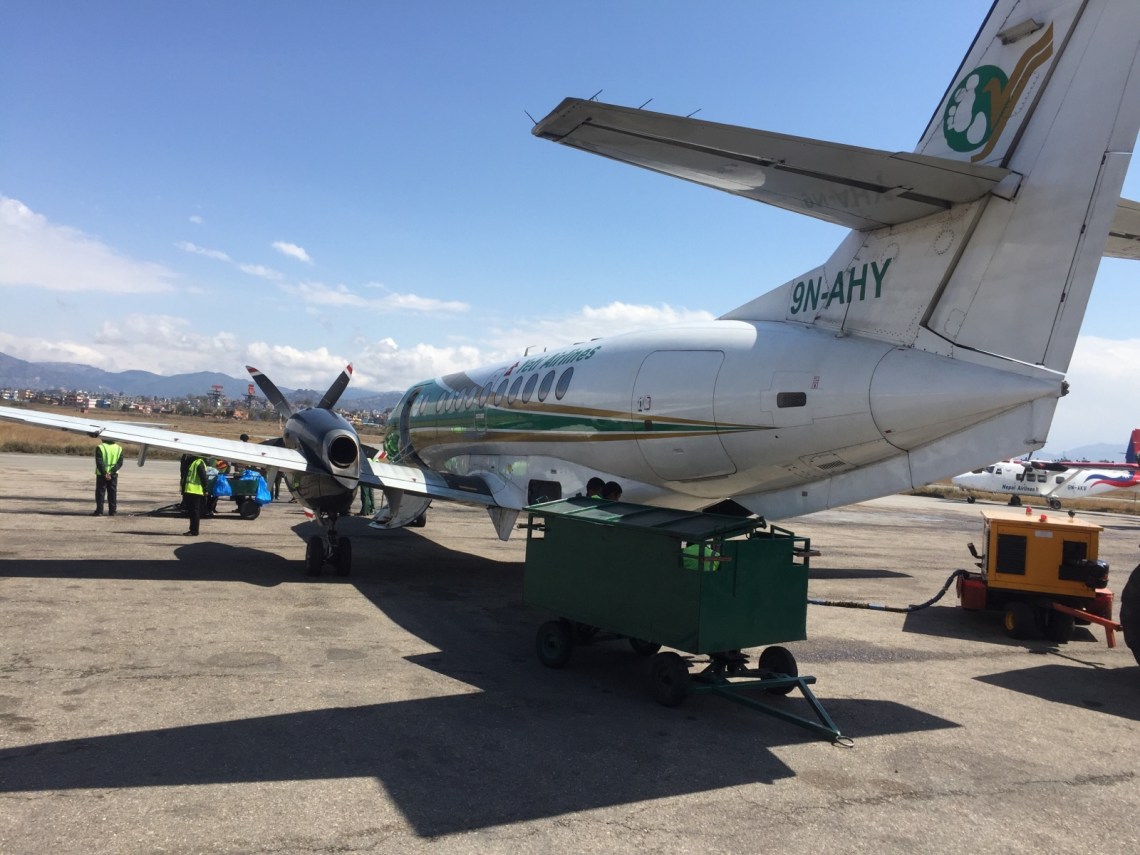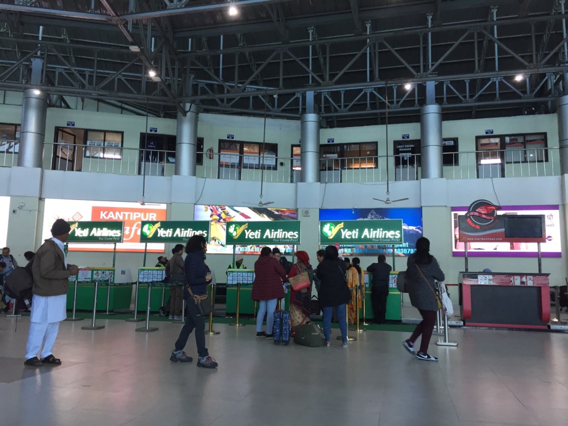 Die Anreise war auch abenteuerlich. Der Fahrer des Hotels hat mich zum nationalen Flughafen in Kathmandu gebracht. Es war eine kleine Halle die zwei Eingänge hatte, einen für Männer und einen für Frauen 🙂 Direkt hinter dem Eingang befinden sich die Schalter von Yeti Airlines. Dort hatte ich meinen Flug gebucht. Schalter ist übertrieben, es sind eher vier kleine Aufsteller und dahinter steht ein Schubkarren womit dann das Gepäck zum Flugzeug gebracht wird. Die Sitznummern werden nach der Reihe vergeben. Da ich früh da war hab ich die Nummer 1 direkt hinter dem Piloten bekommen 🙂 Leider auf der linken Seite, denn von rechts kann man den Himalaya sehen sofern es keine Wolken gibt. Ich wurde auf einen früheren Flug „umgebucht“ und durfte direkt zum Gate. Es gibt zwei Gates die nach Fluggesellschaften aufgeteilt sind. Mein Abflug hatte Verspätung somit war ich wieder bei der gleichen Abflugzeit wie für meinen ursprünglich gebuchten Flug.