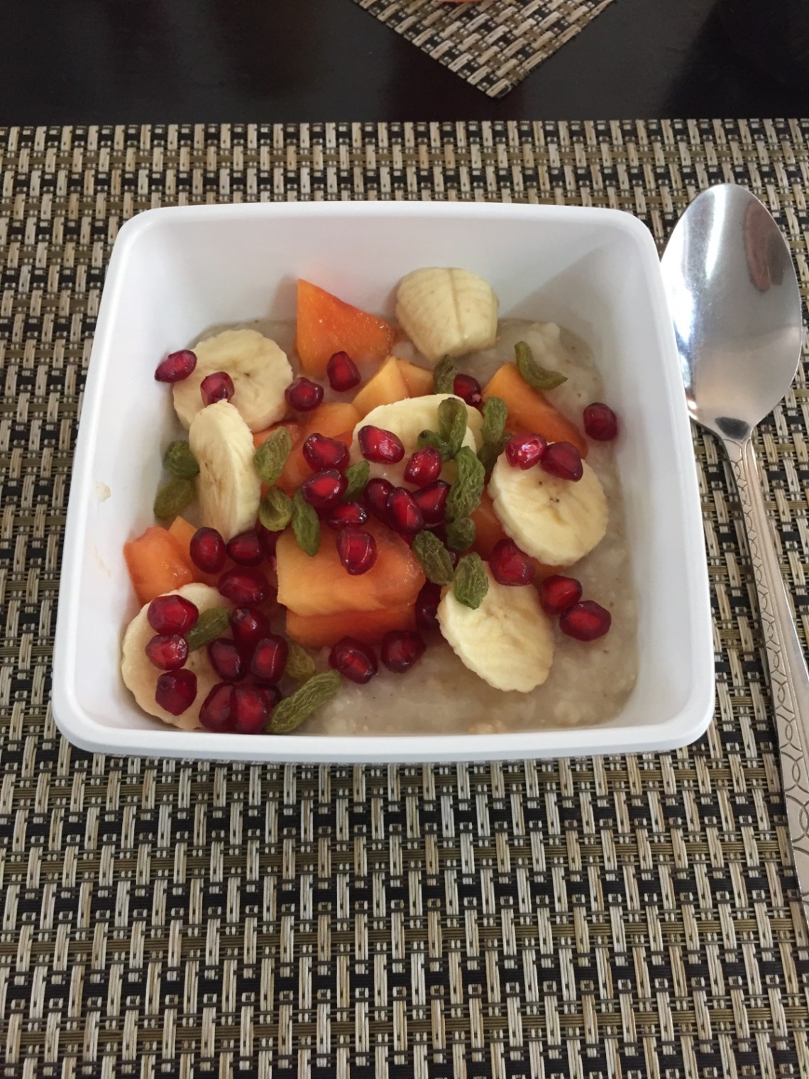 Meistens gibt es Porridge zum Frühstück oder Linsen oder Kichererbsen. Auf jeden Fall ist es immer sehr sehr lecker.