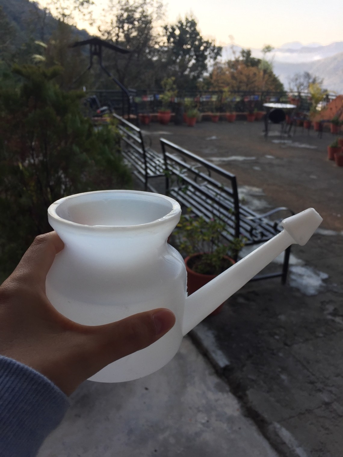 Nach der morgendlichen Meditation gibt es Tee und Bananen damit man gestärkt für die Yoga Session ist. Anschließend gehen alle auf die Terrasse und vollführen JalaNeti 🙂 Das ist eine Reinigung der Nase mit einer Salzwasserspülung. Also das was man auch zuhause machen soll wenn man erkältet ist. Es reinigt allerdings nicht nur die Nase sondern hilft auch bei Beschwerden wie Kopfschmerzen, Ohrenschmerzen, Augenproblemen und generell Problemen im Kopfbereich. Man setzt sich hin und lässt mit einer kleinen Kanne ca 1/2 Liter warmes Salzwasser abwechselnd durch das linke und rechte Nasenloch fließen. Am Anfang sehr ungewohnt aber dann spürt man wie gut es tut. Danach muss man verschiedene Übungen machen um die Nase zu trocken damit man sich nicht erkältet und Ohrenschmerzen bekommt.